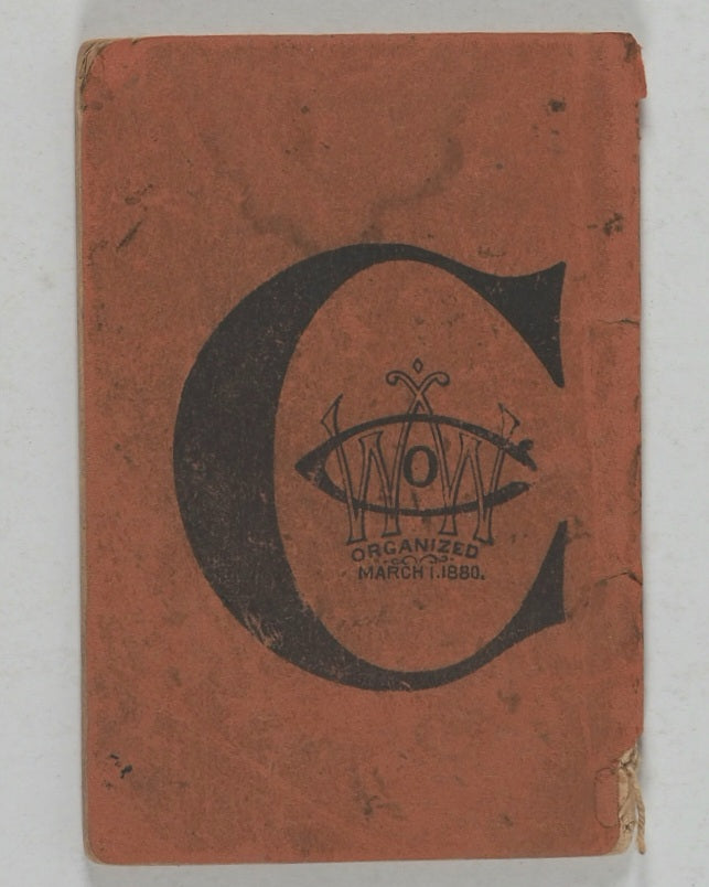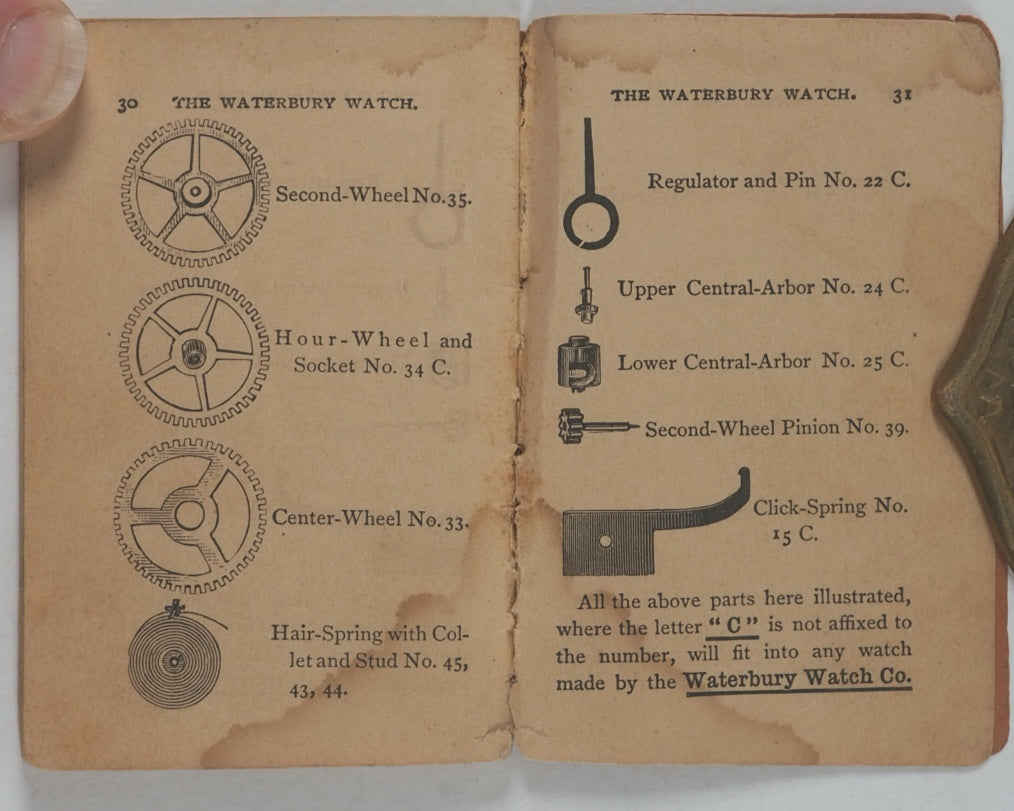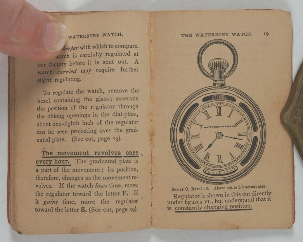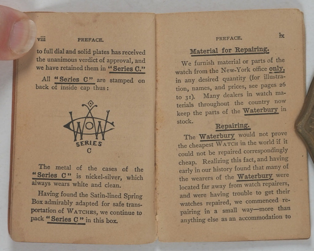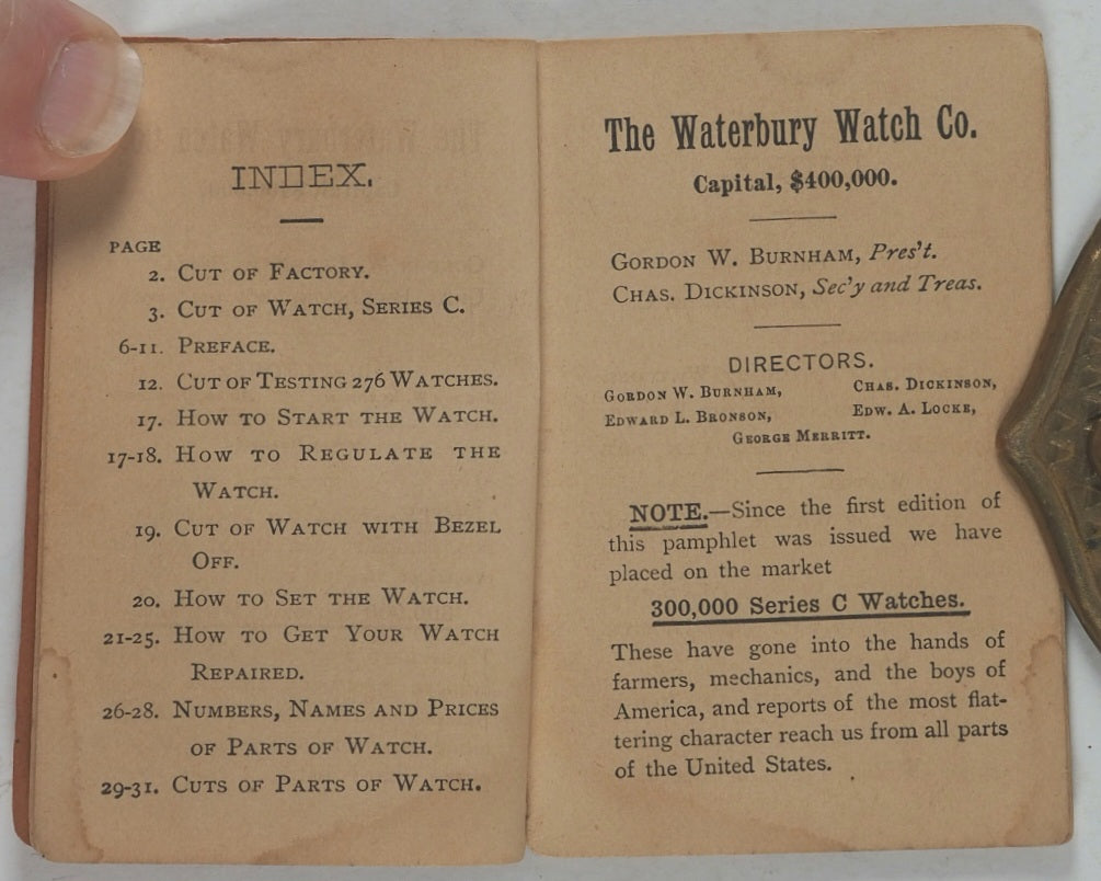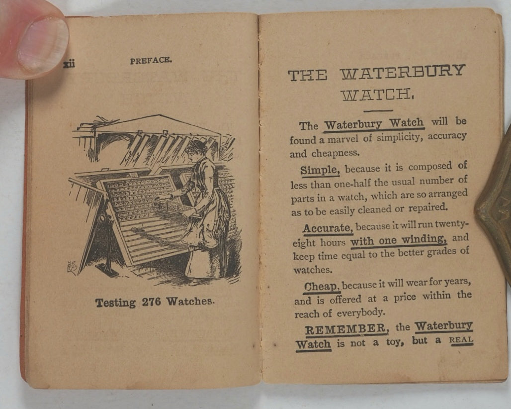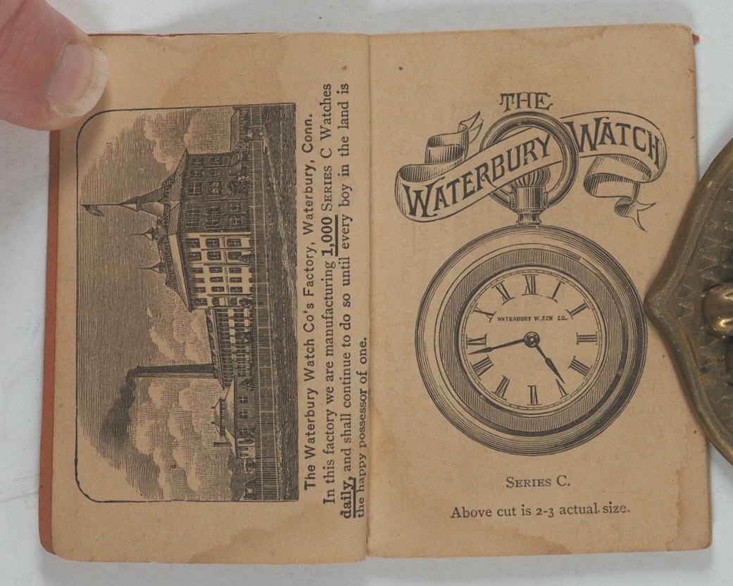 32 printed pages. Full-page woodcut engraving of the factory building 'manufacturing 1,000 Series C watches daily, and shall continue to do so until every boy in the land is the happy possessor of one'. Further woodcut engraved illustrations of pocket watches, watch parts and a factory scene. The Waterbury Watch company was established in 1880. Pages age-toned. Some corners creased. A few old water stains. 54 x 80 mm. Original original orange card covers. Stab sewn. Waterbury Watch Co. Logos printed on the front and back. Slightly stained on the back. Some mild wear, particularly to the bottom of the spine. WorldCat locates no copies worldwide.