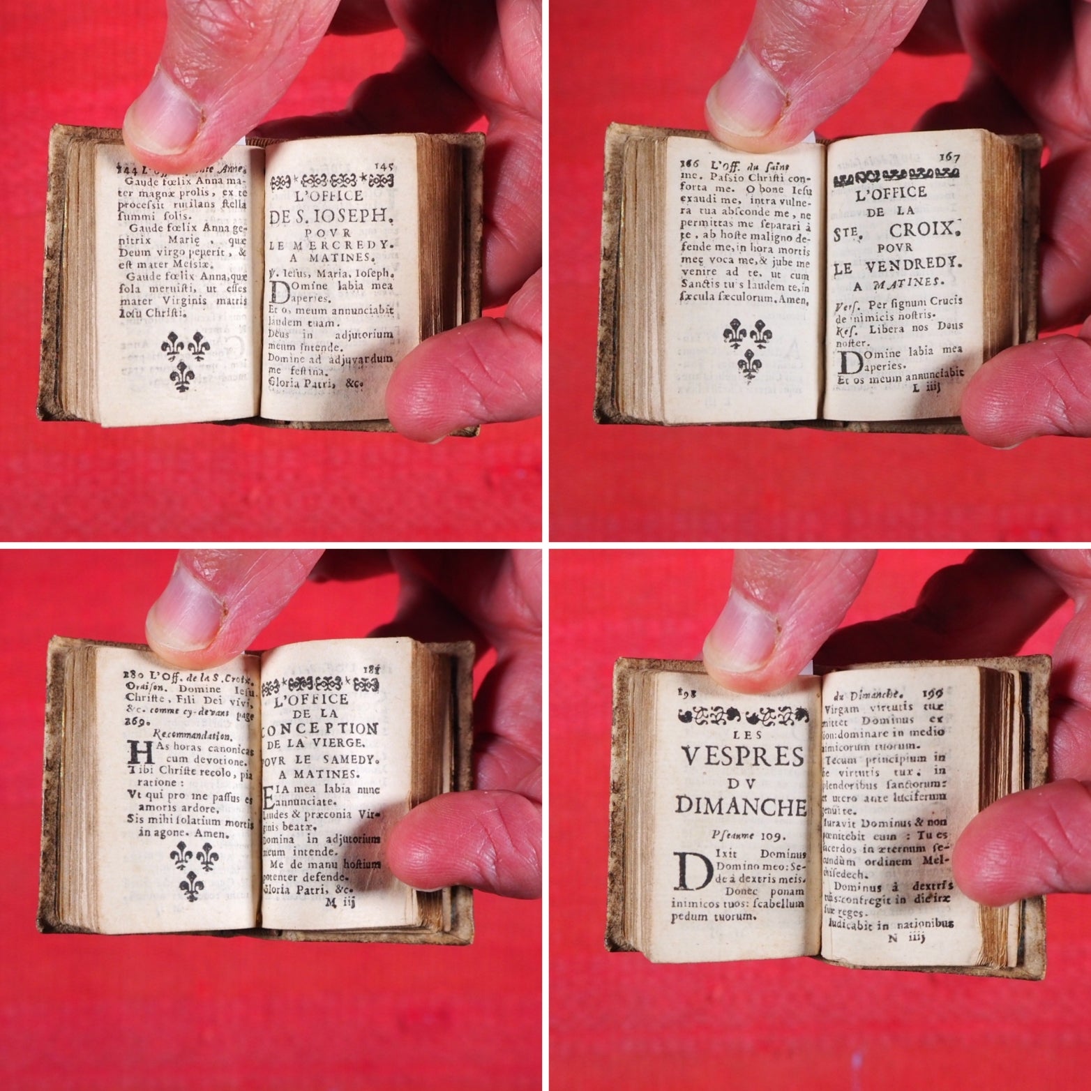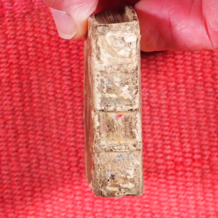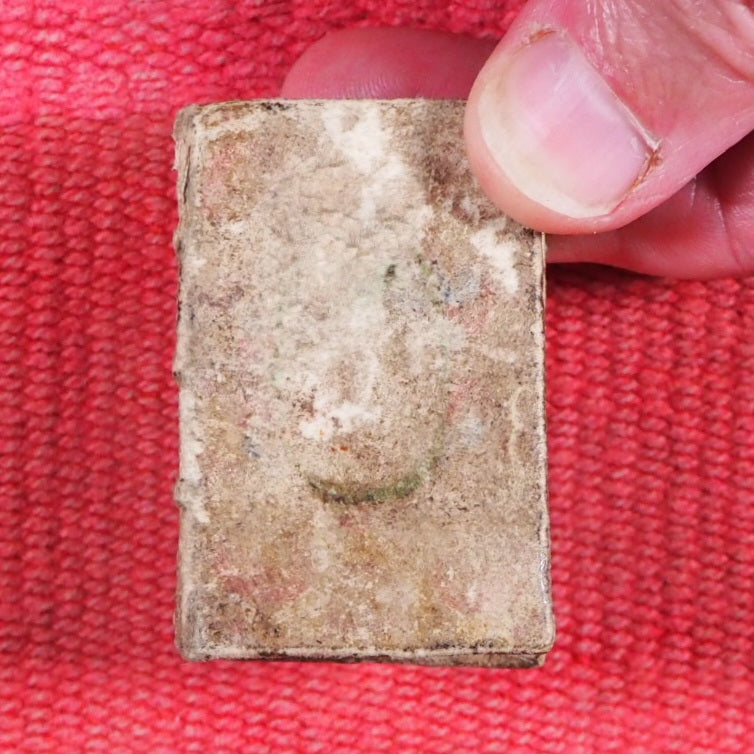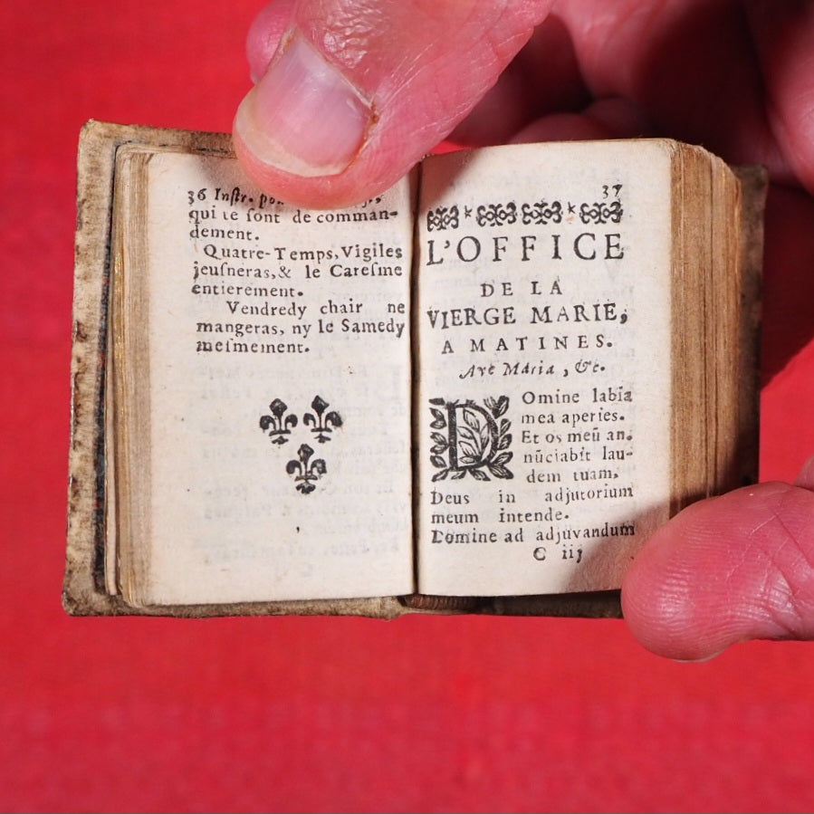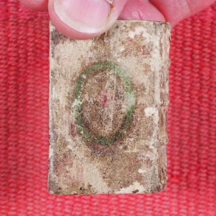 16mo. 256 printed pages in Latin and French. Fleur-de-Lys and scrolling foliate head and tail pieces. Two decorated initials, the rest capitalized. 18 lines to each page. 7 point (smallest readable size). Linen and cotton rag laid paper as used in the 17th century. Earliest Houghton Heures de Cour is from 1682. Welsh, 3440, lists the earliest known copy as 1678. The earliest in WorldCat is a single copy dated 1677 (University of Virginia). This unrecorded copy predates all editions I can find. Very few small spots of browning. Some corners slightly creased. Marbled endpapers. All edges gilt (rather worn away). Two near contemporary inscriptions on front paste-down & recto of blank preliminary facing page. Provenance: "M. St. H. H. [St. Helens or St. Helier family, possibly]" and "Samuel Salter [Master of Charterhouse, (1710-1778)], Alumnus Suttonianus Dono dedit Richardus Clarke eiusdem Scholae Alumnus 1729". A gift from Clarke to Salter, both men went to London Charterhouse (formerly owned by Thomas Sutton). For Salter's biography, see: https://en.wikisource.org/wiki/Dictionary_of_National_Biography,_1885-1900/Salter,_Samuel 32 x 53mm. Original cream sheepskin, with remnants of contemporary hand-painted decoration in green and red. Spine with three raised bands, a religious symbol in an oval border on front and back covers. Binding worn, leaving only fragmentary and feint decoration. Original headbands intact but binding as a whole rather sprung and resistant to being fully closed. Charles Coignard began a distinguished dynasty of booksellers and printers for the King and the Académie française in Paris. The preface to this book apologises for not being a grand edition but promotes its virtues as not only complete but also extremely small and portable. This is a Roman Catholic prayer, psalm and hymn book whereas Salter was Church of England. Not in Bondy, Spielmann nor Welsh. University of Virginia is the only library WorldCat locates this title and the copy cited is a later edition, OCLC, 310760906. WorldCat locates no copies worldwide of this earlier edition. Unrecorded, complete, in a contemporary binding and with a fine association and provenance, this beautiful & early miniature book is unique and sought after. Seller Inventory # 5409