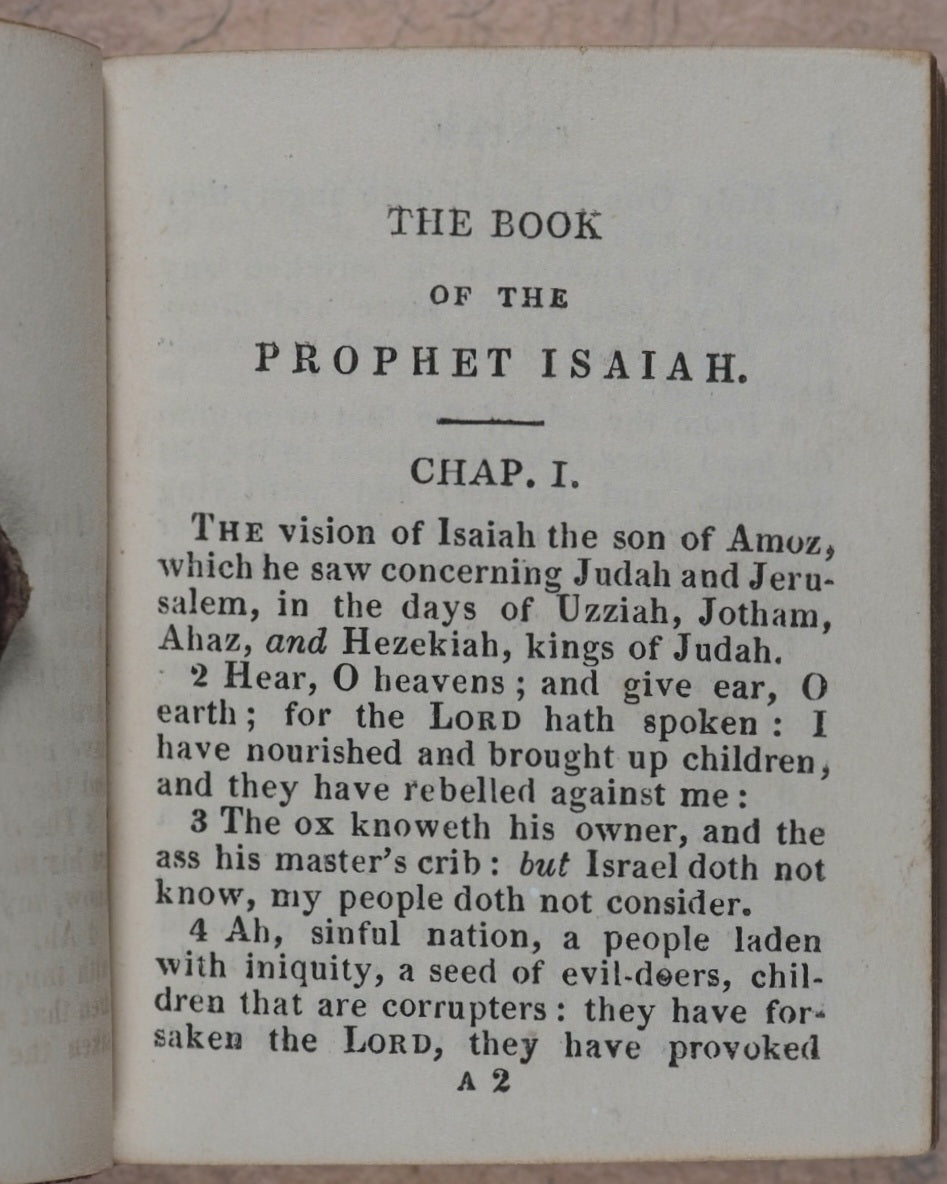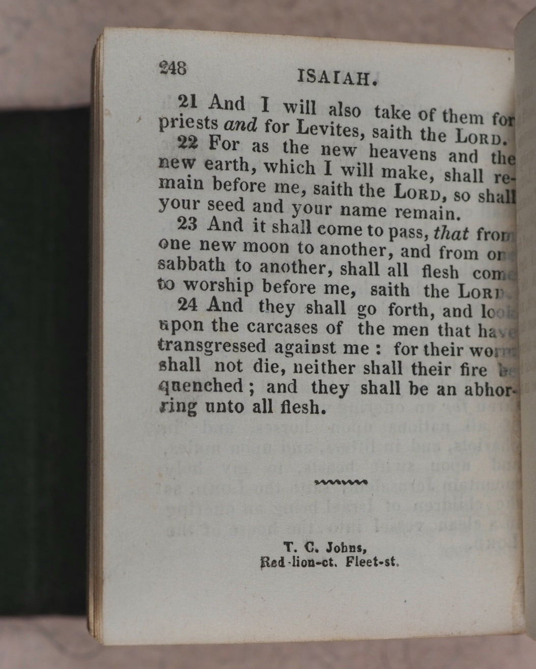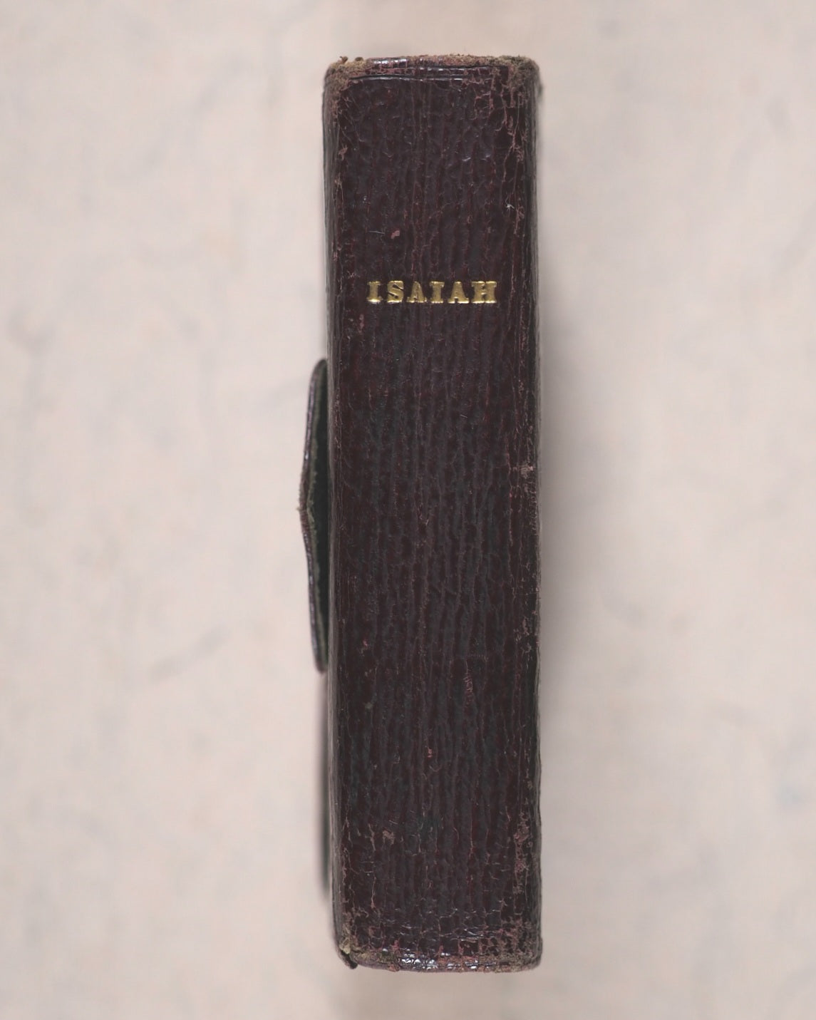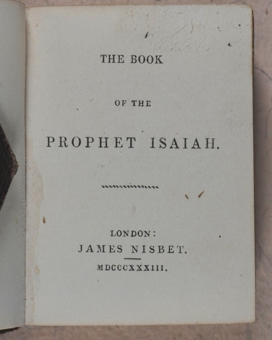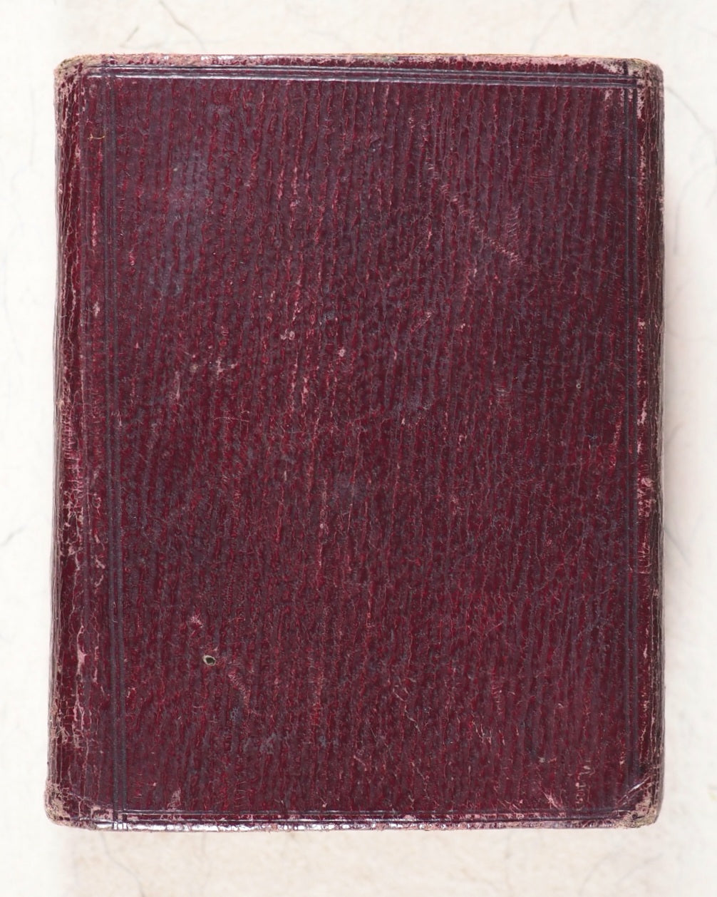 248 printed pages. Printed by T.C. Johns, Red Lion Ct., Fleet Street. Inner front hinge cracked but still holding firm. All edges gilt. Original salmon endpapers. Old ink inscription on front free endpaper. 52 x 66 mm. Original burgundy full wrap-over style straight-grained morocco binding with green inside flap, and gilt title on spine. See Welsh, 610 and 611 for 1833 and 1830 editions respectively. OCLC, 1035016298. WorldCat locates four copies worldwide (Pierpont Morgan, Virginia, Iowa and Washington St. Louis).