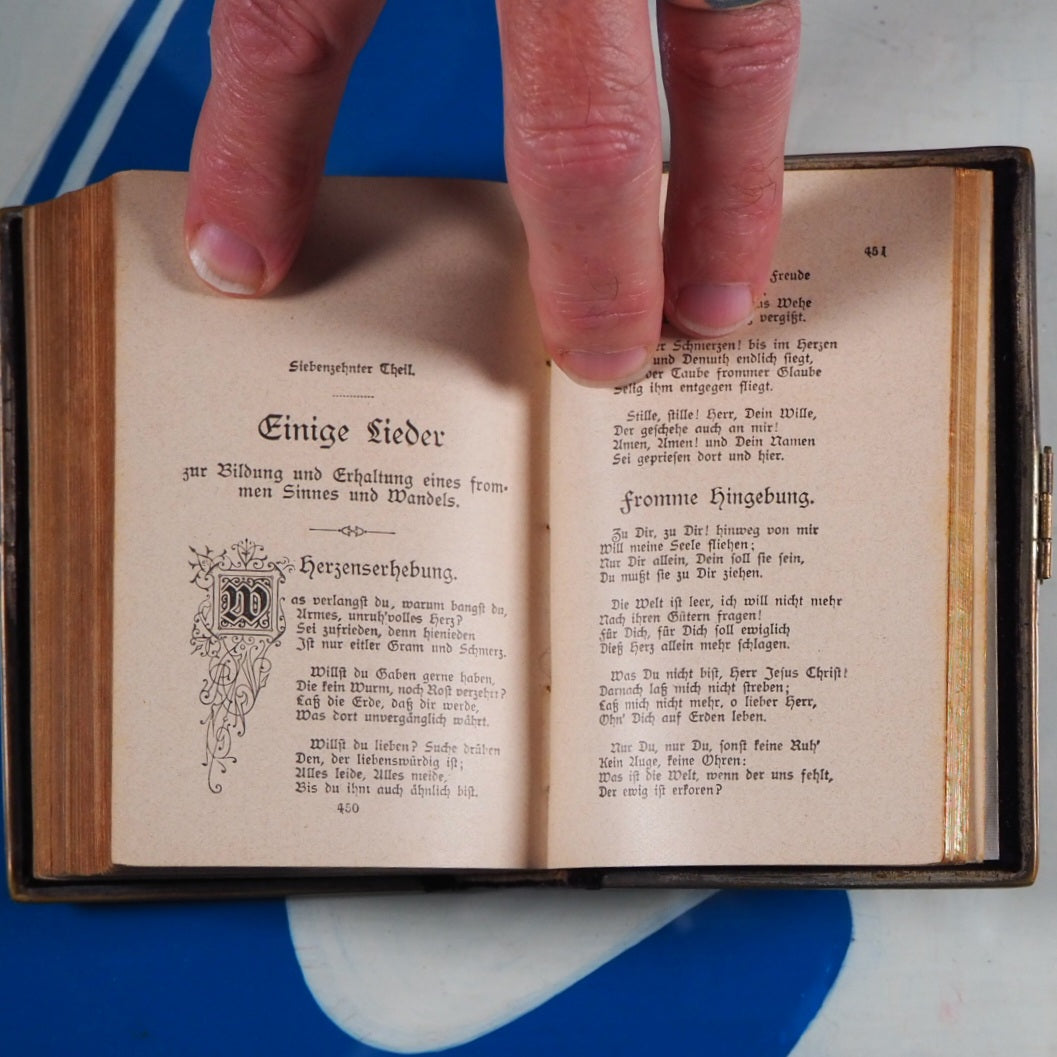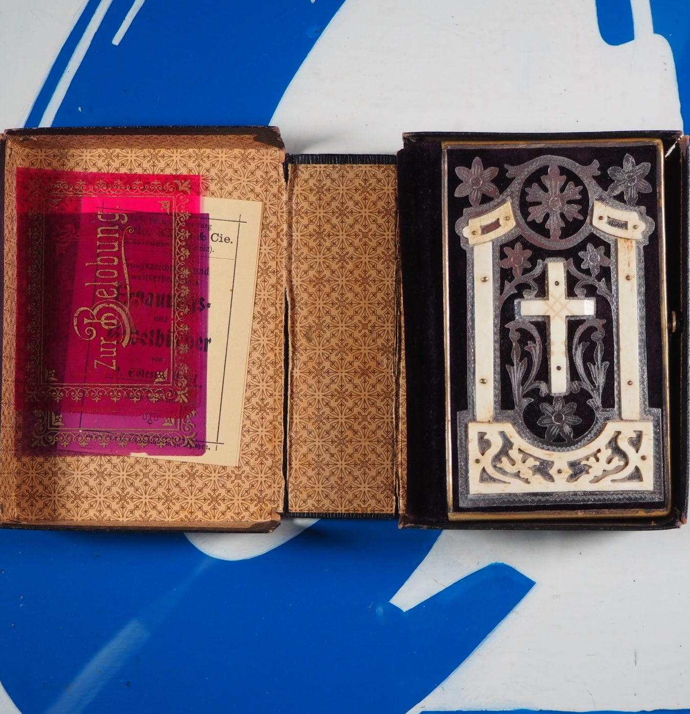 480 printed pages. Frontispiece. Black and white printed Gothic typescript in German. All edges gilt. From the contemporary loosely inserted printed slips, an engagement present ("zur Belobung" translates to on your engagement ). 82 x 120 mm. Splendid original purple velvet binding, with silver metal and bone mounts with brass pins of a central carved crucifix, with architectural abstract surrounds above a floral etched silver metal cut-out ground. Brass edges and brass floral clasp, with original embossed white endpapers. Preserved in original, decorative paper lined and black, 'engine-turned', embossed paper covered box (printed segensquelle 85a on the brown paper covered bottom edge). Loosely inserted is a contemporary publisher's folding advertisement for three other religious books. 19th century, near miniature, Swiss, devotional, Prayer book, in unusual Gothic binding. Seller Inventory # 5251