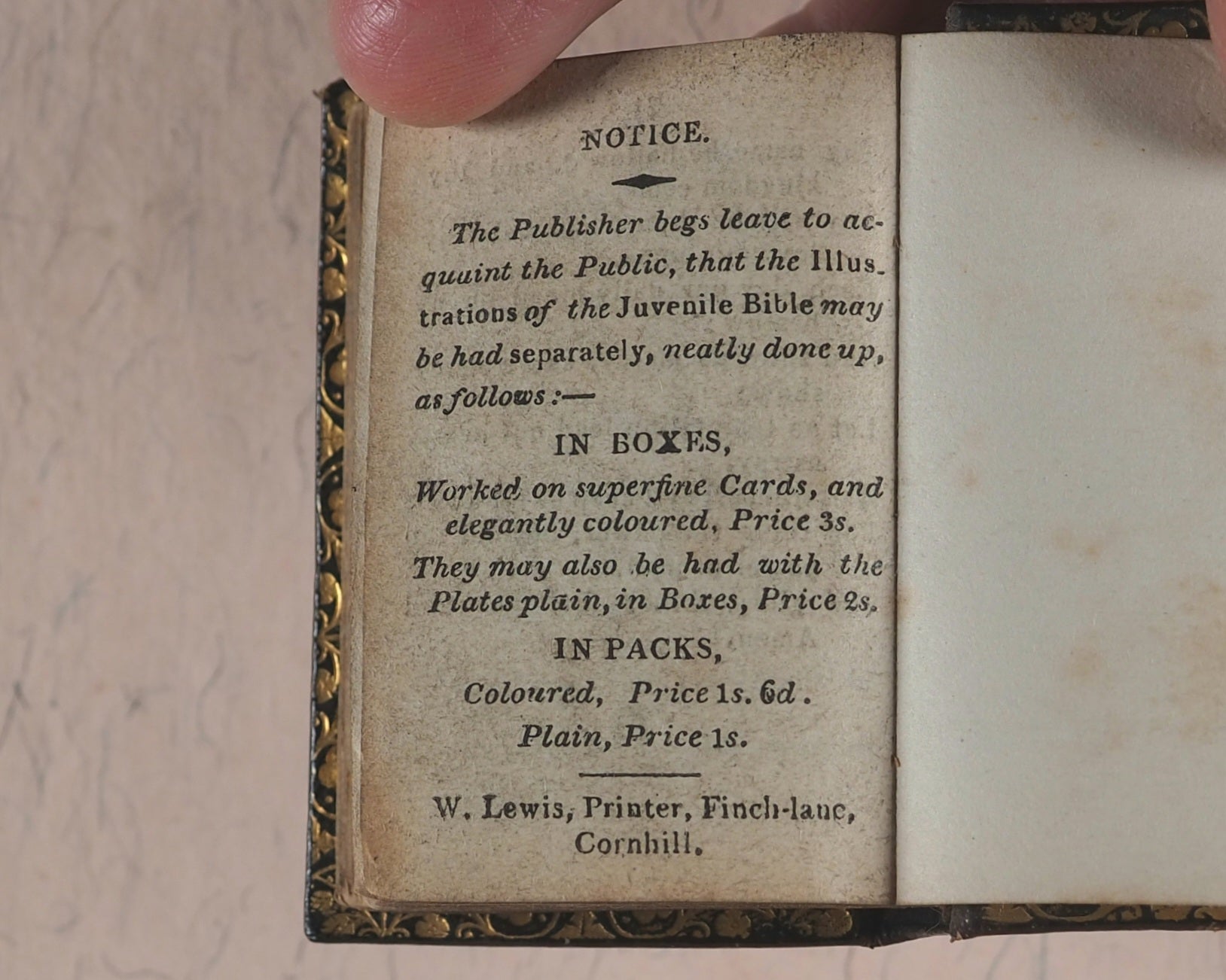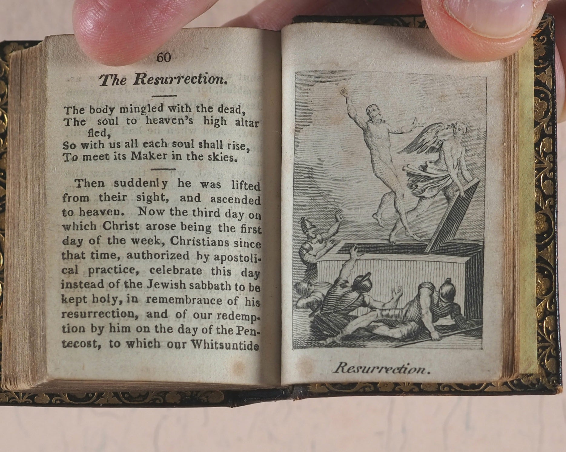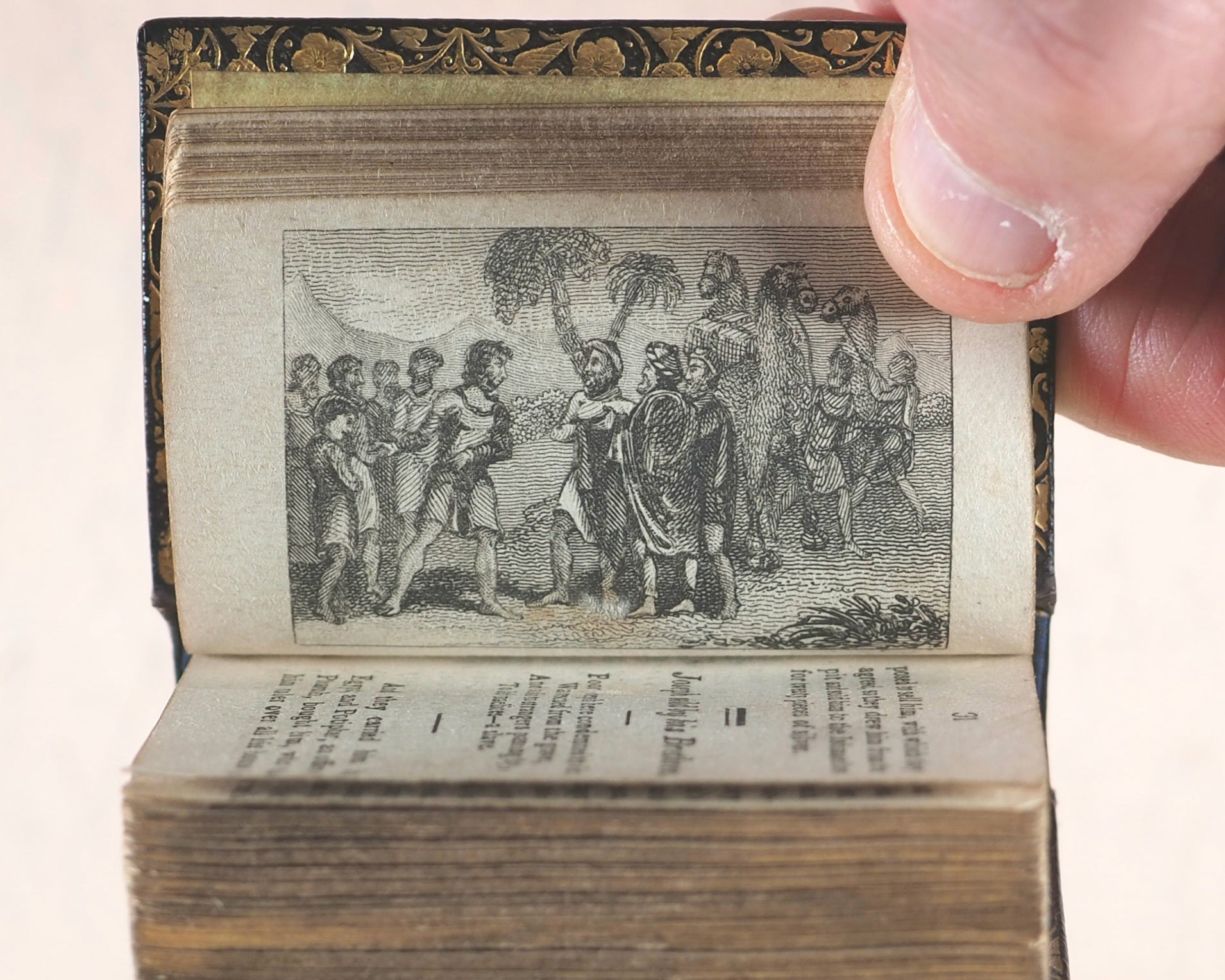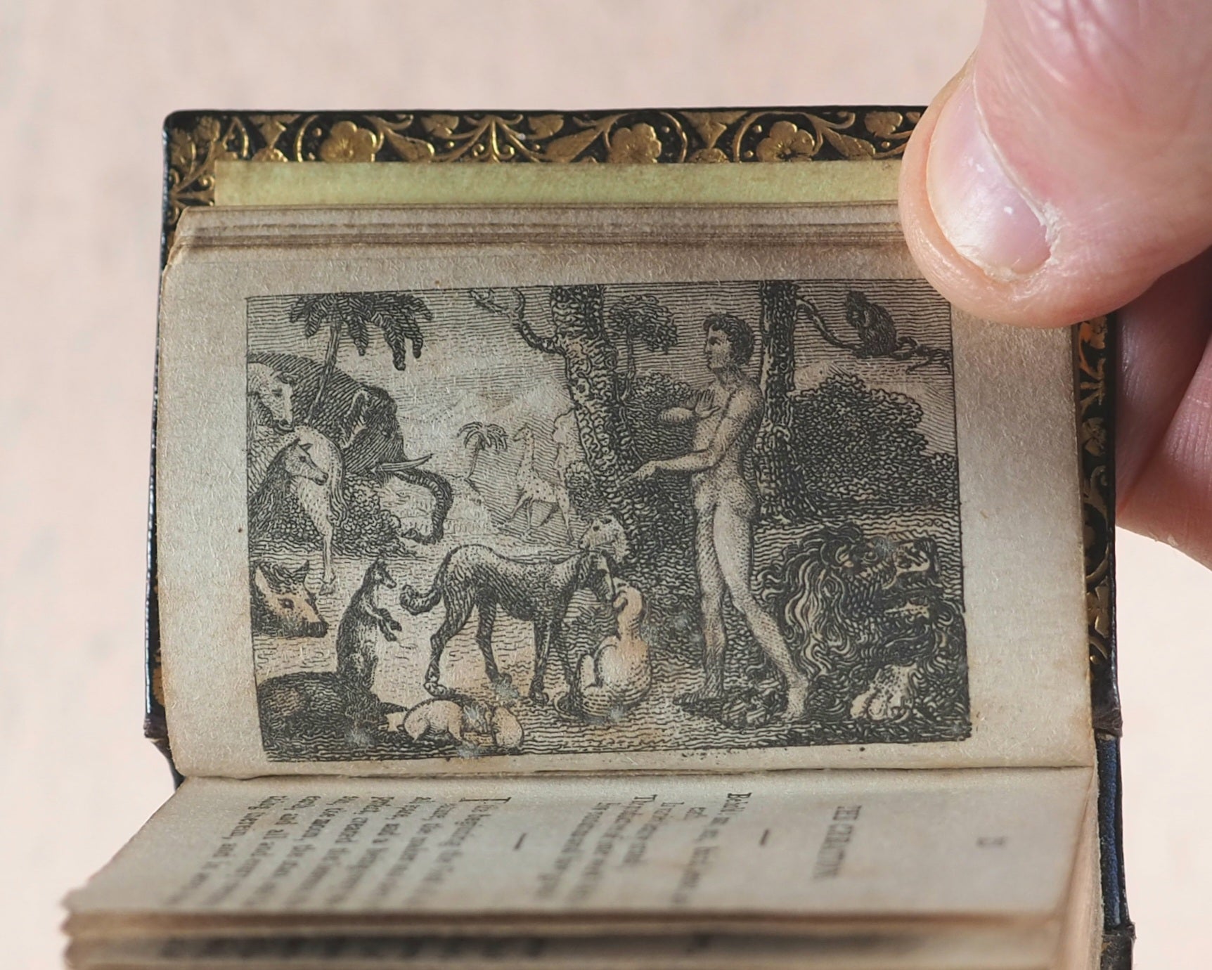 Two volumes in one. Complete. 144; 71 printed pages + 1 page of publisher's adverts at end (there were two versions and the issue point in this case: "In Boxes" and "In Packs" in larger upper-case type). 24 & 8 full-page copper plate engravings within square or rectangular frames, often depicting secondary aspects of biblical stories that are not found in any other Thumb Bibles. Separate title-page for New testament. Printed by W. Lewis, 21 Finch-lane, Cornhill. Date inferred from Bysh's adress (occupied from 1818 until 1821) and Lewis' address (1819 until 1838). Bondy described the 32 engraved plates as being "of considerable quality".  A very good complete copy of a rare miniature juvenile bible. Illustrations: The Creation -- Serpent tempting Eve -- Tower of Babel -- Joseph sold by his brothers -- Jacob and family's journey to Egypt -- Pharoah &c. drowned in the Red Sea -- Moses receiving the tables -- A cloud guides the Israeites -- The Sabbath breaker stoned -- Moses striking the rock ---- Balaam reproved by his ass -- Death of Moses -- Joshua commanding the Sun to stand still -- Samson's marriage feast -- Ruth gleaning -- David stayeth Abishai from killing Saul -- Uriah slain -- Sauls sons hanged -- David composing the Psalms -- Judgement of Solomon -- Building Solomon's Temple -- Elijah taken up to heaven -- God appearing to Solomon --Job's Misery --The Wise Men's Offering --Healing the Blind -- Going to Jerusalem -- Walking on the Sea -- Judas betraying Christ -- Peter denying Christ -- Crucifiction -- Resurrection. Frontispiece plate misbound opposite page 13. Some very light spotting sporadically and unobtrusive. Inner gilt dentelles. All edges gilt. Original yellow endpapers. 43 x 60 mm. Contemporary full maroon morocco; spine in compartments with four single blind ruled raised bands and gilt titling; covers with double blind ruled embossed borders. Minuscule rubbing to corners and head /tail of spine.  John Bysh specialised in publishing children's books, but not particularly on religion. The text is largely comparable to the 1806 Bible in Miniature published by  John Harris (Adomeit, B69); although a number of passages have here been creatively revised and expanded. For example, at the end of the New Testament, this publication adds the full text of the Apostolic Creed at the end, unlike any other Thumb Bible. Adomeit, B83 (locates 7 copies, of which 5 are defective). Gottfried Adam, 336. Bondy, 34-5. Not in Houghton, nor Spielmann. Welsh, 1021. OCLC, 63091760. WorldCat locates 5 copies worldwide of which at least three are defective (Virginia, Indiana, Washington St. Louis, San Diego & Nottingham University Libraries). Last copy of this publication was coloured and sold at Forum Auctions 25/03/2021 for £4,032.00. Otherwise, rare at auction, the previous  copy seemingly in 1981 as part of a lot of three miniature Bibles. Originally published in low numbers, this Thumb Bible is rarely found complete.