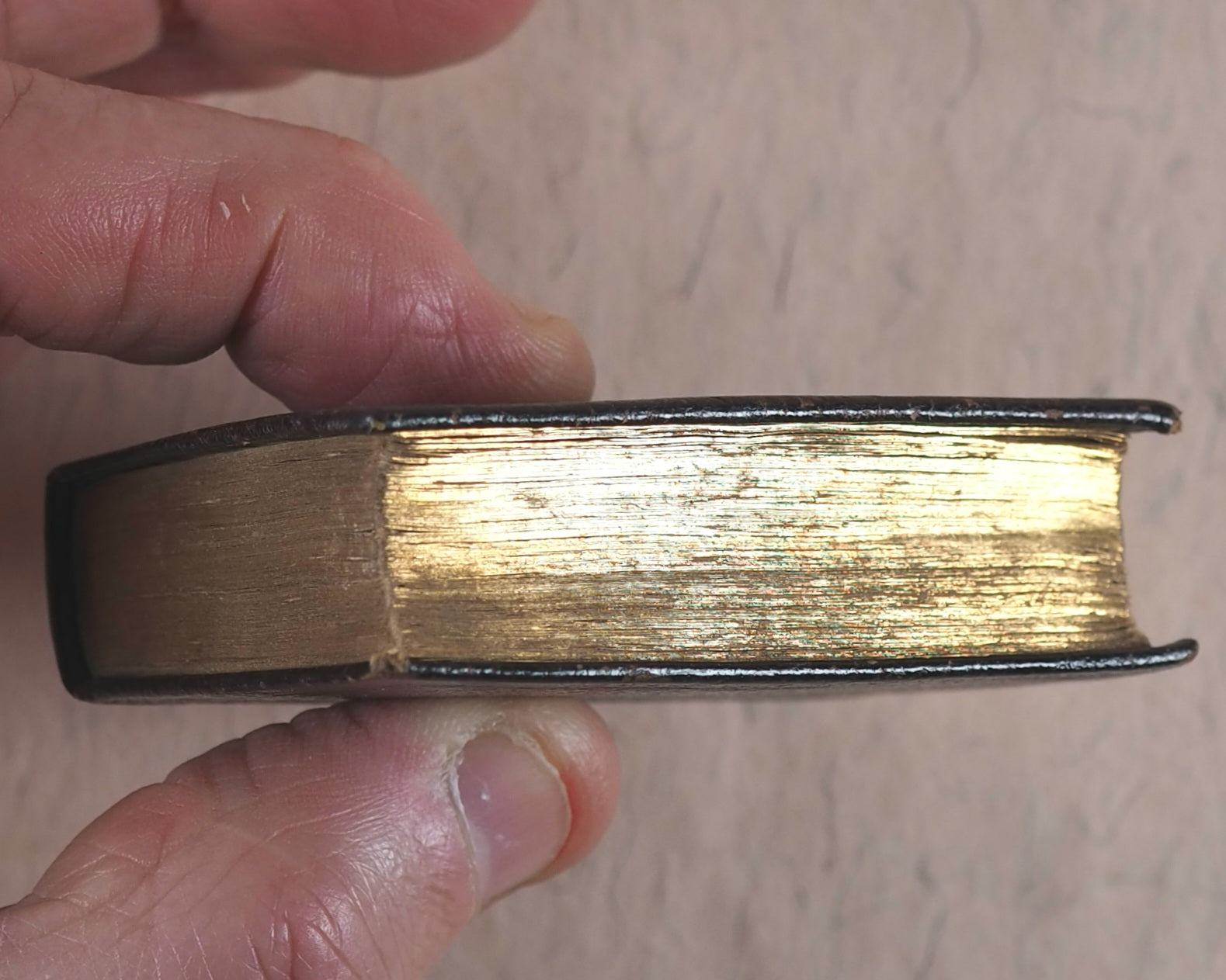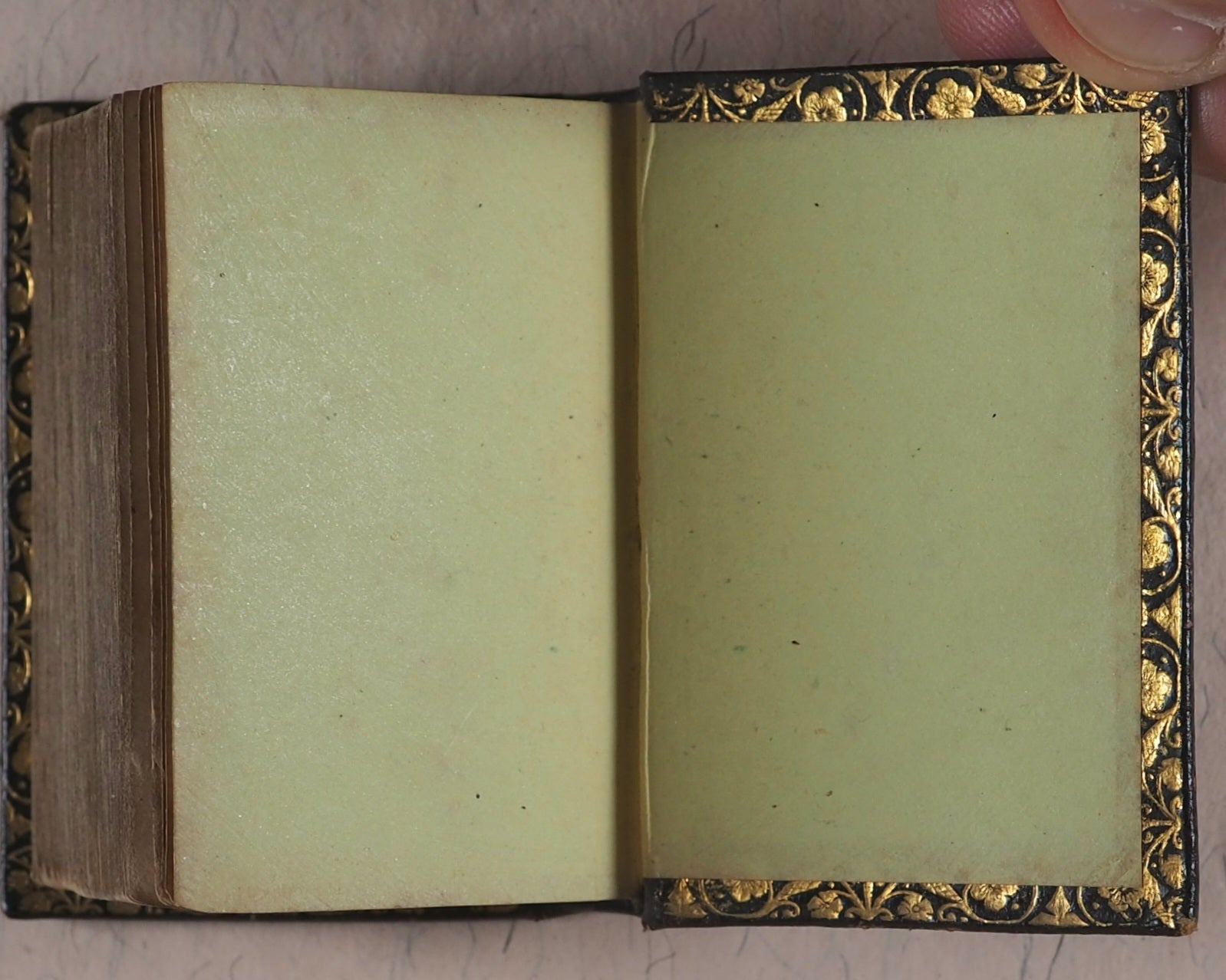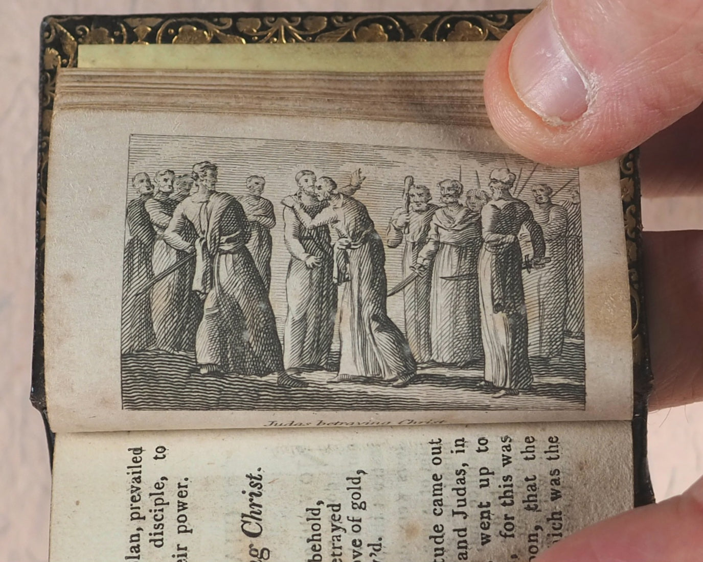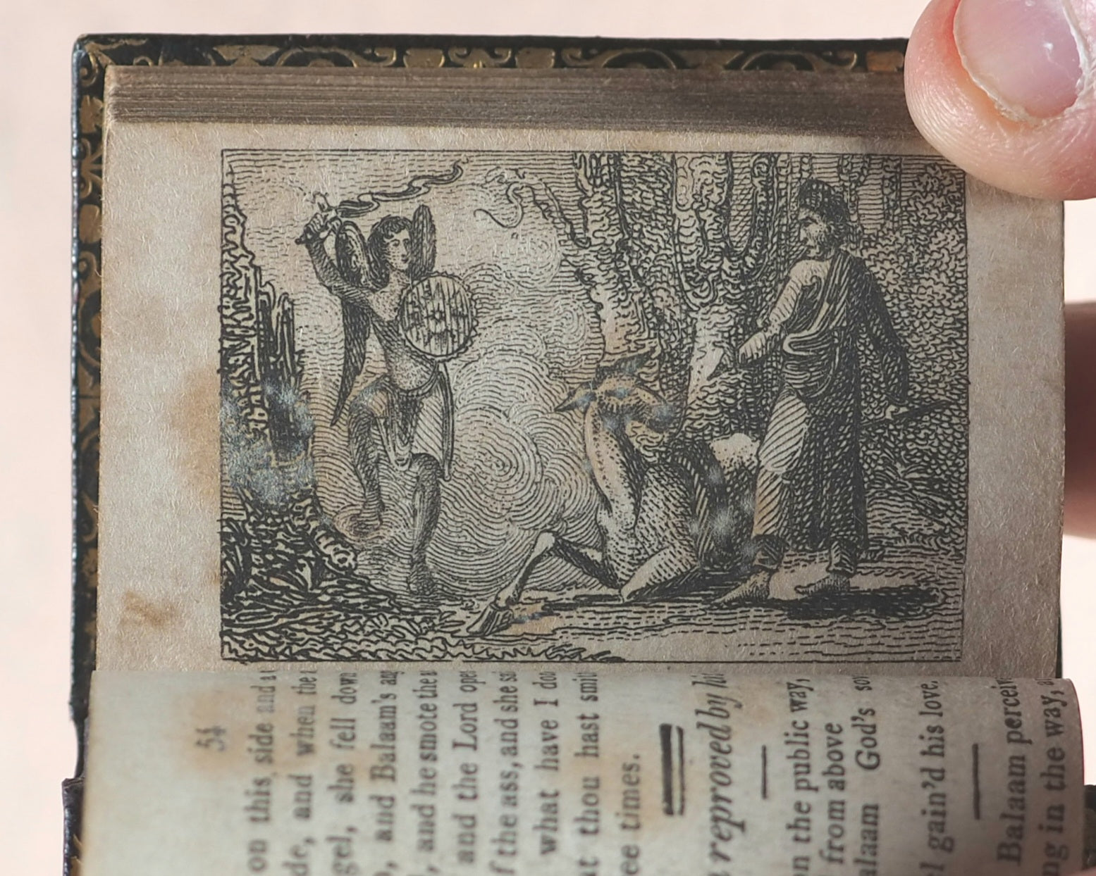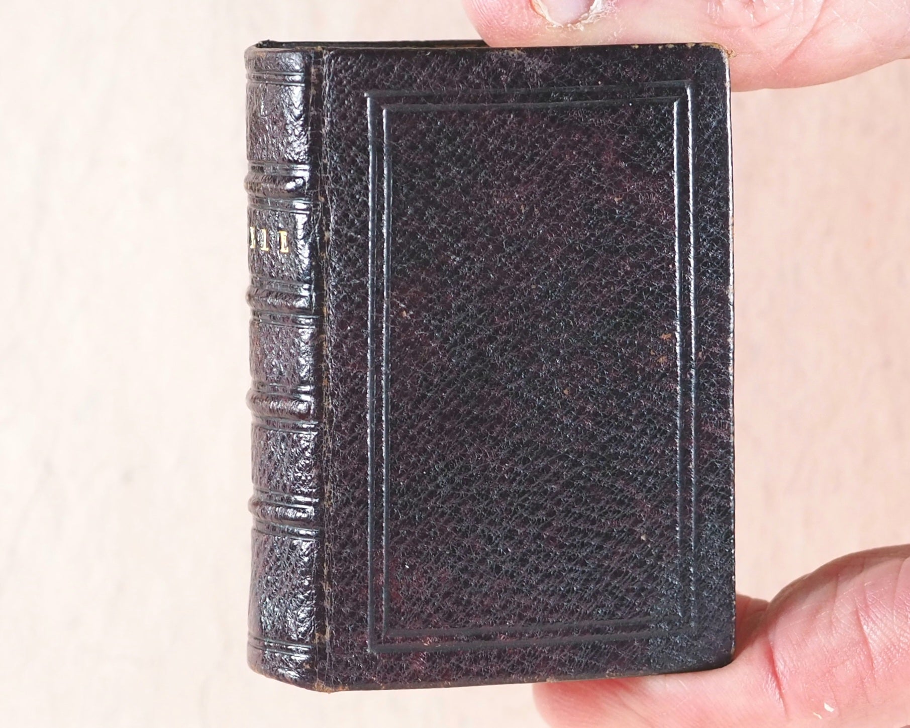Two volumes in one. Complete. 144; 71 printed pages + 1 page of publisher's adverts at end (there were two versions and the issue point in this case: "In Boxes" and "In Packs" in larger upper-case type). 24 & 8 full-page copper plate engravings within square or rectangular frames, often depicting secondary aspects of biblical stories that are not found in any other Thumb Bibles. Separate title-page for New testament. Printed by W. Lewis, 21 Finch-lane, Cornhill. Date inferred from Bysh's adress (occupied from 1818 until 1821) and Lewis' address (1819 until 1838). Bondy described the 32 engraved plates as being "of considerable quality".  A very good complete copy of a rare miniature juvenile bible. Illustrations: The Creation -- Serpent tempting Eve -- Tower of Babel -- Joseph sold by his brothers -- Jacob and family's journey to Egypt -- Pharoah &c. drowned in the Red Sea -- Moses receiving the tables -- A cloud guides the Israeites -- The Sabbath breaker stoned -- Moses striking the rock ---- Balaam reproved by his ass -- Death of Moses -- Joshua commanding the Sun to stand still -- Samson's marriage feast -- Ruth gleaning -- David stayeth Abishai from killing Saul -- Uriah slain -- Sauls sons hanged -- David composing the Psalms -- Judgement of Solomon -- Building Solomon's Temple -- Elijah taken up to heaven -- God appearing to Solomon --Job's Misery --The Wise Men's Offering --Healing the Blind -- Going to Jerusalem -- Walking on the Sea -- Judas betraying Christ -- Peter denying Christ -- Crucifiction -- Resurrection. Frontispiece plate misbound opposite page 13. Some very light spotting sporadically and unobtrusive. Inner gilt dentelles. All edges gilt. Original yellow endpapers. 43 x 60 mm. Contemporary full maroon morocco; spine in compartments with four single blind ruled raised bands and gilt titling; covers with double blind ruled embossed borders. Minuscule rubbing to corners and head /tail of spine.  John Bysh specialised in publishing children's books, but not particularly on religion. The text is largely comparable to the 1806 Bible in Miniature published by  John Harris (Adomeit, B69); although a number of passages have here been creatively revised and expanded. For example, at the end of the New Testament, this publication adds the full text of the Apostolic Creed at the end, unlike any other Thumb Bible. Adomeit, B83 (locates 7 copies, of which 5 are defective). Gottfried Adam, 336. Bondy, 34-5. Not in Houghton, nor Spielmann. Welsh, 1021. OCLC, 63091760. WorldCat locates 5 copies worldwide of which at least three are defective (Virginia, Indiana, Washington St. Louis, San Diego & Nottingham University Libraries). Last copy of this publication was coloured and sold at Forum Auctions 25/03/2021 for £4,032.00. Otherwise, rare at auction, the previous  copy seemingly in 1981 as part of a lot of three miniature Bibles. Originally published in low numbers, this Thumb Bible is rarely found complete.