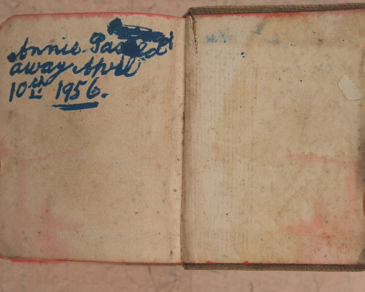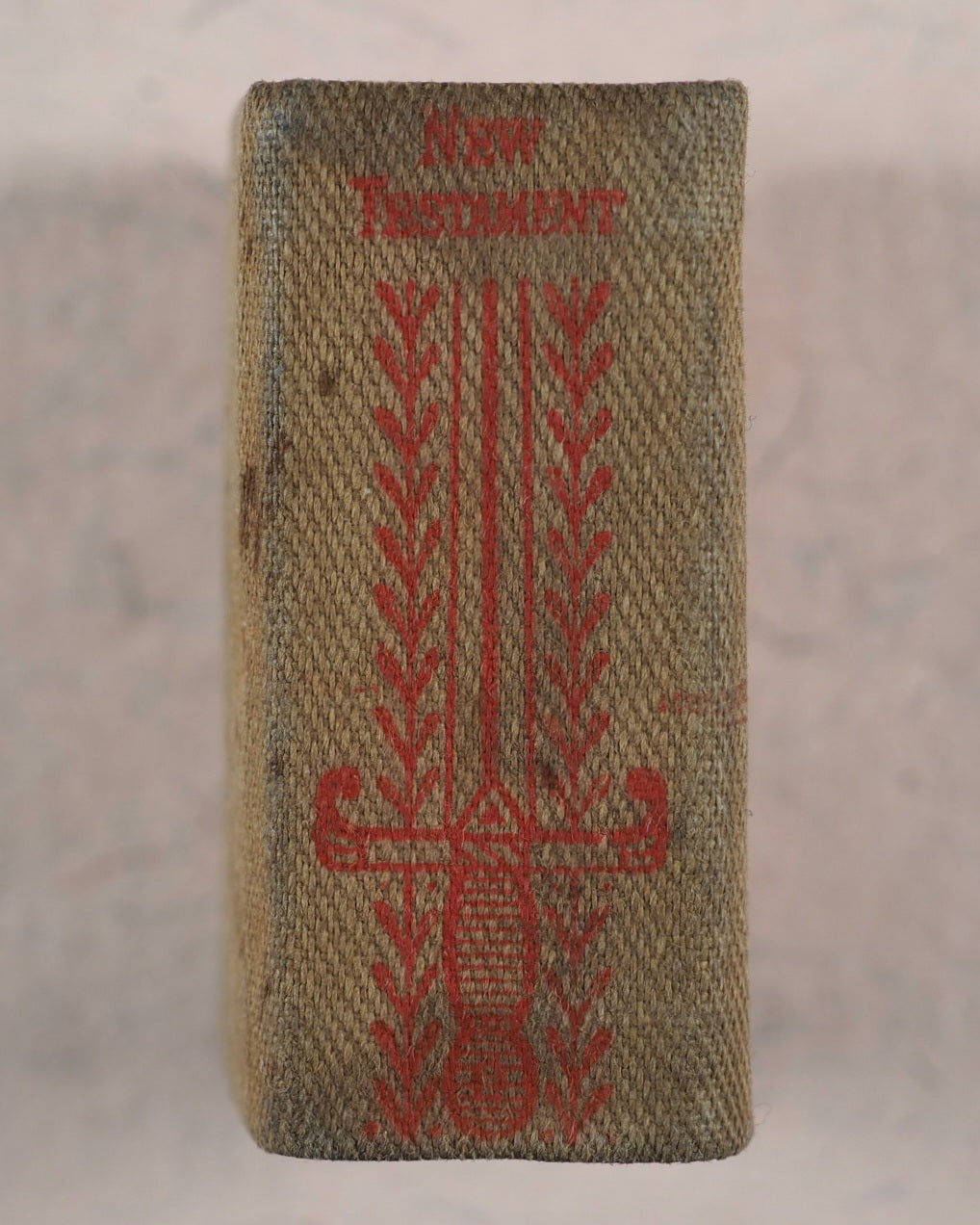 1034 printed pages. India paper. Issued in the same year as the Allies Bible published by David Bryce & Son, but considerably more scarce. Preliminary blank page torn at lower corner. Minuscule bleeding from red edges into margins, not affecting the text. Inscription slightly smudged in parts. Rounded corners. All edges red. Original cream endpapers. Contemporary ink inscription on front free endpaper to Len from Annie, dated November 26th 1914. 45 x 52 mm. Original buff buckram - a binding commonly utilised for troops in World War One. Spine with red titling above laurel leaves and up-thrust sword hilt; front cover withapplied hoisted Union flag on white flagpole, within red printed borders with oak leaf design corner-pieces. Mild rust spots on back cover. Slight wear but overall in good condition. Not in Bondy, nor Spielmann. Welsh, 798. WorldCat locates no copies worldwide.