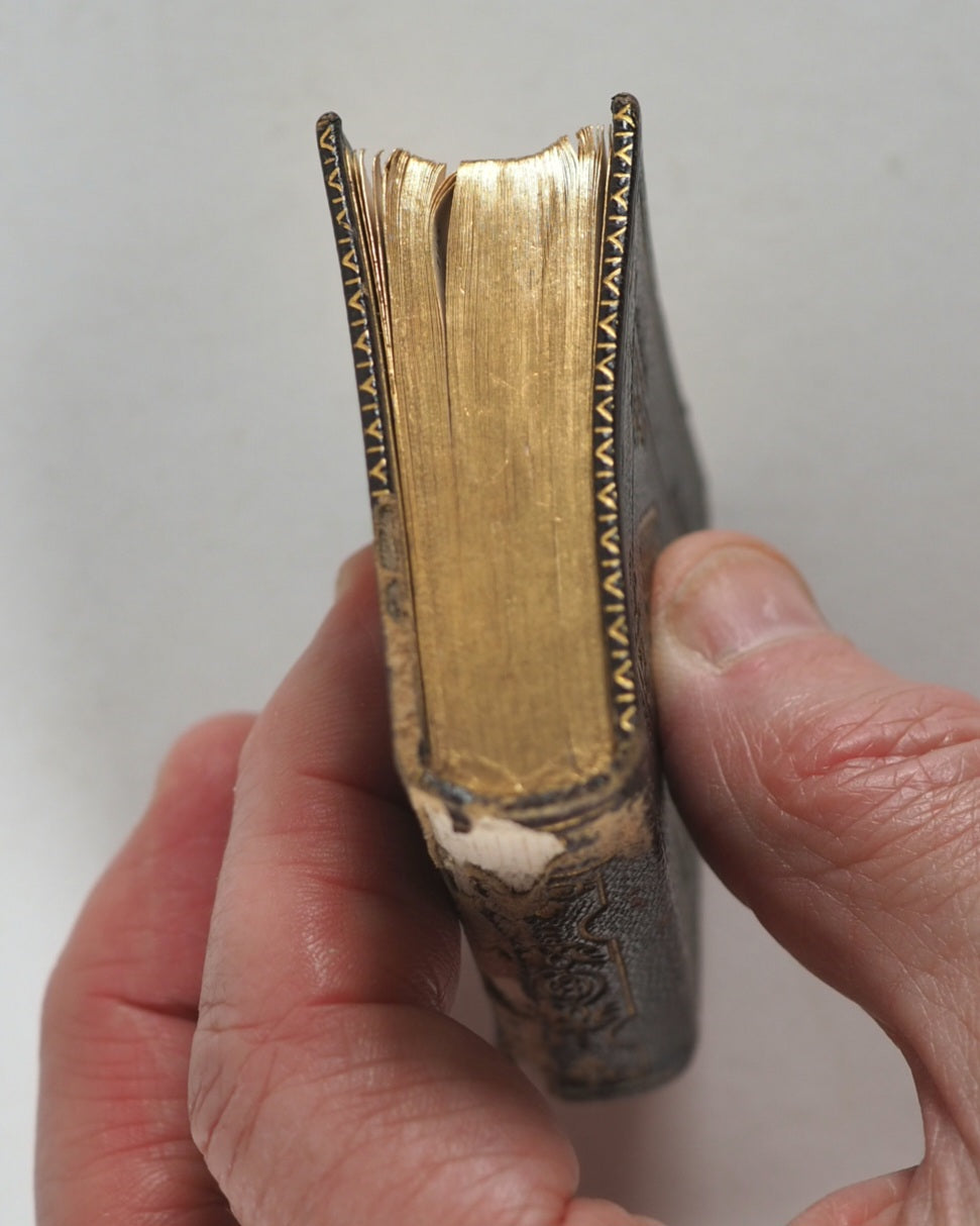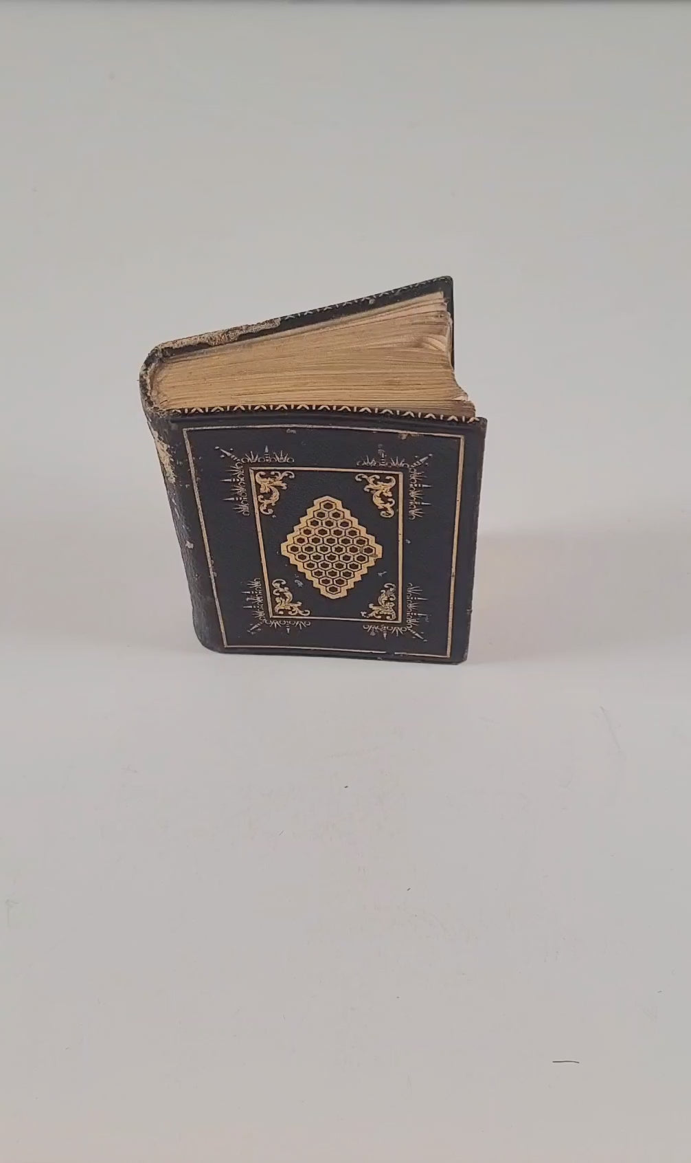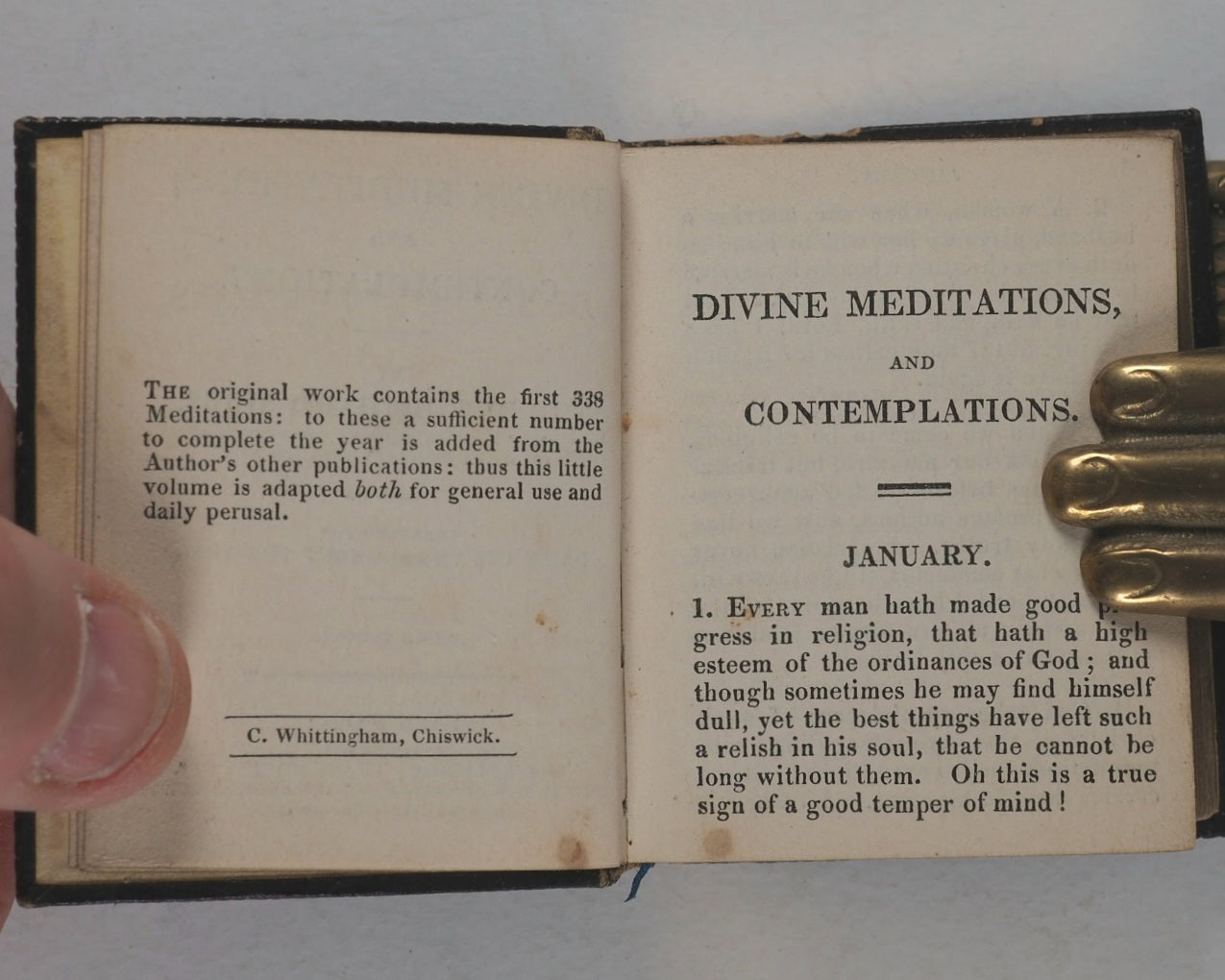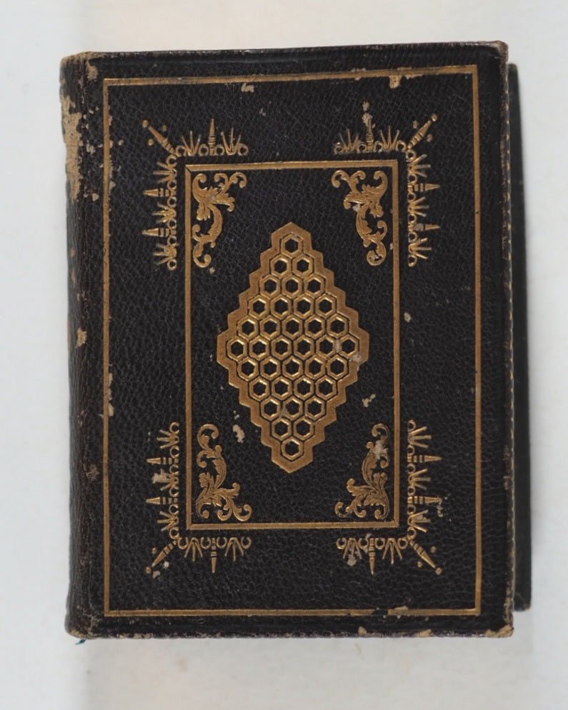 256 printed pages. 3rd edition. Printed by C. Whittingham, Chiswick. "The original work contains the first 338 Meditations: to these a sufficient number to complete the year is added from the Author's other publications: thus this little volume is adapted both for general use and daily perusal." The first edition is recorded in four USA university libraries. All edges gilt. Original pale yellow endpapers. Contemporary owner's ink inscription on front free endpaper, dated 1855. 57 x 70 mm. Original black embossed morocco; central rhomboid honeycomb motif within borders with corner-pieces - all in gilt; spine with gilt decoration. Spine defective - half-consumed by worm revealing tightly sewn gatherings. Boards bowing. See Welsh, 6380 for first edition. OCLC, 50277357 . WorldCat locates one copy of this edition worldwide (Kansas State University).