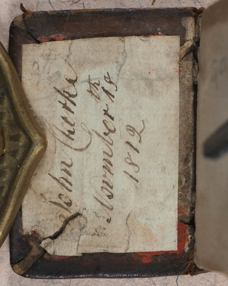 [285 of 288] printed pages; imprimatur leaf 'A' (with small drop of red sealing wax to recto) and The Bible & New Testament half-titles all with typographical borders at head and foot, blank leaf K8 present bearing 18th/19th-century ownership signature Henry Jonathan Clarke, final leaf of Revelation present (h5) but lacking final 3 leaves h6-h8 (h7 & h8 blanks), some light marginal fraying, occasional light pencil markings to few leaves, very light blue stain at head of leaves d1-g8, leaves slightly sprung, upper edge of leaves with initials 'M. R.', upper pastedown with ownership inscription John Clarke November 18th 1812'. "The epistle" and "To the reader" signed: J. Taylor. The New Testament has special t.p. with title: Salvator mundi. Imprimatur, dated Octob. 6, 1693, signed: G. Lancaster. Signatures: A-K⁸ a-h5. A Thumb Bible in verse, which Wing records as 32mo. Provenance: Ralph Ewart Ford (1897-1974), precision engineer and founder of Fords (Finsbury) Ltd. In Bedford. A member of the Bibliographical Society, he formed one of the largest collections of English Bibles in England. During the coronation of Queen Elizabeth II in 1953, a selection of the rarest and most important early English Bibles from Ralph Ford’s collection went on display in a touring exhibition across England, including the Chapter House at Westminster Abbey. 37 x 48 mm. Contemporary calf, initials 'M. R.' in blind to boards, lacking clasps. Some very slight wear. A rather defective copy sold at Sothebys October 23rd 1967 for £120.00. The earliest known edition, dated 1614, was published under title: Verbum sempiternae (later corrected to sempiternum); cf. Stone, W.M. The Thumb Bible of John Taylor (1928). There were two 1693 editions, the first (as here) is that printed by F. Collins in London for T. Ilive, and the second edition, 'with amendments', of the same size, bears only the T. Ilive imprint. Many more editions followed during the next century and the latest, reprinting the 1693 edition, were published by Longman in London in 1850. The great popularity of these texts is perhaps explained by the fact that this Thames waterman turned poet had, as Harvey's Oxford Companion to English Literature remarks, "a marked talent for expressing himself in rollicking verse and prose" (Bondy). A paraphrase of the Old and New Testaments, in verse. Adomeit, B12 (locates copies in ten libraries - the British Library copy is imperfect). Bondy, 13-5. ESTC, R184924. Johnston, ivA. Welsh, 1177. Wing, T525. OCLC, 34281709. WorldCat locates 13 copies worldwide.