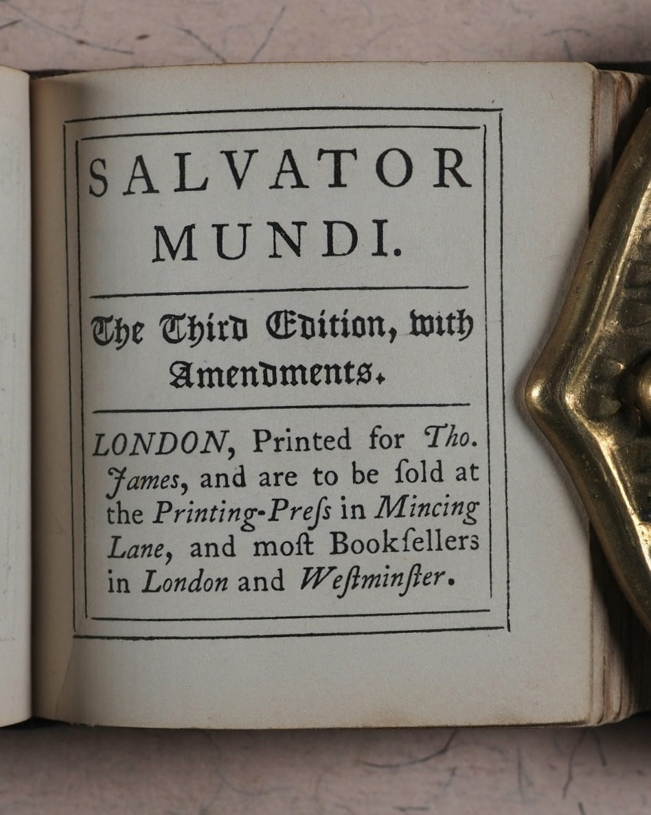 Thumb Bible. Verbum Sempiternum. Longman and co. London. 1849. [288] pages. Exact reprint (not facsimile) of 1693 third edition of couplets giving abstracts of scripture by John Taylor. Spelling revised. Including the New Testament, 'Salvator Mundi'. Printed by C. Whittingham, Chiswick, in 12-point typeface. All edges red. Marbled endpapers. Half-title slightly thumbed. 50 x 55 mm. Publisher's brown blind-stamped decorated calf. Lacks original metal piece where the clasp attaches to the front cover. This Longman edition was well enough received to go on to four furhter editions, the last one in 1860, and a final reprint in 1889 by Hodder & Stoughton. Johnston, x. Spielmann, 496. Stone, 'Snuff-Boxful', 44. Welsh, 1218. WorldCat locates no copies worldwide of this edition.