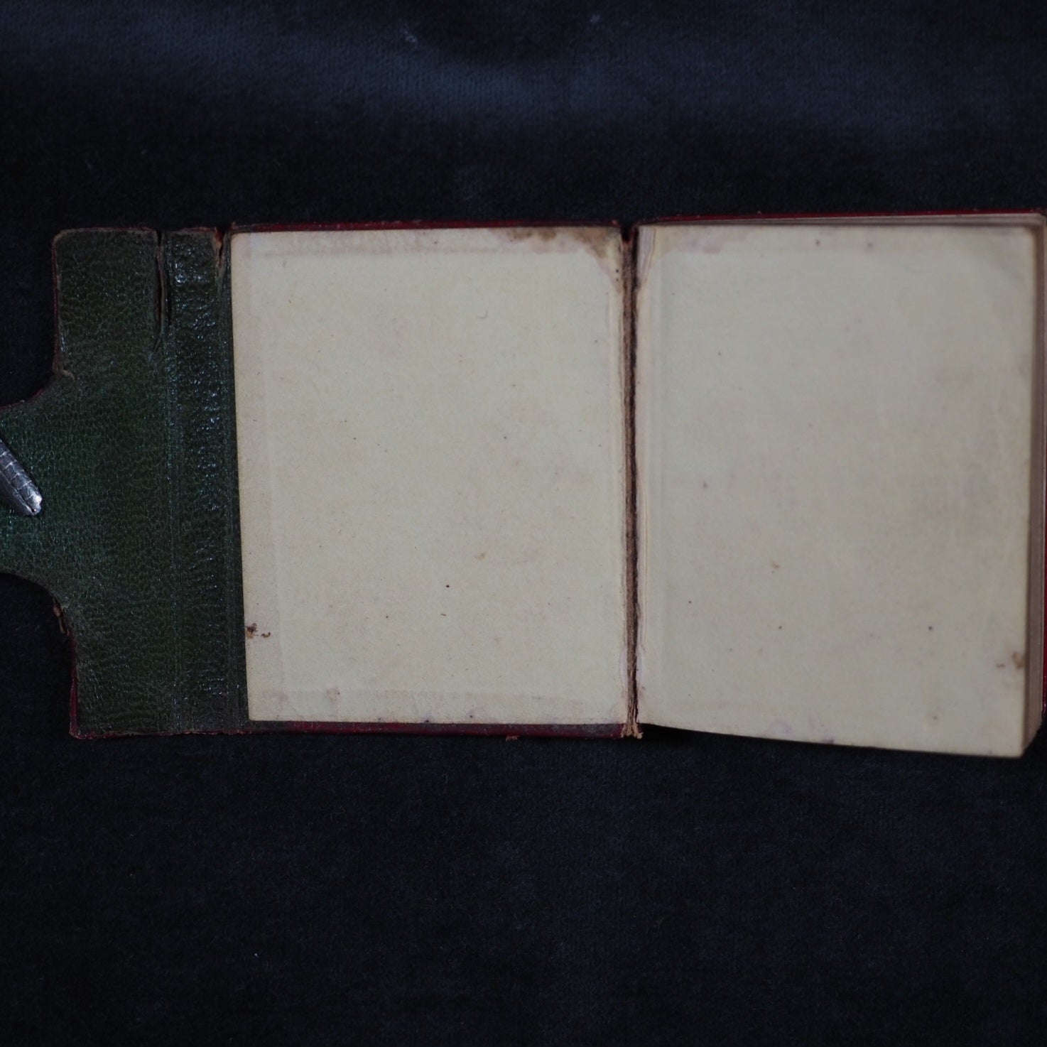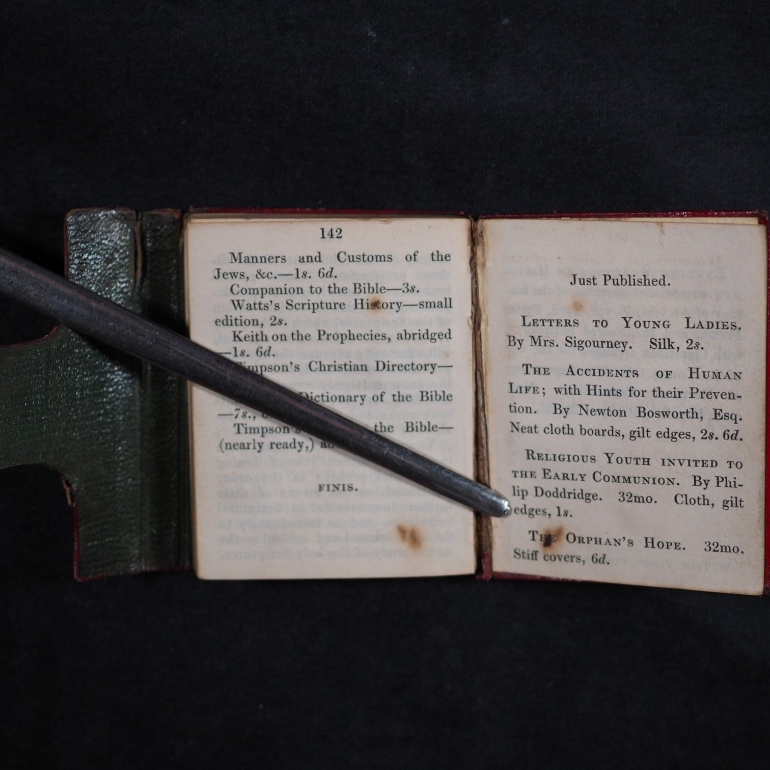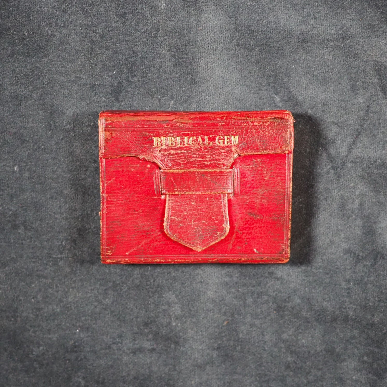 142 printed pages + 2 page publisher's advert at end. Original primrose endpapers. All edges gilt. Printed by W. Tyler, Ivy Lane, St. Paul's.  55 x 68 mm. Ruby morocco  and olive-green reverse wallet-style binding, with Biblical Gem in gilt. Heavily patinated with slight wear and one hinge partially split but still holding firm.