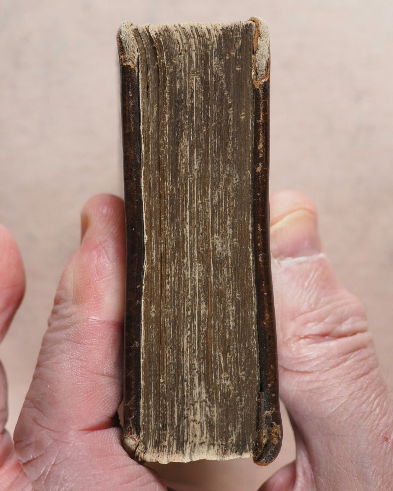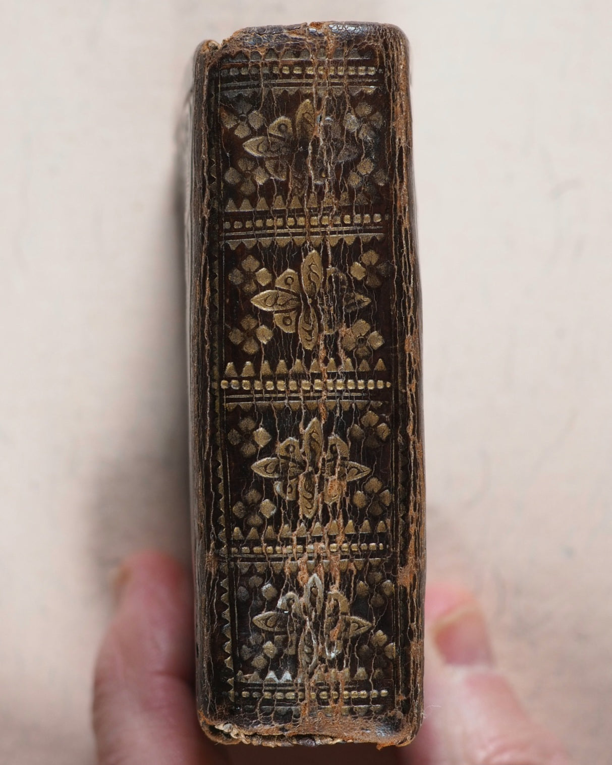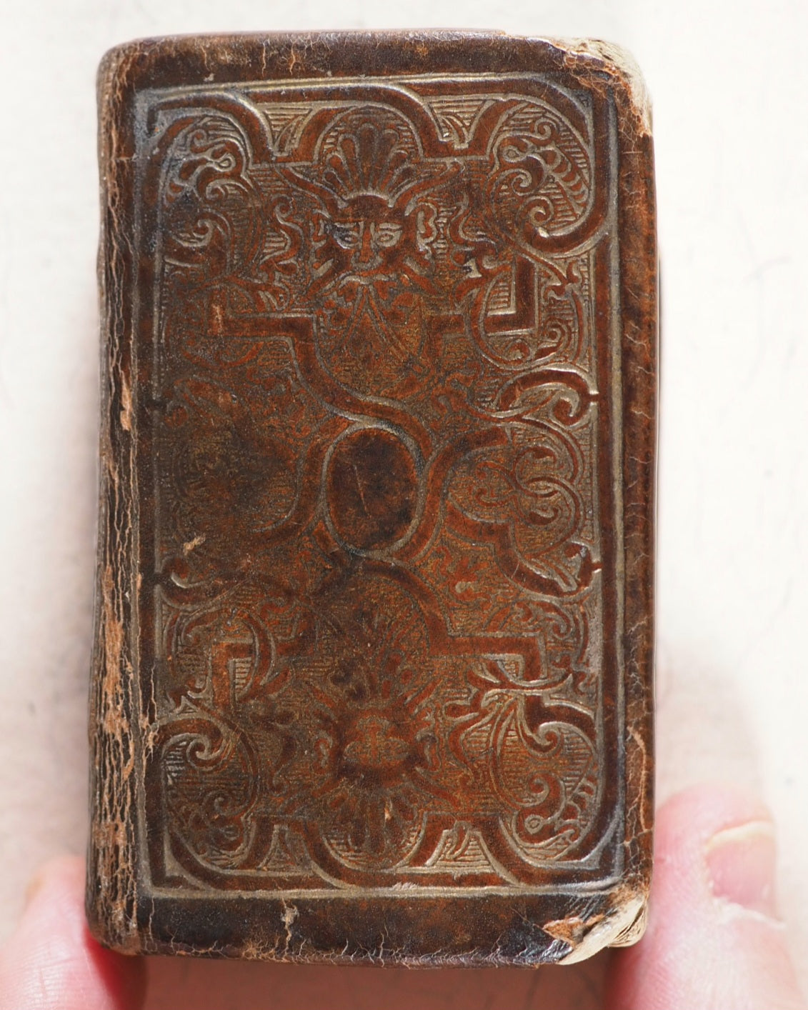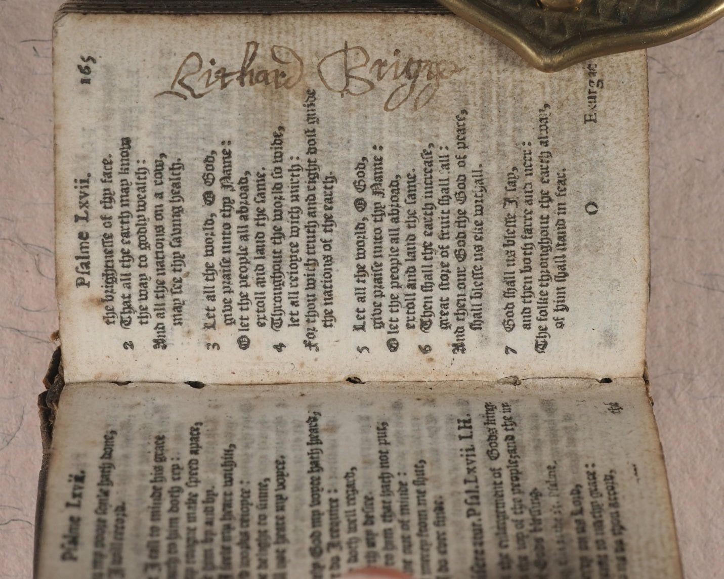 [44], 1-408, [56] pages + colophon (including index). C3, G4,corners torn, not affecting text. Pages mildly age-toned and very occasional slight foxing. Some page corners lightly creased. One gathering very slightly sprung. All edges gilt and gauffered. Contemporary ink ownership signatures and marginalia on verso of front free endpaper, page 165, verso of colophon, blank leaf and rear endpapers. "Read not this book ..." Provenance: Richard Brigge. 55 x 85 mm. Contemporary lovely early 17th century English binding with heavy gilt tooling. Spine heavily hand-tooled in gilt with four typically 17th C. crude floral and leaf designs within pointillé and dogtooth horizontal borders. The binding of the front and rear boards is very similar to the sixteenth century binding style of the contemporary entrelac or strapwork bindings made popular by the collector Jean Grolier who was treasurer of France. The boards are somewhat rubbed and corners worn, but with an attractive patina. A rare miniature edition in a rare contemporary "Green Man" binding. For another 1634 Company of Stationers Book of Psalms, see Christie's New York, The History of the Book: The Cornelius J. Hauck Collection, 27-28 June 2006, lot 290. Another similar miniature 1634 Book of Psalms, worked in silver wire over maroon velvet, was sold at Christie's London, Valuable Books and Manuscripts (including Important Early English Books from the Kenyon Library at Gredington), 14 July 2021, lot 98 (£27,500). The twin "Green Man" depictions on each board set this binding apart - it is rare to see and there are no equivalent "Green Man" bookbindings currently in commerce and none that have been located in libraries. The Green Man appears on our medieval churches as a symbol of rebirth and resurrection, tying together the old ancient pagan symbols associated with spring & with the Christian faith. Welsh, 642 (Davenport, English Embroidered Bookbindings, image 50. Grolier, Exhibition of Silver Embroidered and Curious Bookbinding, 223). STC, 2653. WorldCat locates no copies worldwide.