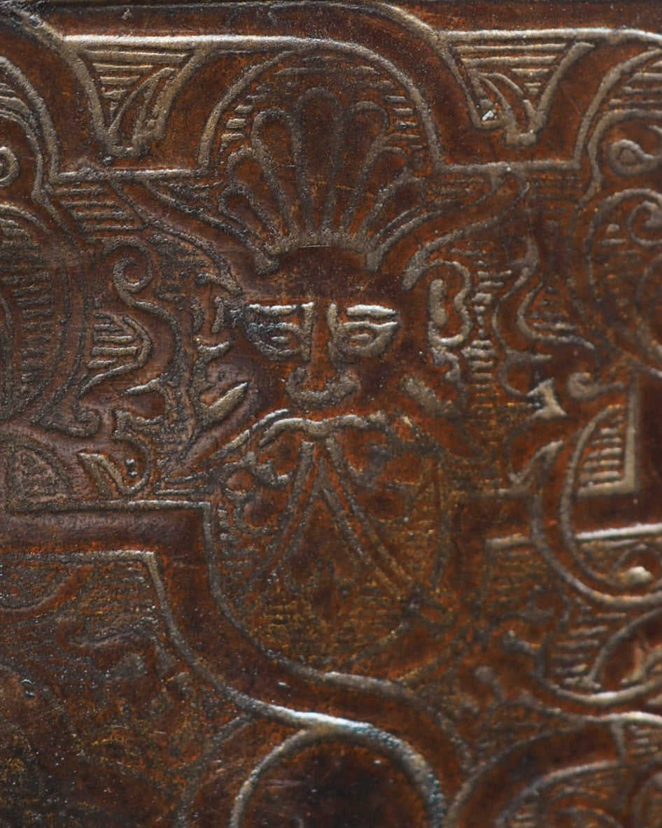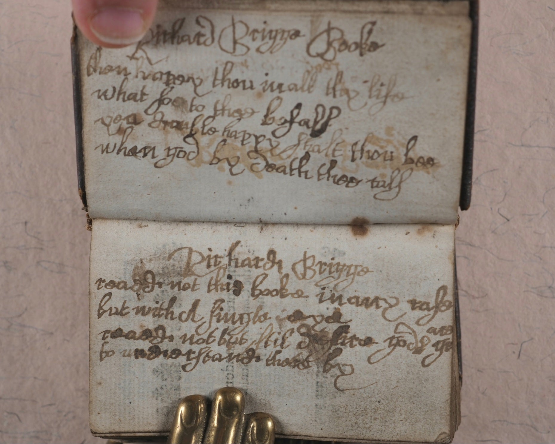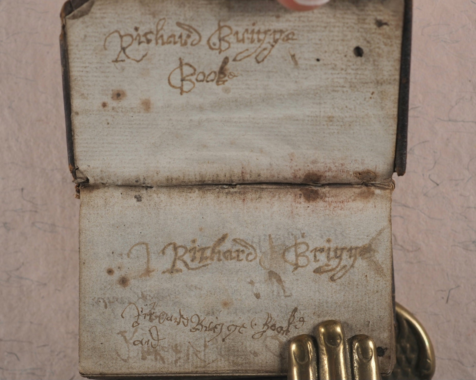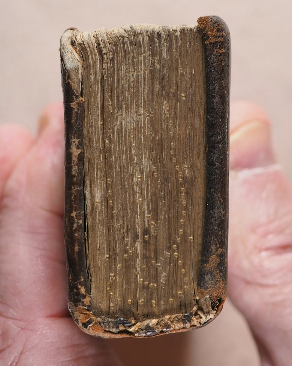[44], 1-408, [56] pages + colophon (including index). C3, G4,corners torn, not affecting text. Pages mildly age-toned and very occasional slight foxing. Some page corners lightly creased. One gathering very slightly sprung. All edges gilt and gauffered. Contemporary ink ownership signatures and marginalia on verso of front free endpaper, page 165, verso of colophon, blank leaf and rear endpapers. "Read not this book ..." Provenance: Richard Brigge. 55 x 85 mm. Contemporary lovely early 17th century English binding with heavy gilt tooling. Spine heavily hand-tooled in gilt with four typically 17th C. crude floral and leaf designs within pointillé and dogtooth horizontal borders. The binding of the front and rear boards is very similar to the sixteenth century binding style of the contemporary entrelac or strapwork bindings made popular by the collector Jean Grolier who was treasurer of France. The boards are somewhat rubbed and corners worn, but with an attractive patina. A rare miniature edition in a rare contemporary "Green Man" binding. For another 1634 Company of Stationers Book of Psalms, see Christie's New York, The History of the Book: The Cornelius J. Hauck Collection, 27-28 June 2006, lot 290. Another similar miniature 1634 Book of Psalms, worked in silver wire over maroon velvet, was sold at Christie's London, Valuable Books and Manuscripts (including Important Early English Books from the Kenyon Library at Gredington), 14 July 2021, lot 98 (£27,500). The twin "Green Man" depictions on each board set this binding apart - it is rare to see and there are no equivalent "Green Man" bookbindings currently in commerce and none that have been located in libraries. The Green Man appears on our medieval churches as a symbol of rebirth and resurrection, tying together the old ancient pagan symbols associated with spring & with the Christian faith. Welsh, 642 (Davenport, English Embroidered Bookbindings, image 50. Grolier, Exhibition of Silver Embroidered and Curious Bookbinding, 223). STC, 2653. WorldCat locates no copies worldwide.