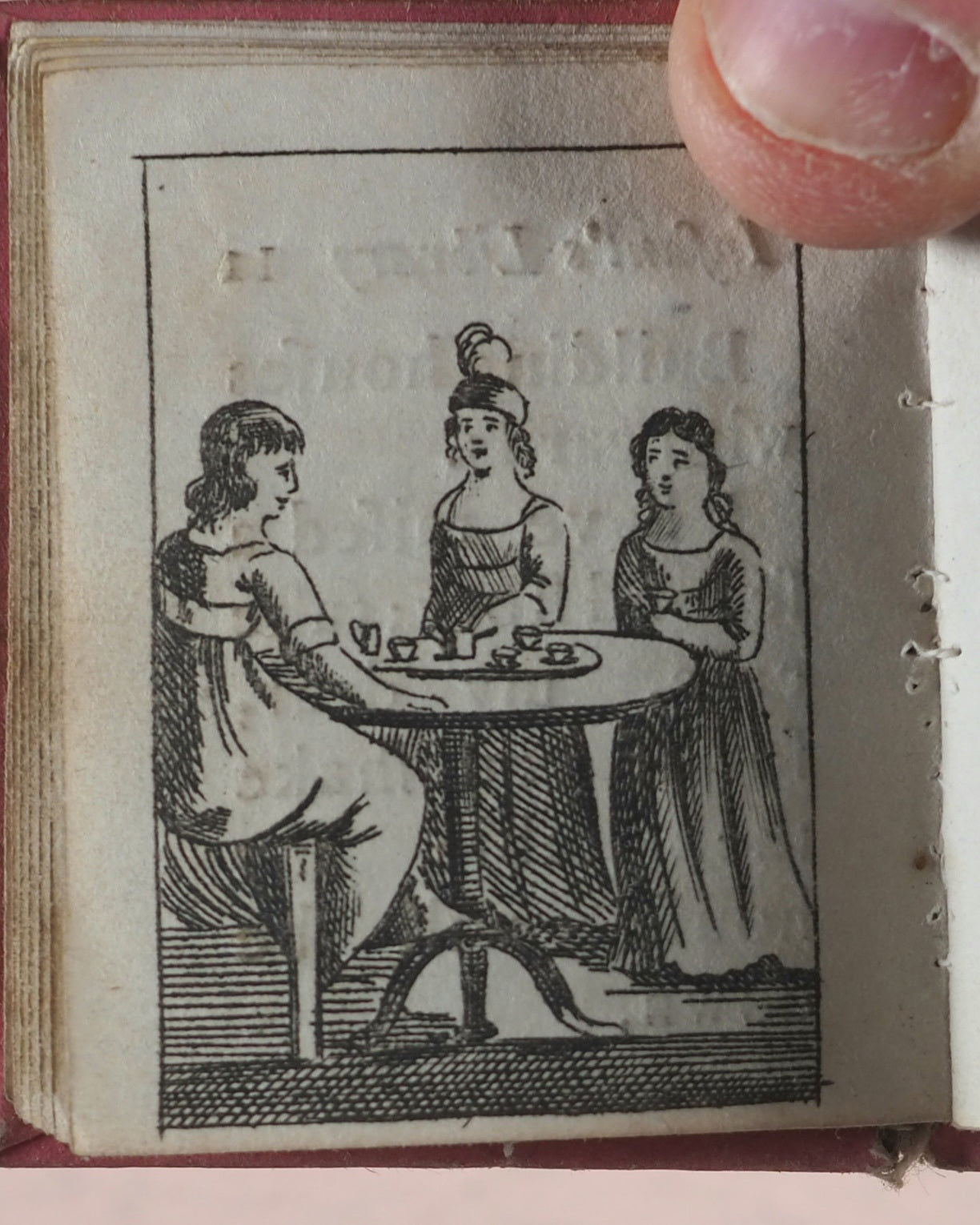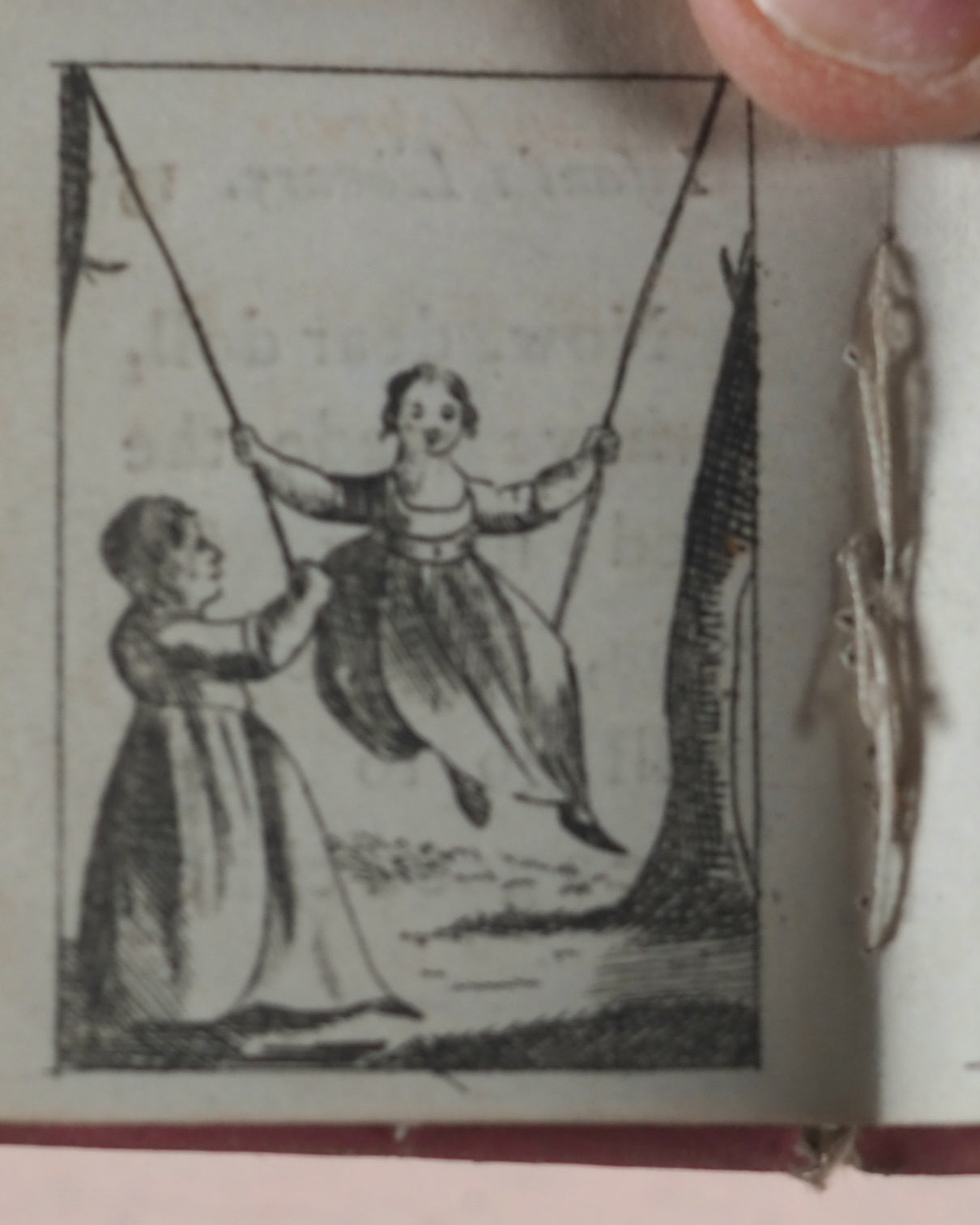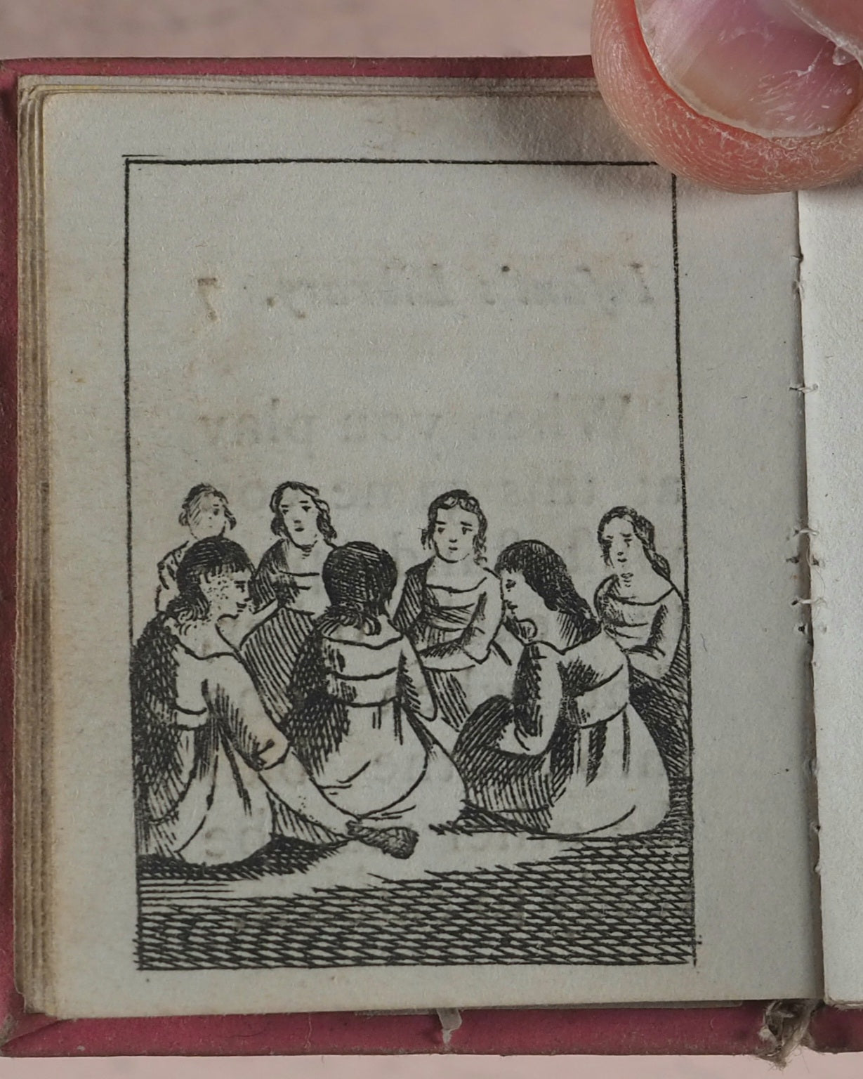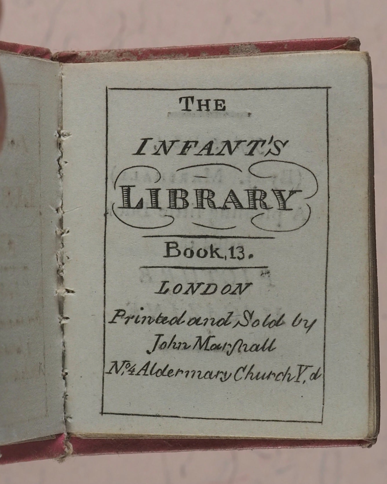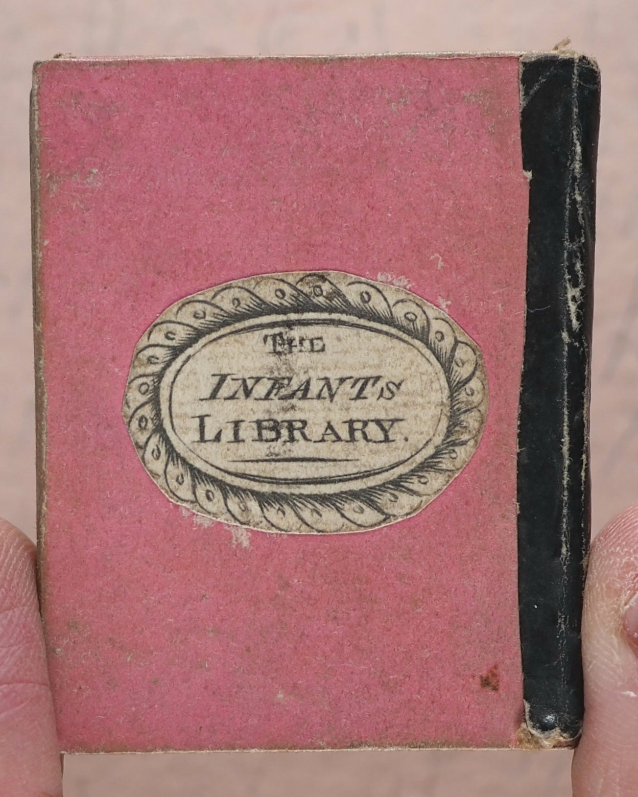 Marshall, John. Infant's Library. [Book 13] (Girls' Games).  Marshall, John. No. 4 Aldermary Churchyard in Watling Street. London. Circa 1800 ( before the move to 140 Fleet Street in 1808). 32 unsigned printed pages. 13 striking etched full-page plates of girls' games. Includes dressing up dolls.  Marshall's imprint/colophon on the verso of the last leaf is engraved - other text is letter-press. Publisher's advert for the 24th number of the Children's Magazine that was published before February 1801.  Inner hinges split. Old black spine split with basic and old stitched repair. Slight offsetting and mild page toning. 47 x 60 mm. Contemporary pink paper covered boards. Original cream printed oval label with ornately decorated edges on front cover but of different design on the back  cover and both labels pasted upside down. Thirteenth of 16 volumes originally sold in  a sycamore bookcase box divided into four compartments with red paper lining, with a label reading "Sold by John Harris, successor to E.Newberry, at the corner of St. Paul's Churchyard". Welsh (History, page 74) attributed Jean Jacques Rousseau and the didactic school of philosophy's influence on this publication - one of the earliest books published for children, and designed to train their intellect and morals.