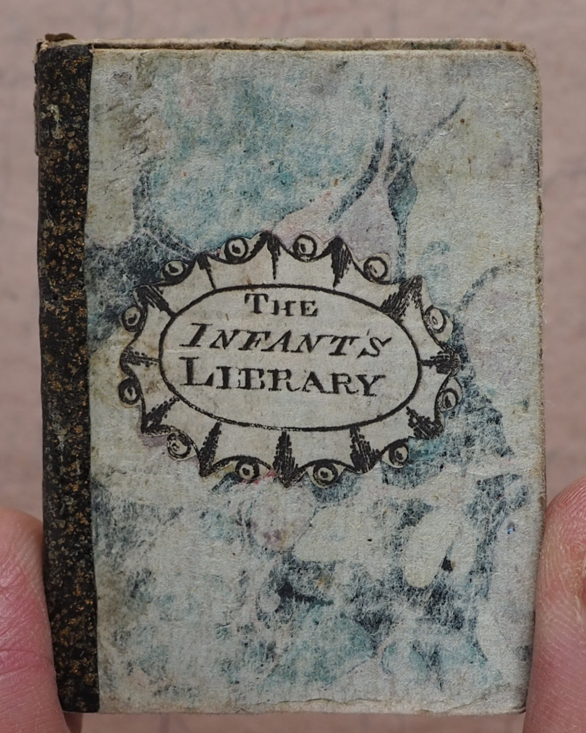 Marshall, John. Infant's Library. [Book2] (Spelling Book or Syllabary). Marshall, John. No. 4 Aldermary Churchyard in Watling Street. London. Circa 1800 ( before the move to 140 Fleet Street in 1808). Unrecorded variant imprint. Text starts on verso of title-page, A6. Complete in 57 printed pages on hand-made chain-linked rag paper. Consistent use of the long 's' associated with the erlier imprints. In this edition it goes from "naughty" to "a good boy, a fair child, a nice book, a neat doll." In the earlier 63 page impression it follows on with ""satchel, summer, shadow", then "animal, family, perfectly", then "history, multiply, presently", then "directly, displeased, disposed", then "gentleman, wheelbarrow, butterfly", then "beautiful, elegance, discover", before "a good boy"&c. Slight offsetting and mild page toning. 47 x 60 mm. Contemporary marbled paper covered boards. White printed oval label with ornately cut edges on front cover but of different design on the back. Inner hinges split. Spine slightly split with basic and old black paper repair. Second of 16 volumes originally sold in a sycamore bookcase box divided into four compartments with red paper lining, with a label reading "Sold by John Harris, successor to E.Newberry, at the corner of St. Paul's Churchyard". Welsh (History, page 74) attributed Jean Jacques Rousseau and the didactic school of philosophy's influence on this publication - one of the earliest books published for children, and designed to train their intellect and morals. Bondy, 59-60. Bromer/Edison, 126. Spielmann, 211. Welsh, 4825. OCLC, 8837332. WorldCat locates 15 sets worldwide.