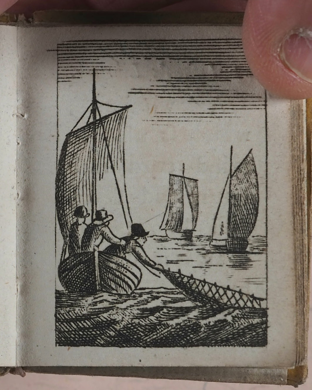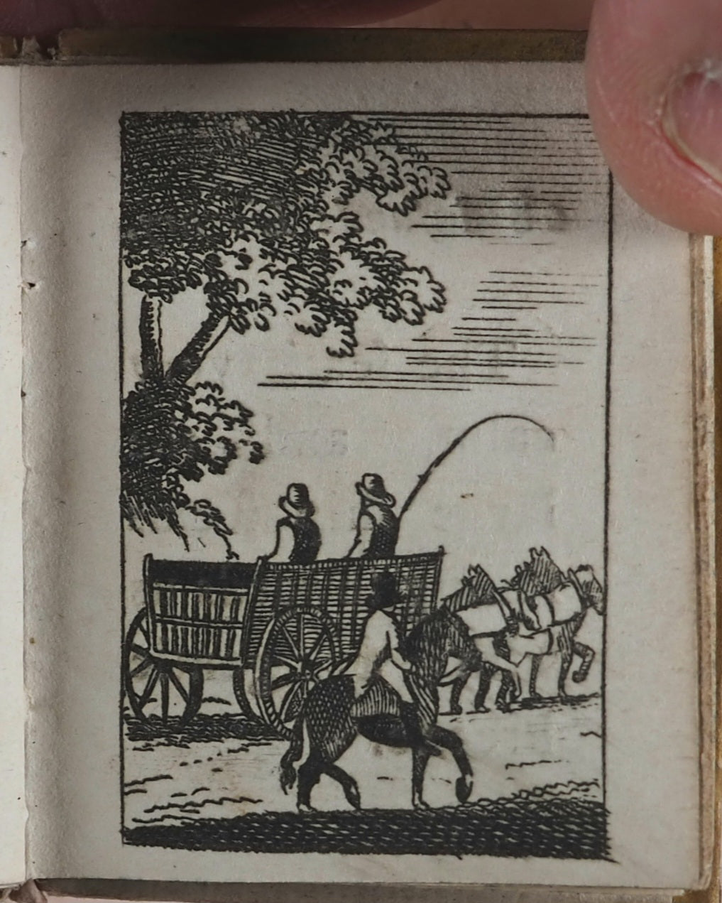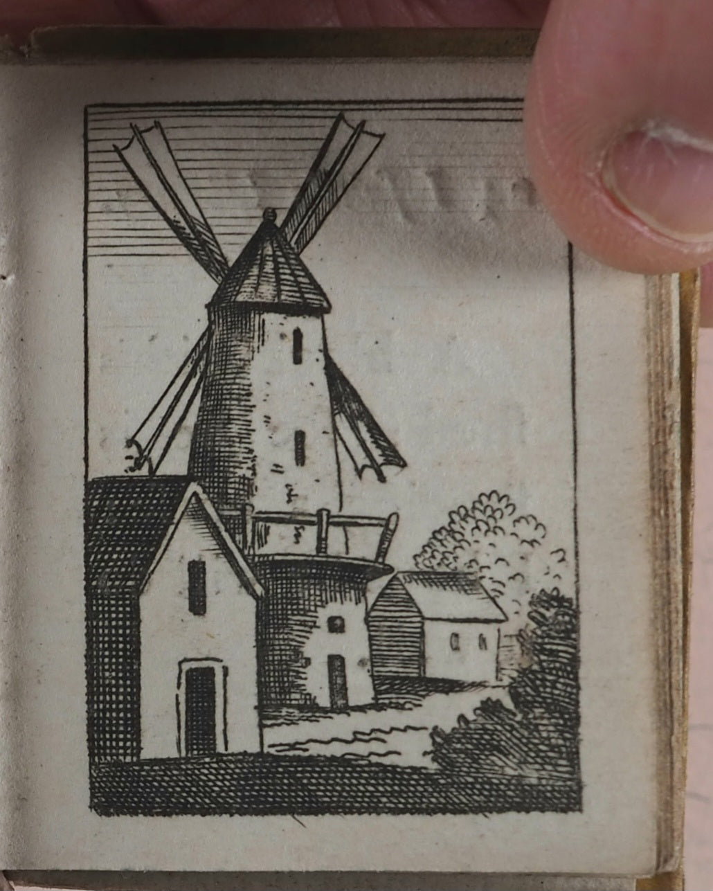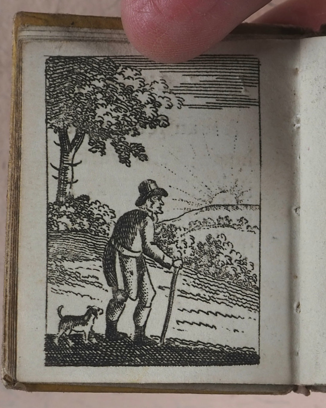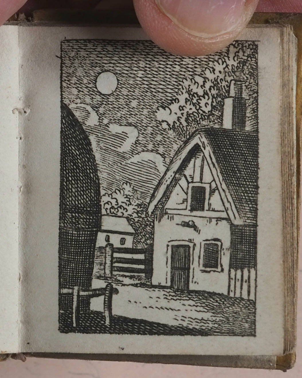 Marshall, John. Infant's Library. [Book3] (Outdoor Scenes I). Marshall, John. No. 4 Aldermary Churchyard in Watling Street. London. Circa 1800 ( before the move to 140 Fleet Street in 1808). 32 unsigned printed pages. 13 striking etched full-page plates of outdoor scenes Includes a windmill and a heavily laden coach and horses. Marshall's imprint/colophon on the verso of the last leaf is engraved - other text is letter-press. Publisher's advert for the 24th number of the Children's Magazine that was published before February 1801. Slight offsetting and mild page toning. 47 x 60 mm. Contemporary yellow paper covered boards. Original pink printed oval label with ornately decorated edges on front cover but of different design on the back cover. Inner hinges split. Spine slightly split with basic and old pink paper repair. Third of 16 volumes originally sold in a sycamore bookcase box divided into four compartments with red paper lining, with a label reading "Sold by John Harris, successor to E.Newberry, at the corner of St. Paul's Churchyard". Welsh (History, page 74) attributed Jean Jacques Rousseau and the didactic school of philosophy's influence on this publication - one of the earliest books published for children, and designed to train their intellect and morals. Bondy, 59-60. Bromer/Edison, 126. Spielmann, 212. Welsh, 4826. OCLC, 8837332. WorldCat locates 15 sets worldwide.