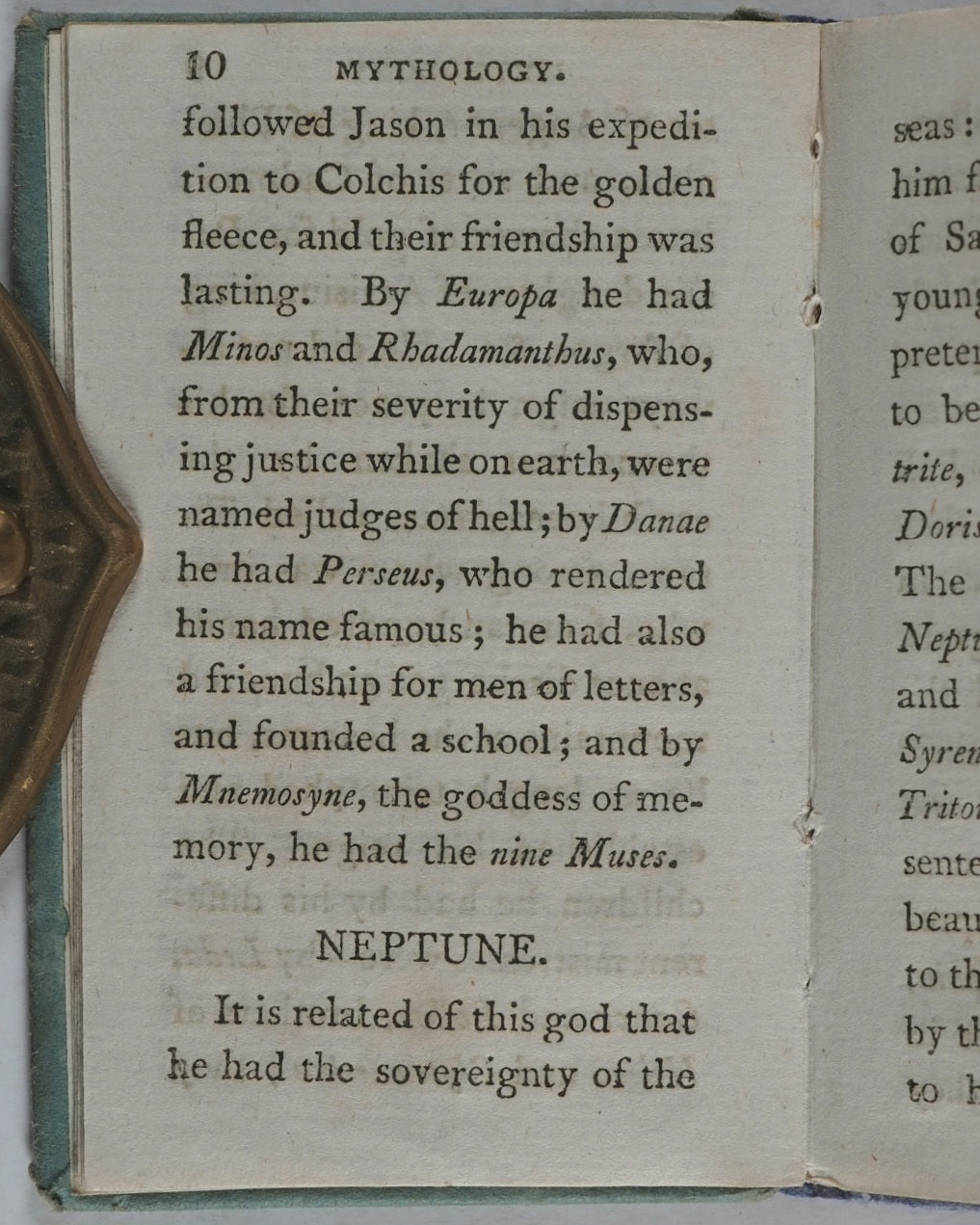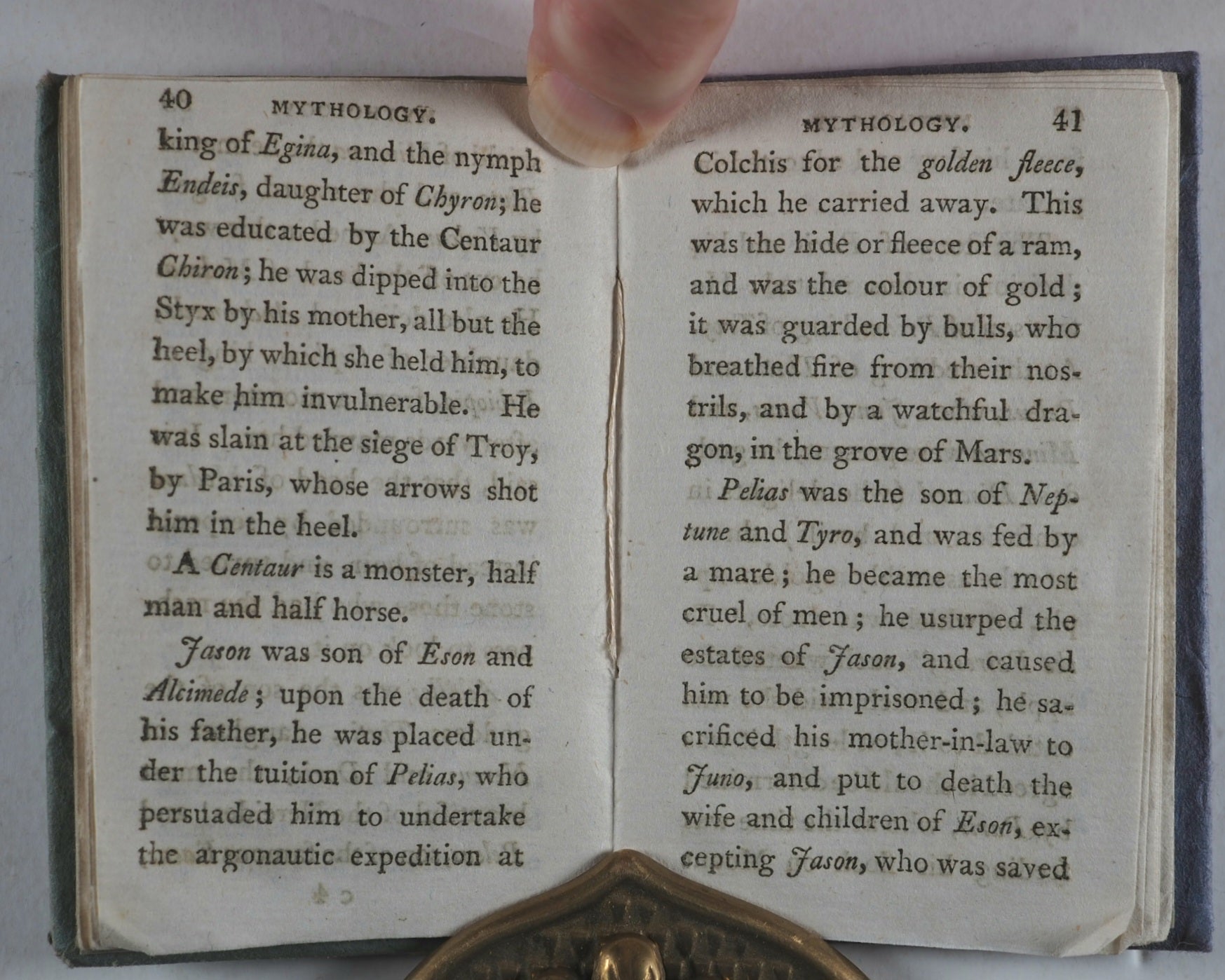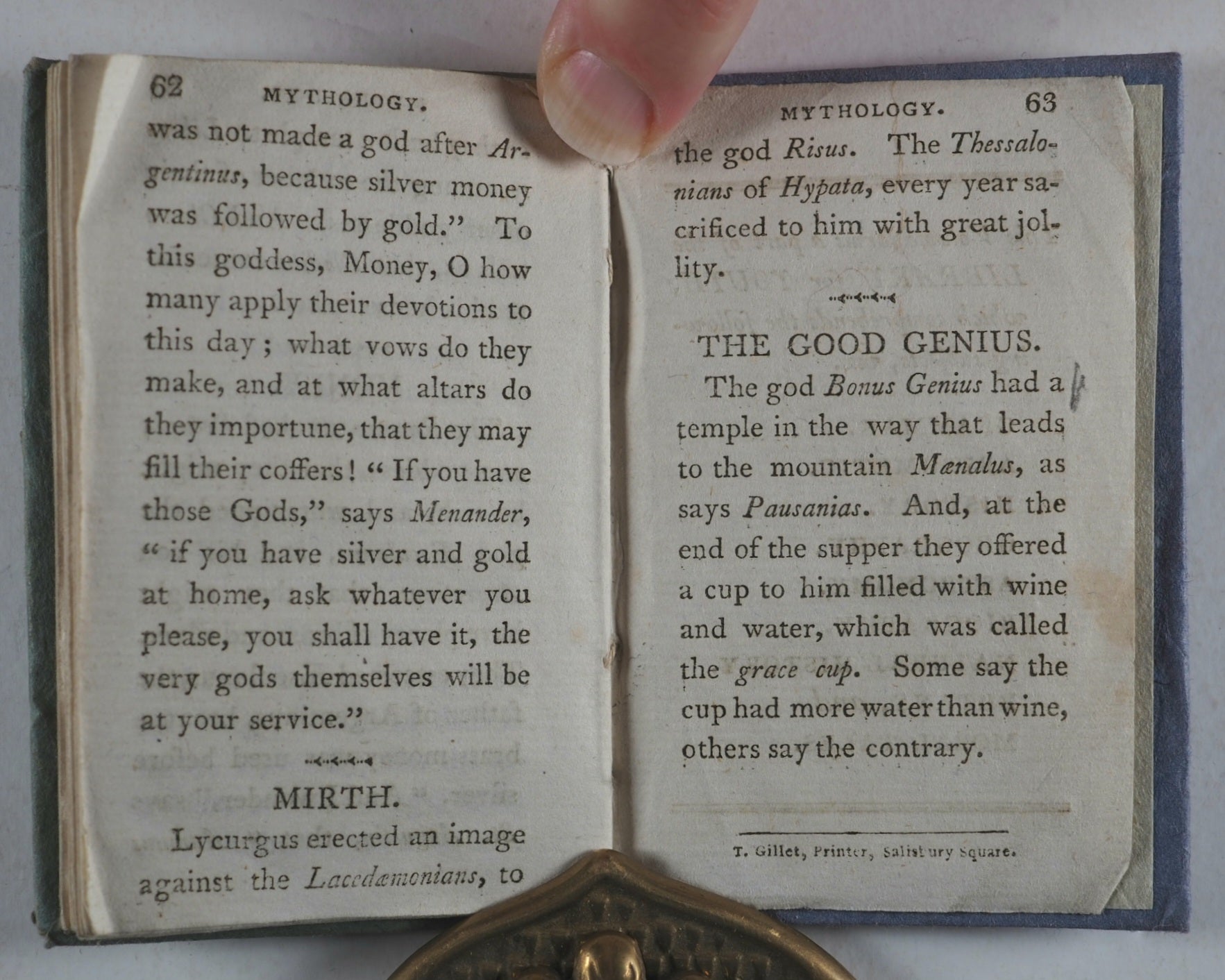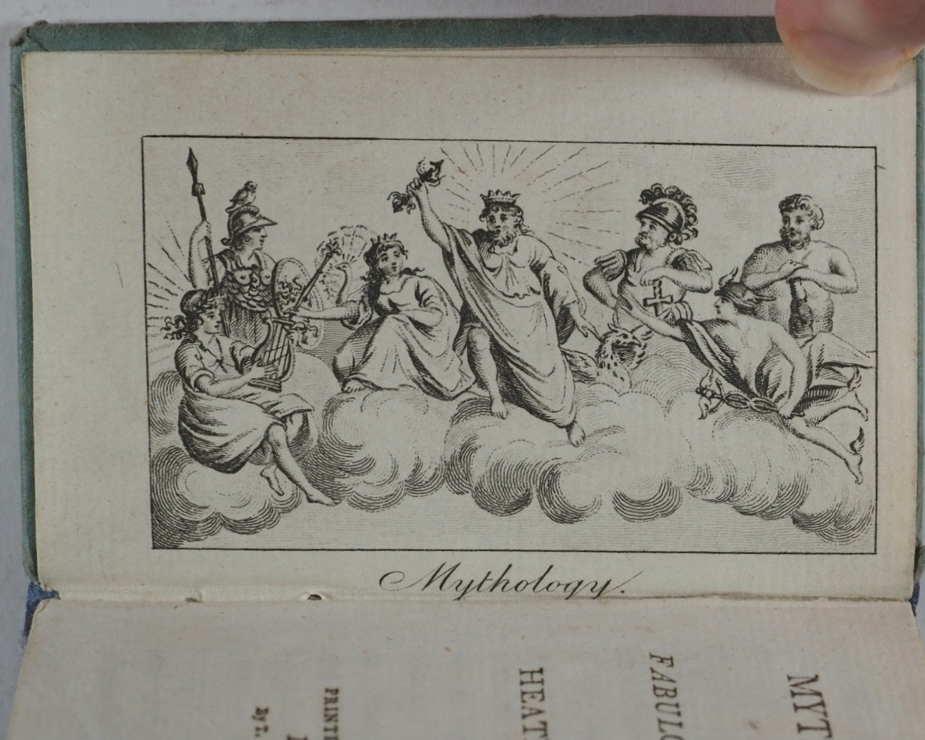 63 pages, + one page of publisher's advert at the back for the Library of Youth of which this was volume four. Copper-engraved frontispiece, captioned "Mythology," depicting Jupiter and several other Roman gods enthroned on a cloud. New rear pastedown endpapers. 60 x 92 mm. Original blue paper covered boards with original cream printed label. Spine and lower cover recovered. One of the ten books that was sold in a box as the 'Bookcase of Knowledge' or the 'Library of Youth' from 1800. The contents are aimed at the older child and are mostly quite sophisticated. Reprinting of Wallis's 1800 ed. (printed by Cundee) in a new setting of type; "London" in black letter on t.p. (cf. 1800 ed., which uses italic caps.) Very scarce in commerce. Not in Welsh, nor Spielmann, nor Bondy. But see See Welsh, 5202 and Spielmann, 379 for Cundee imprint. Alderson, Miniature Libraries for the Young, 4. Gumuchian, 801. Moon, John Harris's Books for Youth, 57. OCLC, 505788218. WorldCat locates no copies of the 1803 edition.