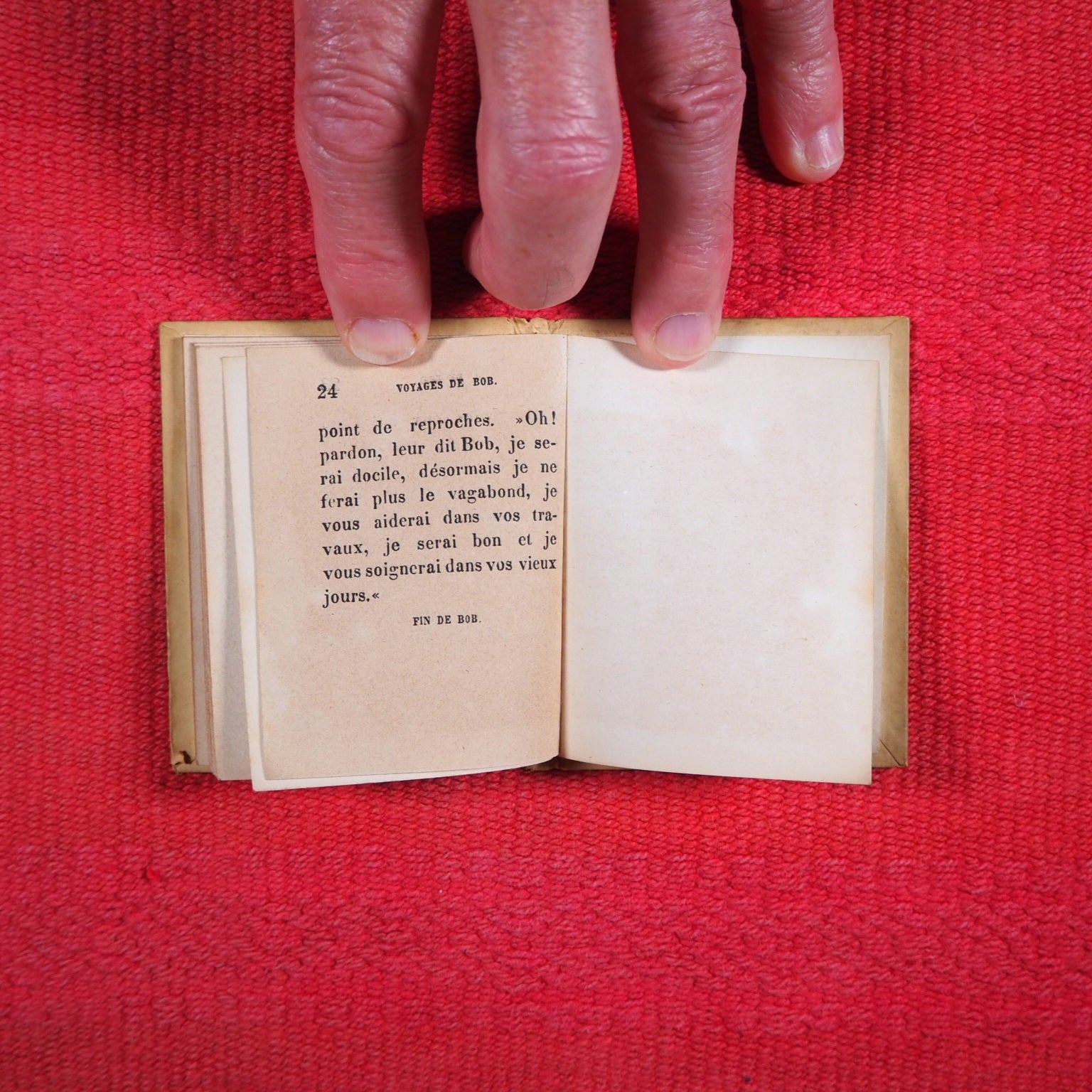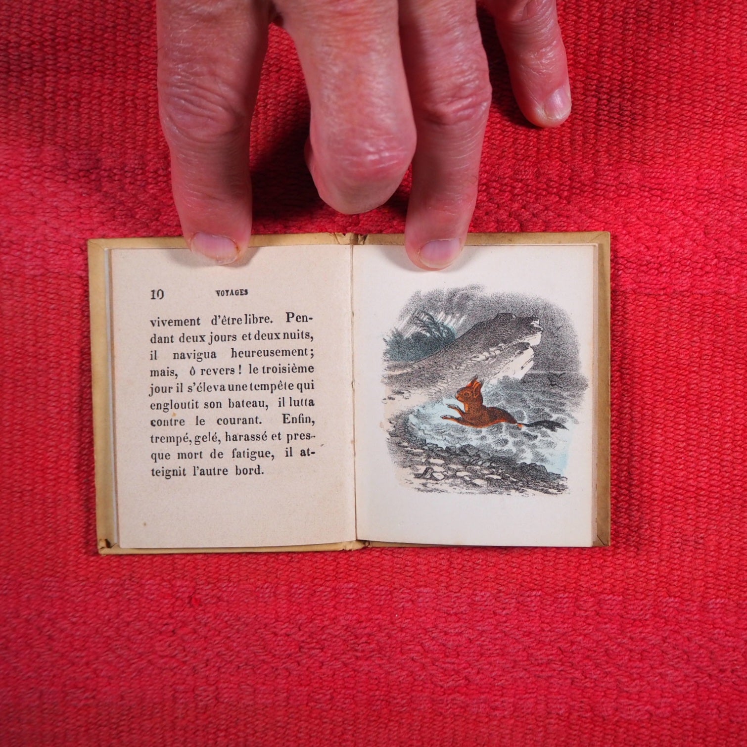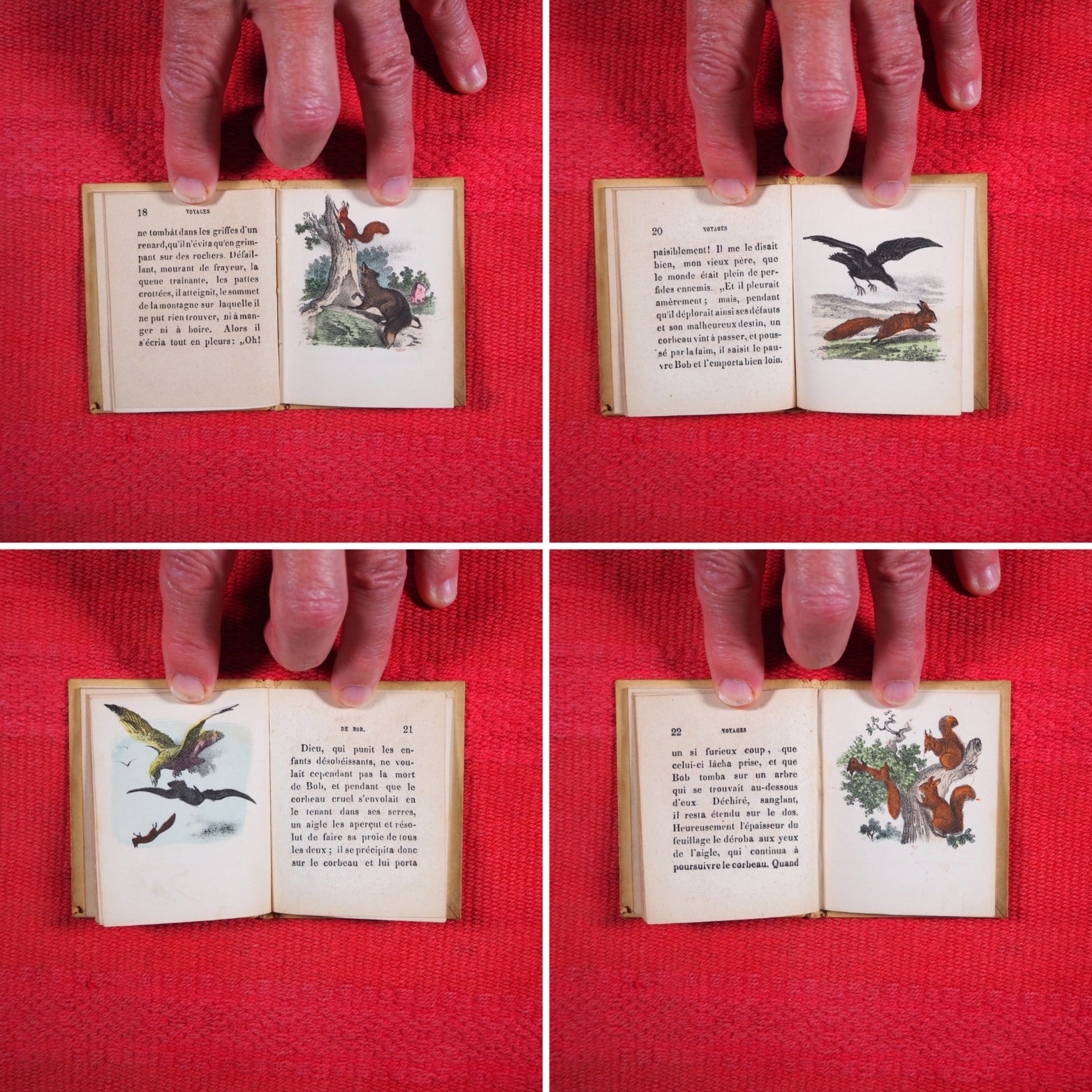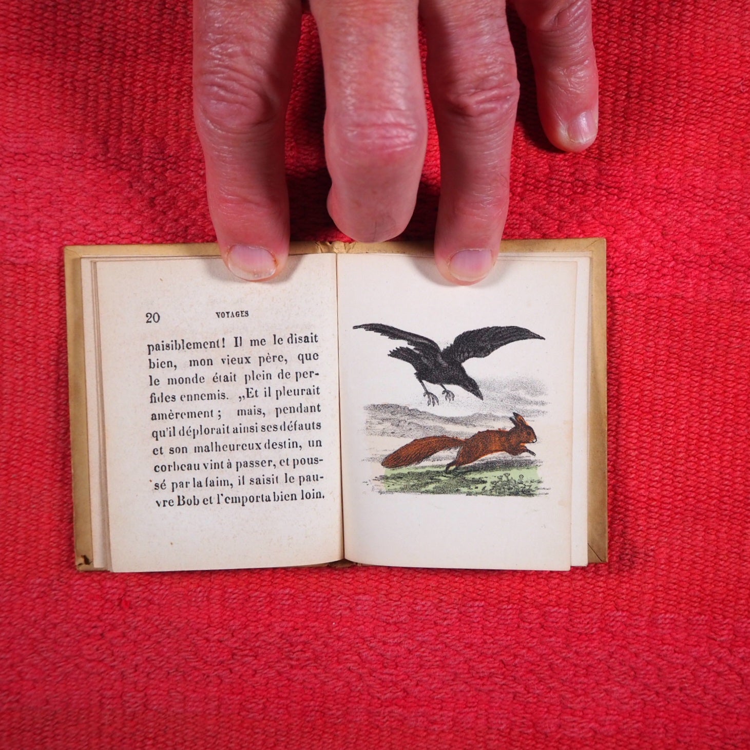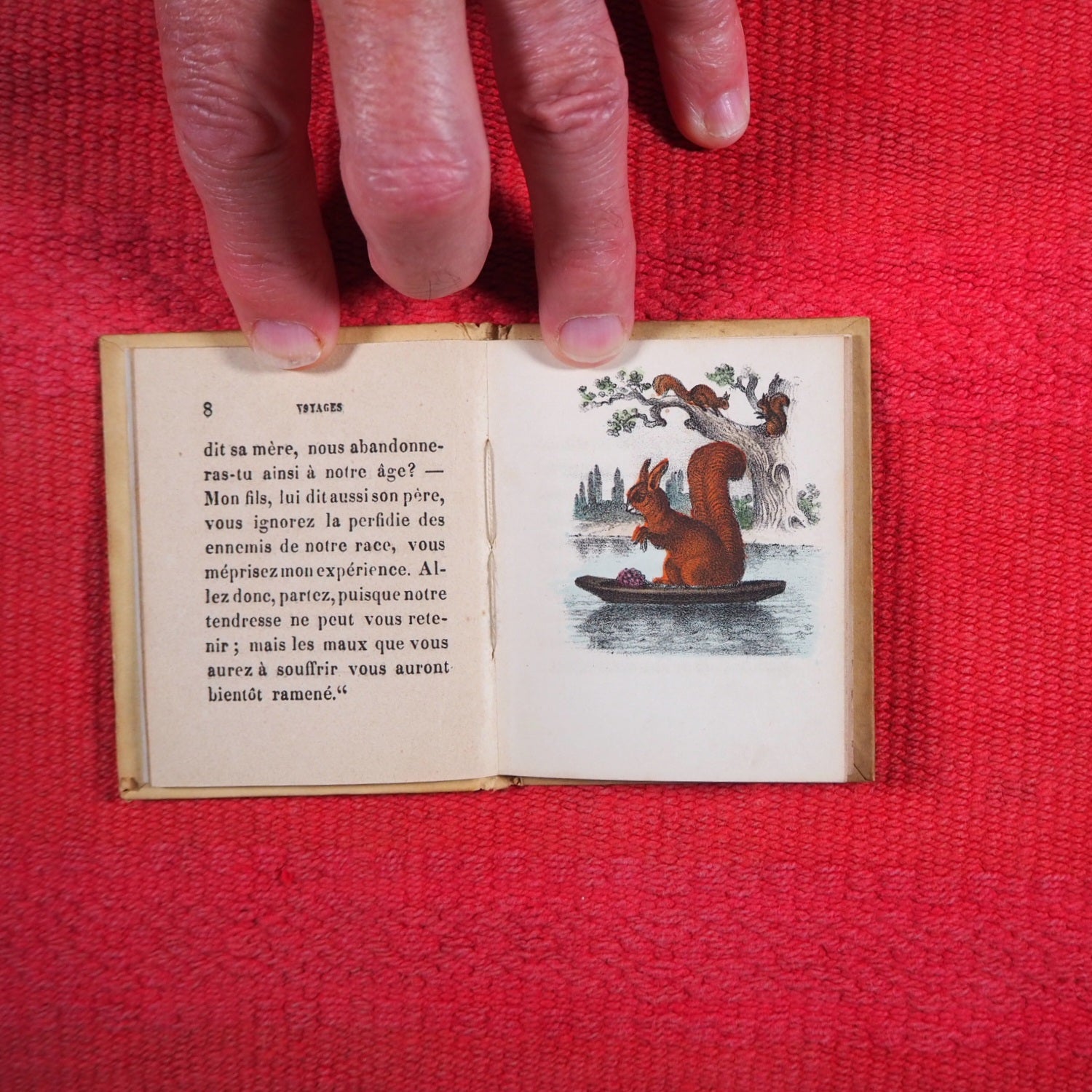 Circa 1834. 24 printed pages. 12 charming hand-colored lithographic plates. 72 x 88mm. Original, printed, cream boards (very slight age-toning). Concerning a disobedient young squirrel's trials and tribulations. English original first published by George W. Burgess circa 1832/1833 in New York. Not in Bondy, nor Spielmann, nor Welsh. WorldCat locates two sole copies worldwide (Pierpont Morgan & Princeton Libraries). This copy is somewhat rare and undoubtedly charming. Seller Inventory # 5330