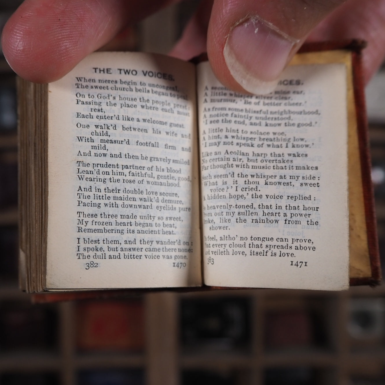xiv, 1472 printed pages -four volumes in one; separately and concurrently paginated (some corners slightly creased). Each of the four sections (Poems; Princess and Maud; In Memoriam and other Poems; Idylls of the King and other poems) opens with a black & white illustration and there are other additional black & white illustrations. 1924 tiny inscription of former owner on front free endpaper. Earlier owner's tiny stamp on recto of blank preliminary page. 34 x 53mm. Original orange cloth with lettering and spine decoration in silver (inner hinge cracked; slightly age-darkened and hint of a vertical crease in the spine's centre; page block slightly dust-toned). Provenance: L. and V.L. Davies (no further information available). Bryce published in 1905 a four-volume edition of Tennyson, which was followed by, or published simultaneously with, this one-volume edition. Bondy refers to this edition as "rare." Garbett only refers to copies in green cloth, blue roan or morocco and says that it is often found in a broken state. Spielmann only located English Idylls and In Memoriam individually (Spielmann, 474, 475). Garbett, 38. Bondy, 115. Welsh, 6652. No copies found in WorldCat. Seller Inventory # 5320