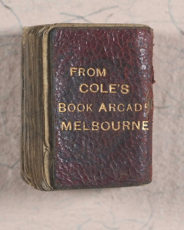 On this promotional edition of the 'smallest dictionary in the world' there is "COLE'S ENGLISH DICTIONARY" on the front cover and , but not in every example, "FROM COLE'S BOOK ARCADE MELBOURNE" on the back -one of three Australian promo editions known. Cole's Arcade was a heavily promoted late Victorian bookshop, the largest in the world at that time.