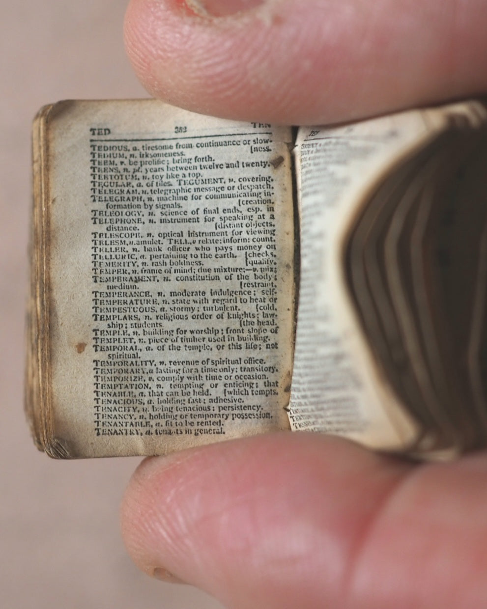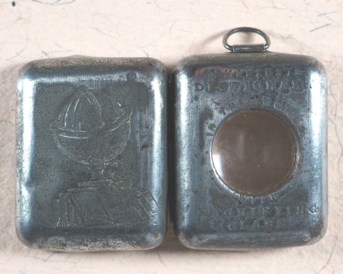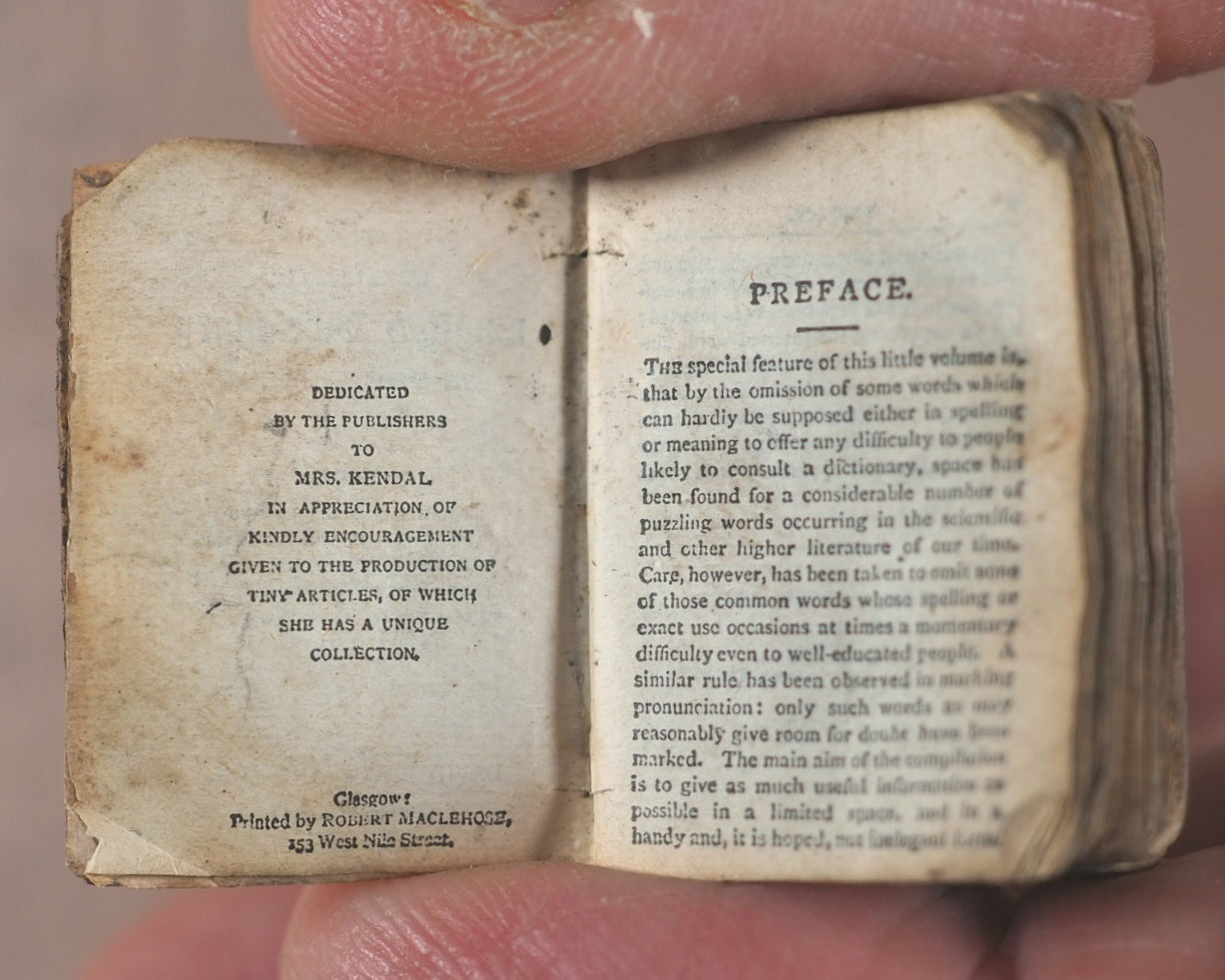 Smallest English Dictionary in the World. Comprising: besides the ordinary and newest words in the language, short explanations of a large number of scientific, philosophical, literary and technical terms. Bryce, David & Son. Glasgow. Circa 1896. Original metal case with magnifier and loop at top. 384 pages.Engraved portrait of Johnson. "Cole's English Dictionary" - front cover and "From Cole's Book Arcade Melbourne" - rear cover. Many leaves with creases; corners slightly worn. Dirt specks in places. Inner hinges cracked but holding firm. Rear endpapers with illegible ownership inscription. 19 x 28 mm. Original red leather. Rubbed and slightly worn - richly patinated. Corners and spine slightly bumped.