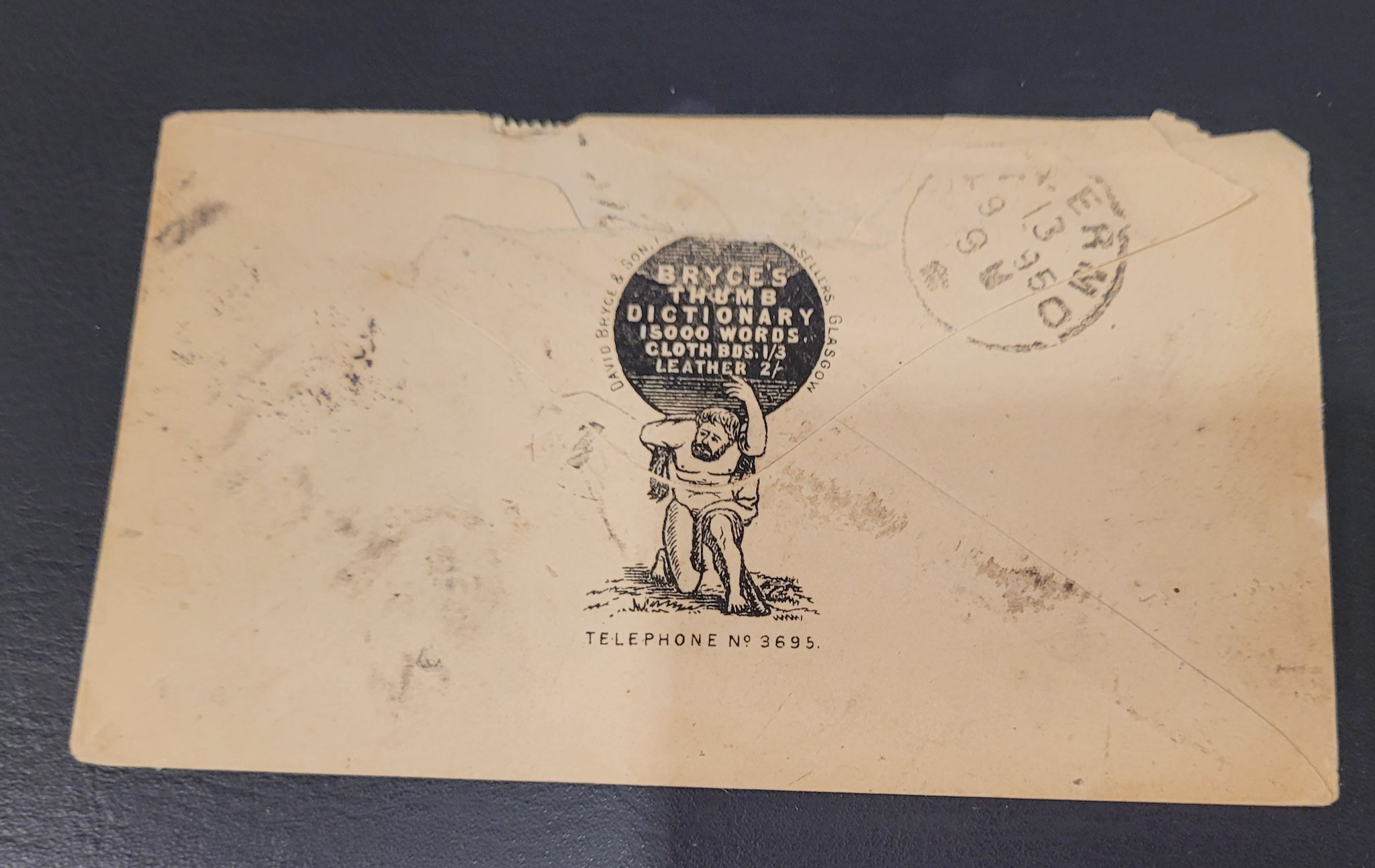 Posted to Palermo Italy. Three stamps, franked. Five facsimilie books on front to left side and top. On rear, 'Atlas' hold a sphere within which is printed Bryce's Thumb Dictionary 15000 Words Cloth BDS 1/3 Leather 2/-; and beneath Telephone No. 3695. And above 'David Bryce & Son Booksellers Glasgow