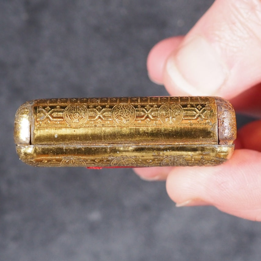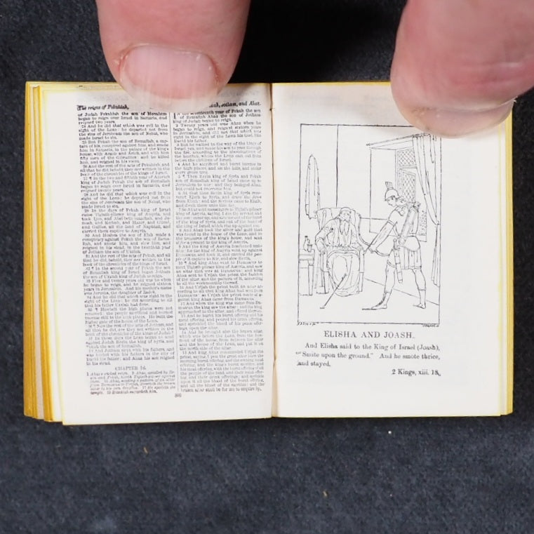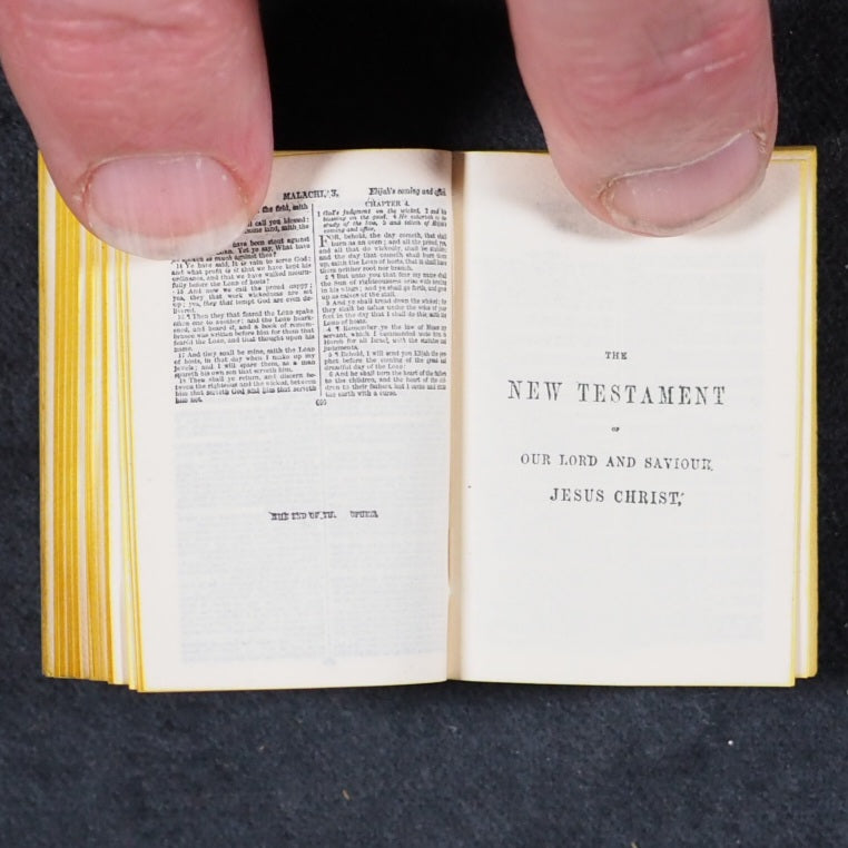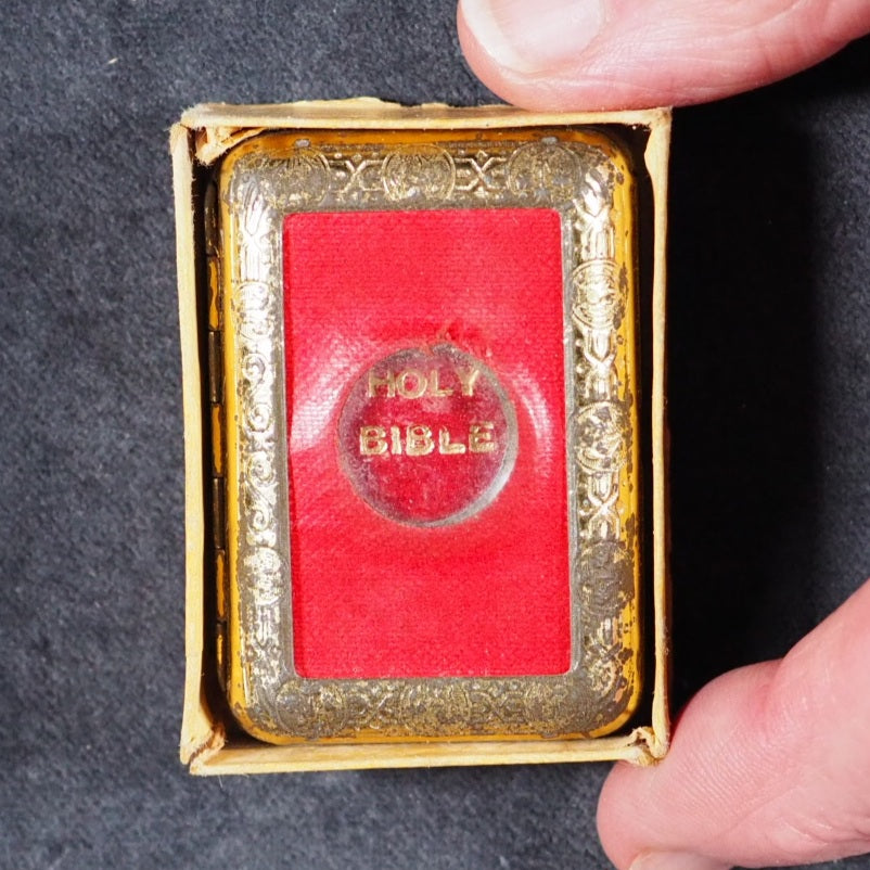 Holy Bible containing Old and New testaments: Translated Out Of The Original Tongues. Glasgow: David Bryce And Son. London: Henry Frowde. Oxford University Press Warehouse, Amen Corner. 1901. 2nd Edition. 876 printed pages. Printed in two columns. With frontispiece & 27 engraved plates from drawings by Charles Bell Birch. The title bears the words "Printed by Authority"; and on verso is a copy of the licence granted to D. Bryce to publish this edition dated 1901, an edition of 100,000 copies. Printed upon the very thinnest Oxford India Paper ever made, and with twenty-eight full-page illustrations of biblical scenes by C. B. Birch, A.R.A. Complete with uncommon original box. Printed label, 'Smallest Bible in the World. Complete and Illustrated' (slightly chipped; box corners split; residue of tape around edges). All edges yellow.Original black glossy endpapers. 30 x 46 mm. Original red roan with gilt 'Holy Bible' in circle on spine. Original gold-laquered Jahncke's Patent tin with Prince of Wales feathers and Thistles (exterior gilt layer rubbed away in spots), upper cover with removable inlaid red cloth surrounding a central magnifying glass loop (very slight wear).David Bryce & Sons of Glasgow was active around the turn of the 19th century; & took an active interest in the latest technological advances in photolithography and electroplates to allow larger volumes to be reduced to the smallest imaginable size. The result is that their miniature publications are prized for the clarity and legibility of their texts. With the aid of Glasgow University Press, the firm issued the earliest complete miniature Bible in 1896, at the time the smallest complete bible ever printed; it comprised 876 pages printed on the finest India paper, measuring just over 1 inch square and was a reduced facsimile of the Oxford sextodecimo edition. David Bryce produced these tiny Bibles and many were presented to serving soldiers throughout the British Empire, easily carried on campaigns, including The Boer War which was being waged at that time with many later carried by soldiers in the First World War. They also published a 1901 reprint and also issued it in a specific binding as a souvenir of the Glasgow International Exhibition at Kelvingrove. All copies were sold with a small magnifying glass. Bondy, 108. Spielmann, 24. Welsh, 562. A scarce little marvel of bookmaking. WorldCat lists seven UK institutional library holders. 162 firsts2024