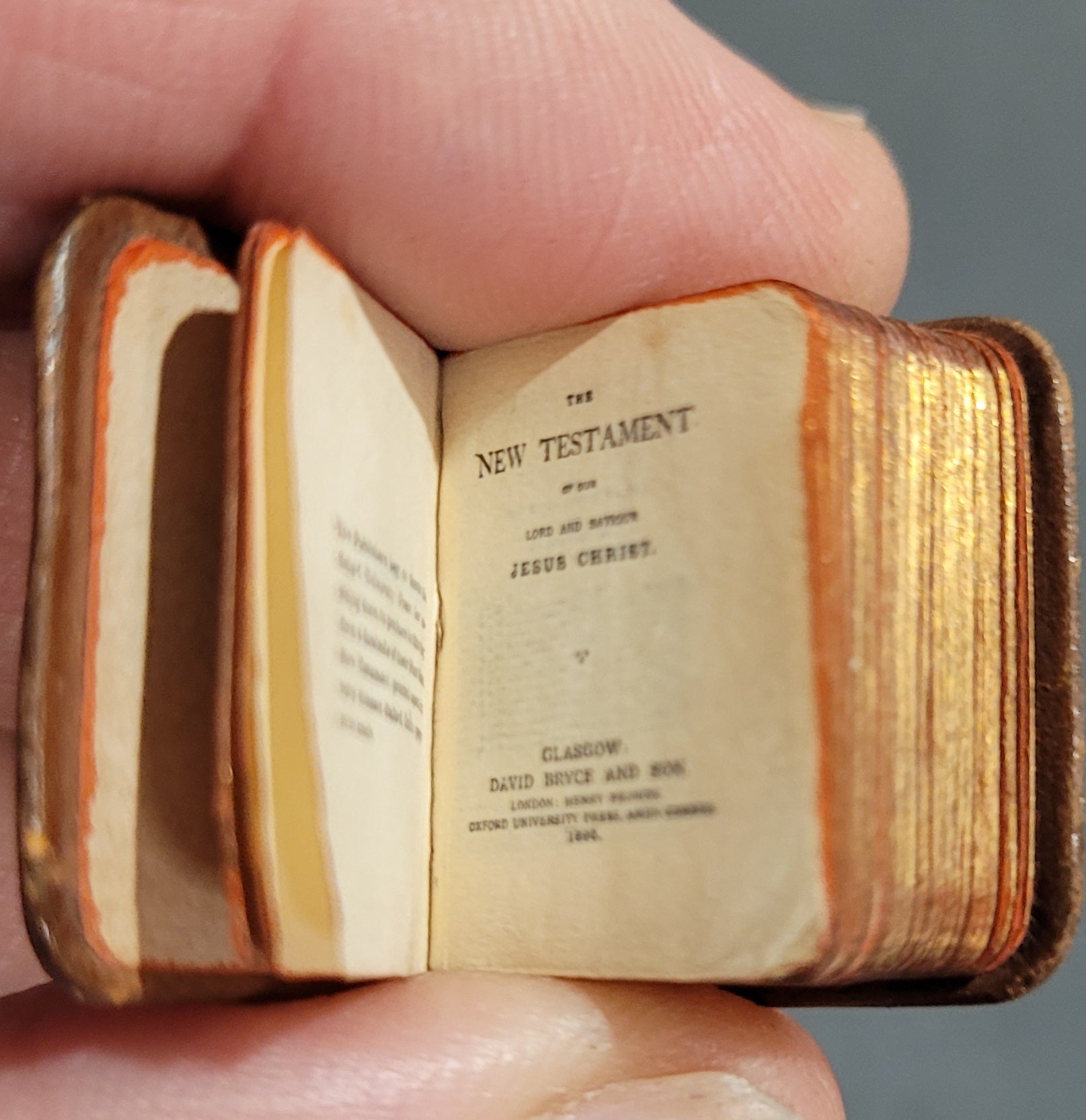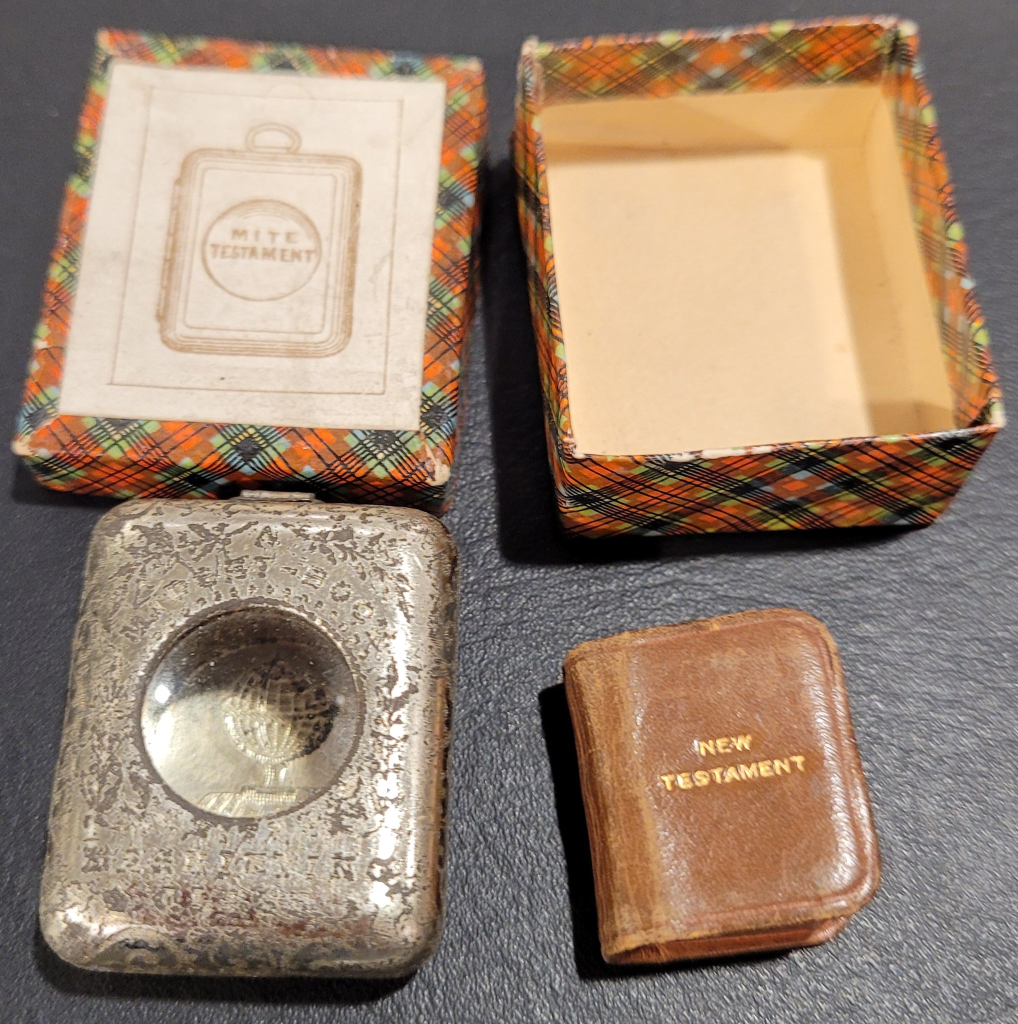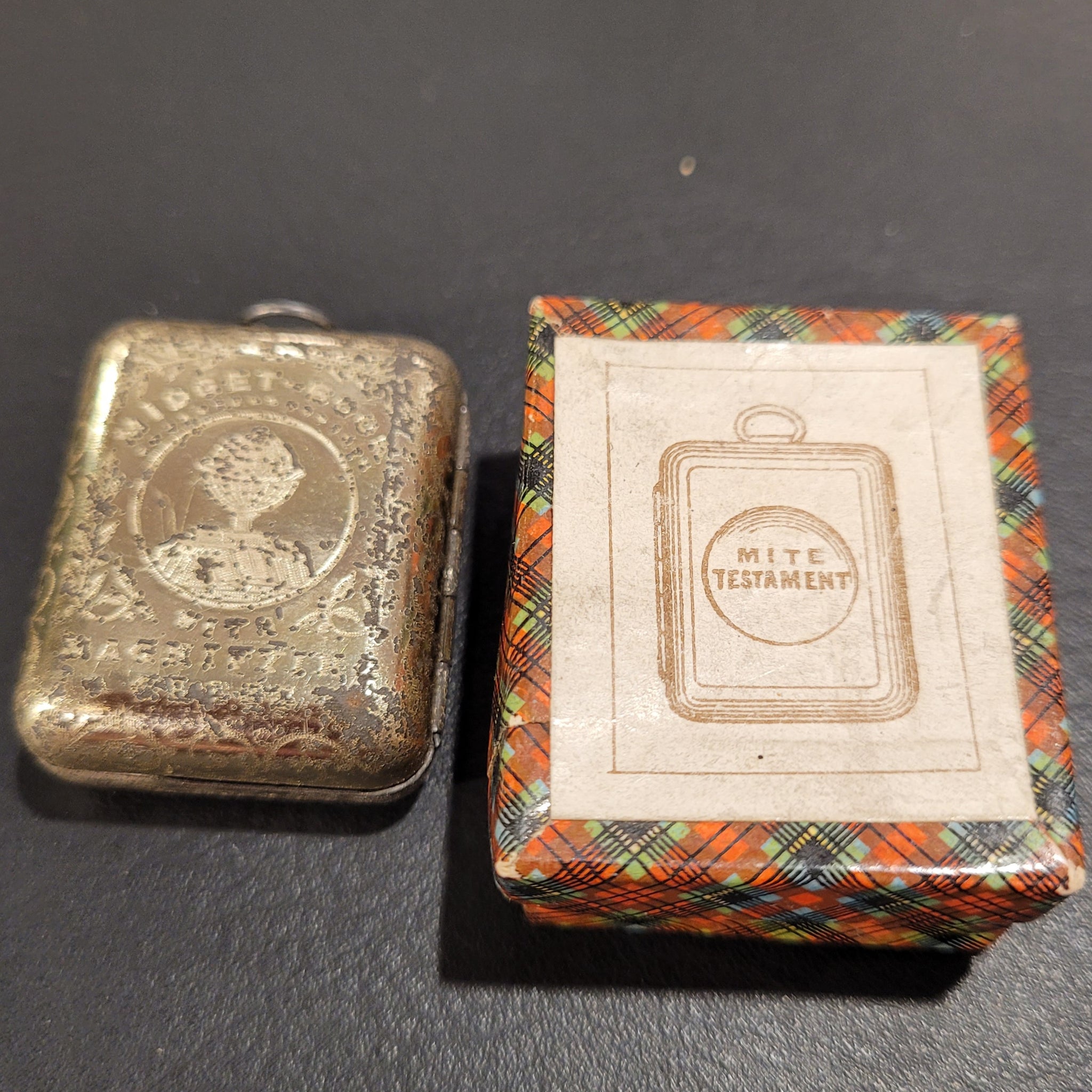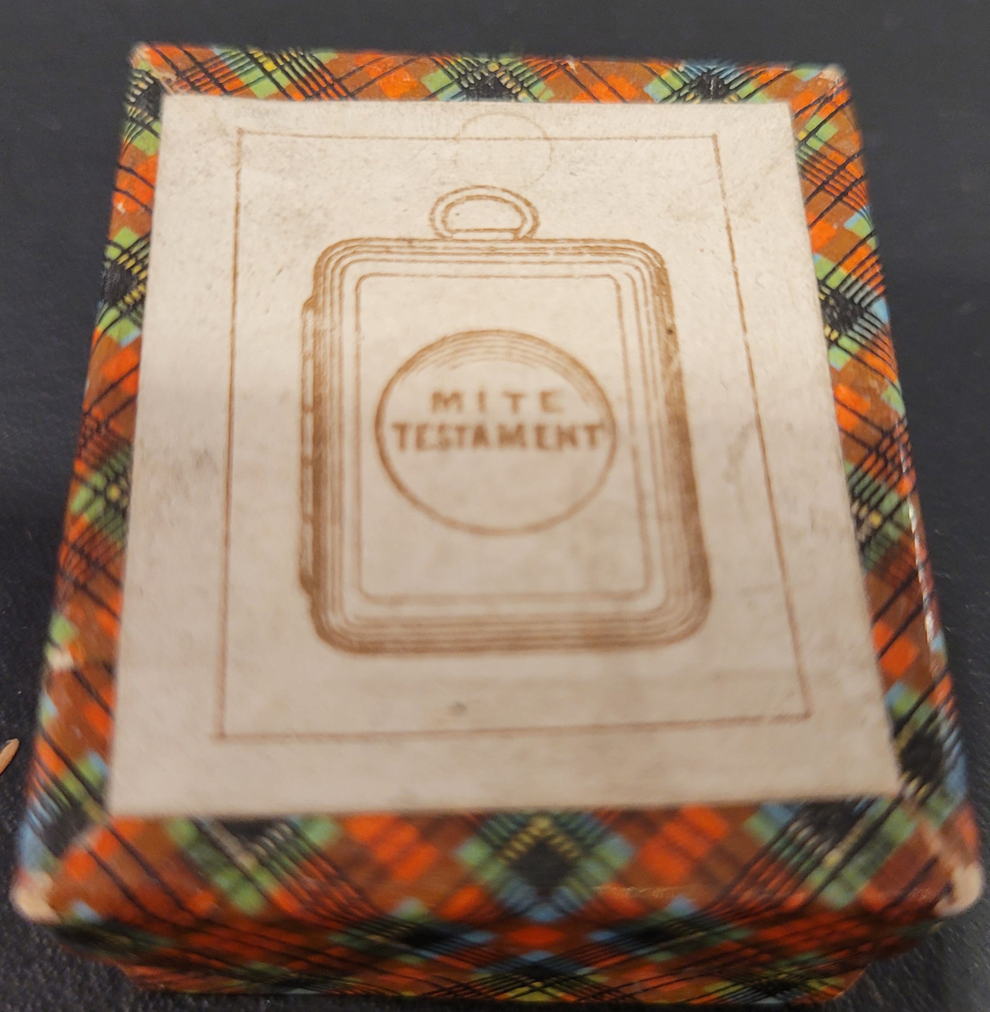 Contained in a white metal hinged locket inscribed Midget Book With Magnifier- magnifier inset to lid. This housed in an original tartan covered cardboard box with 'Mite Testament' on cover.