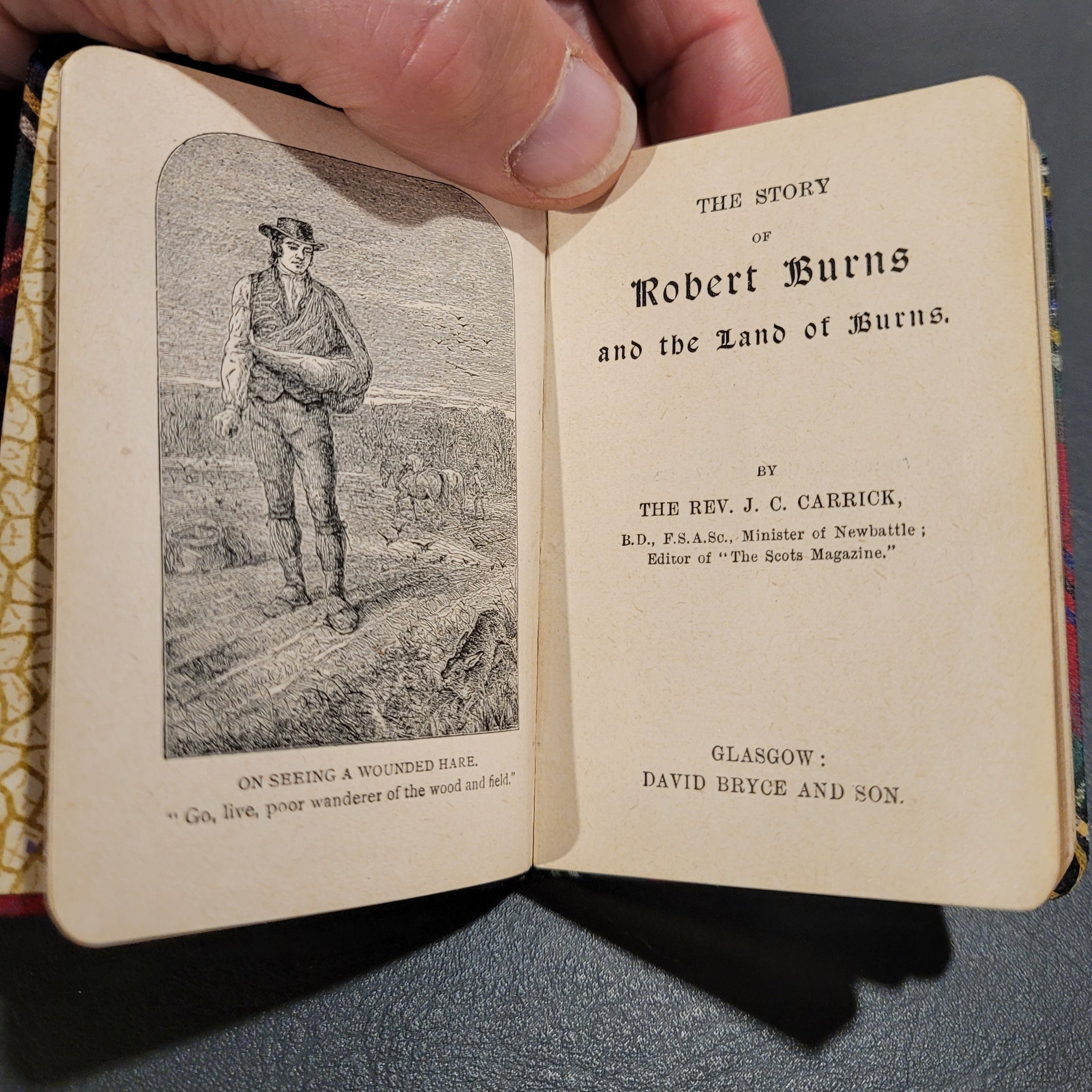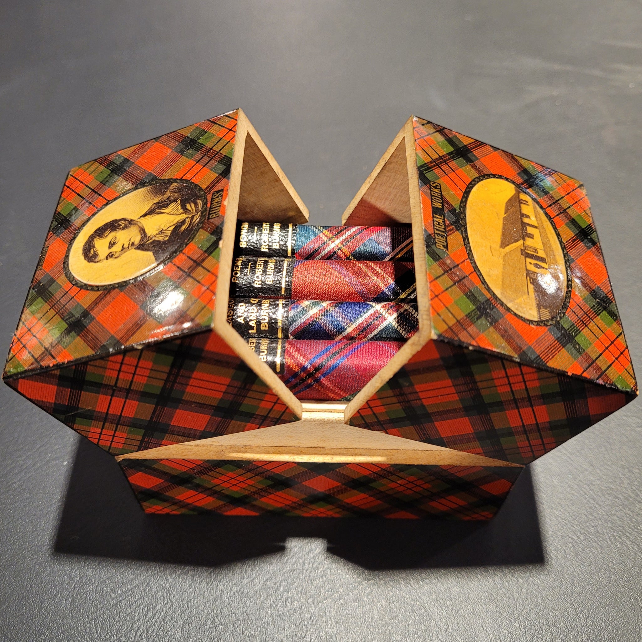 titles to spines on black. 3" x 2". They are housed in a tartan covered Mauchline box with a double hinged lid which has a portrait of Burns on the upper half and a view of his cottage in Alloway, Ayrshire on the lower half. Gilt title on the hinged lids 'Burns