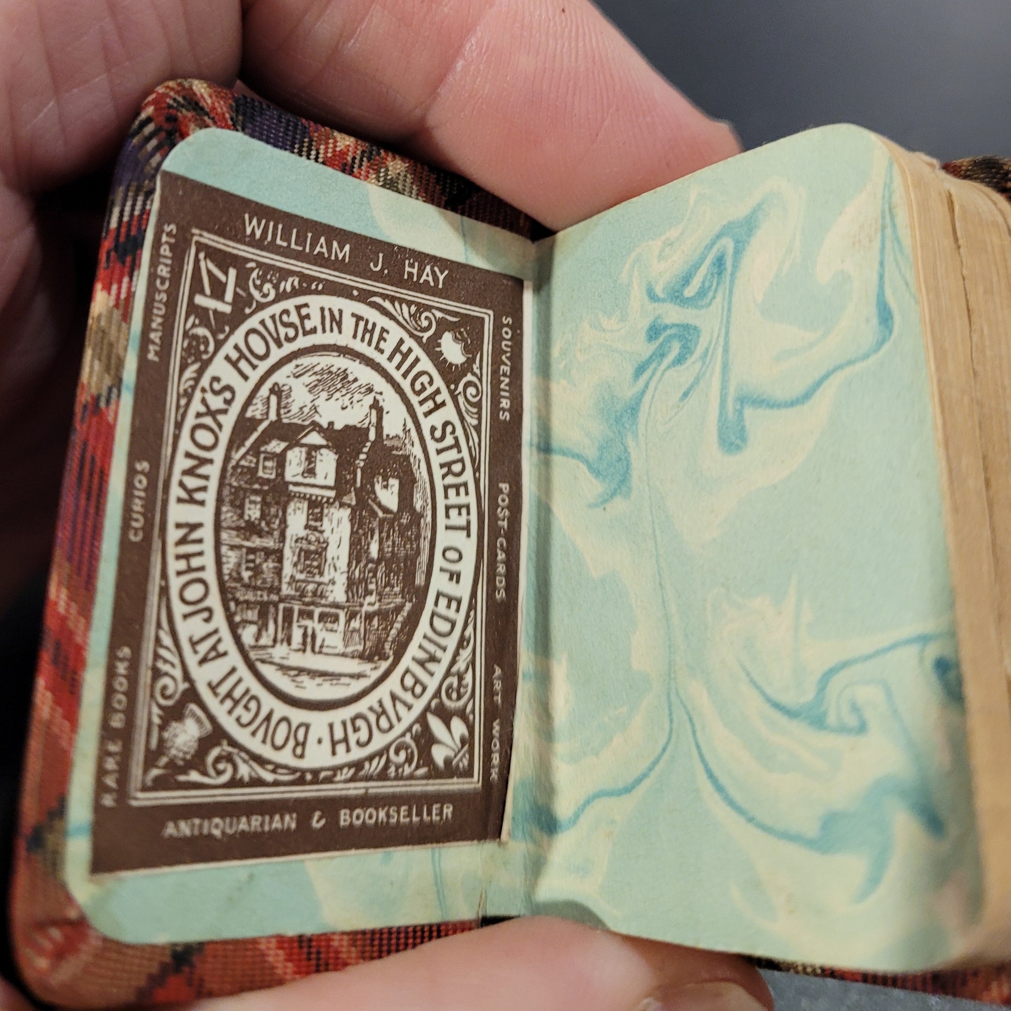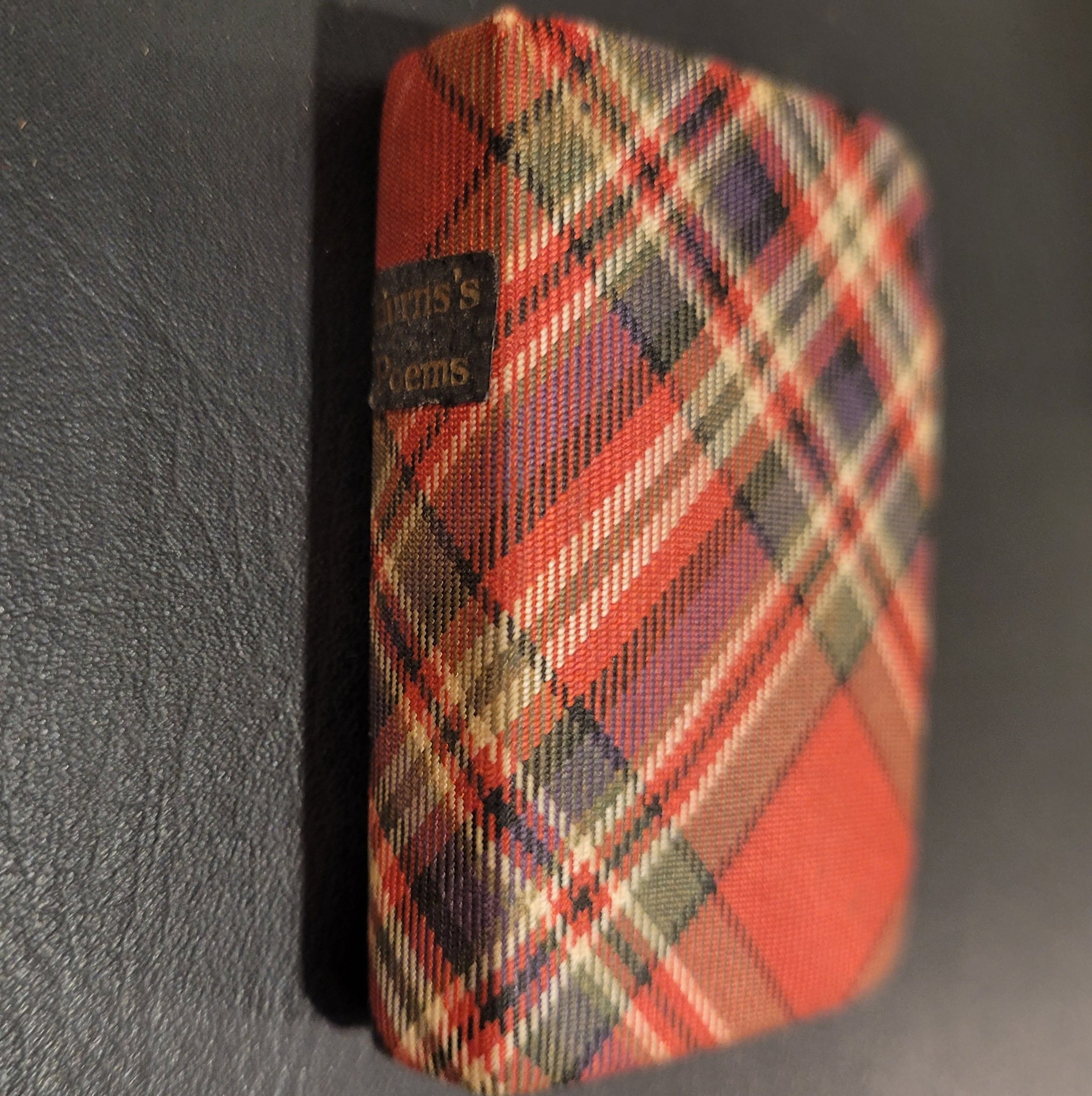 Bound in silk tartan (MacFarlane) with black title label to spine. Illustration of The Cottar' opposite main title page. Label inside front cover of William J. Hay Antiquarian & Bookseller Bought at John Knox's House High Street Edinburgh.