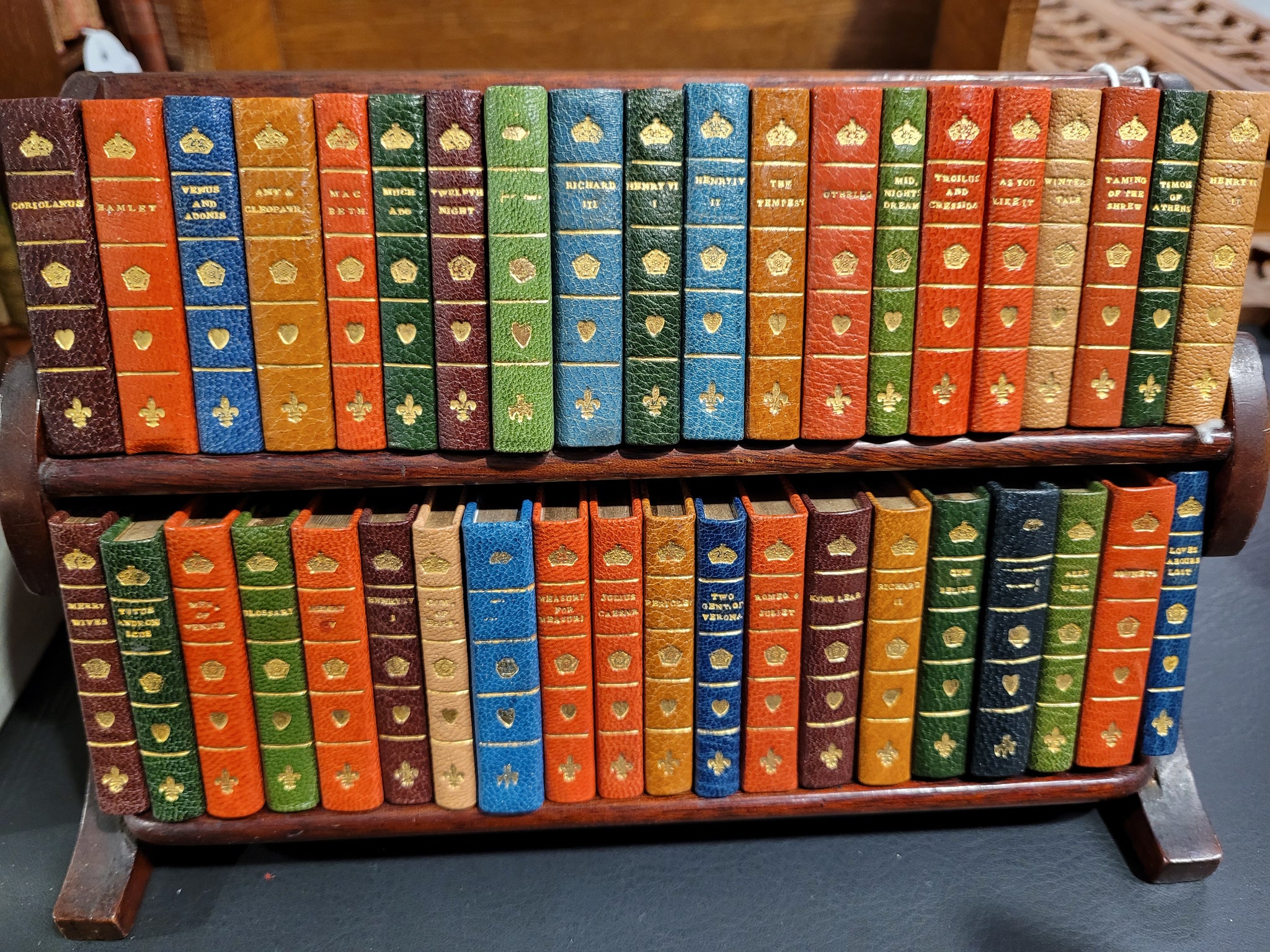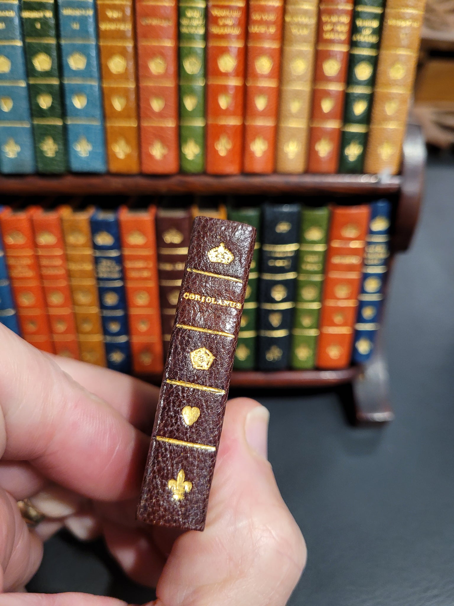 volumes. Dedicated to the actress Ellen Terry, this complete set of Shakespeare was part of a series of literary sets or individual volumes dedicated to her. Of the Ellen Terry series, Louis Bondy wrote that these volumes are "Bryce's greatest achievement as a leading promoter of miniature books," and, in particular, he describes the Shakespeare as "the most prodigious of these sets." (Bondy, p.114). Most of the sets were printed in 1904. Included are all the plays, the sonnets, a biographical sketch, and glossary. Bound in gilt stamped Harlequin morocco (which have been re-bound) with gilt stamped decoration and title to spines,