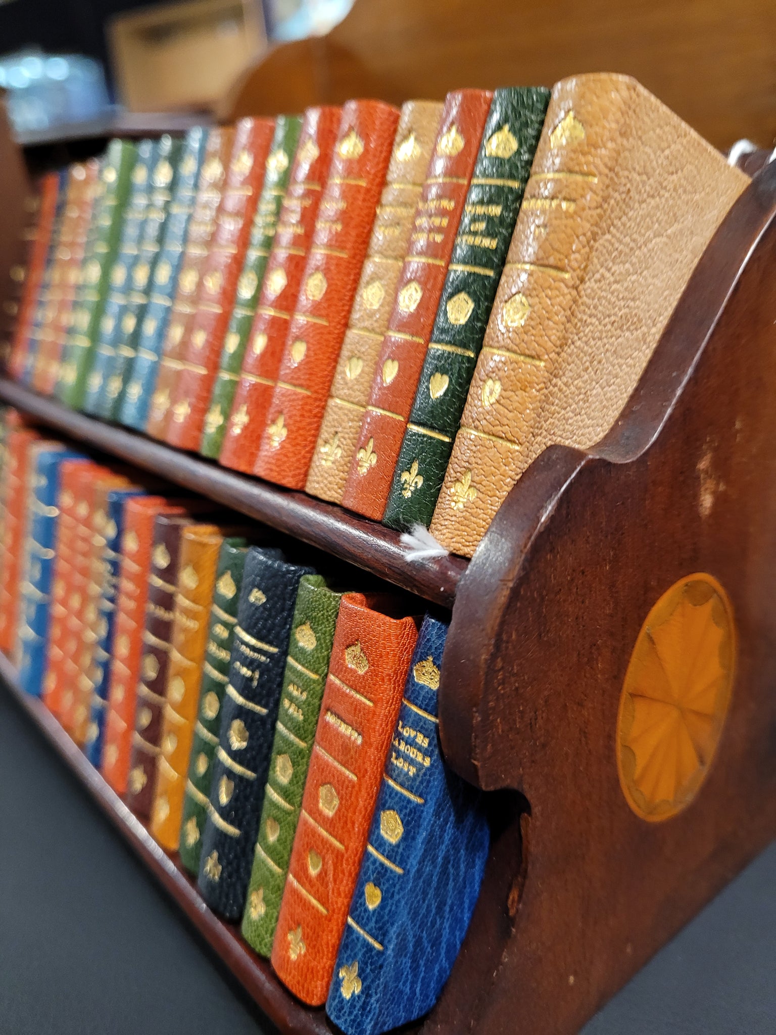 This is a re-bound set Housed in a custom made period wooden two-tier bookcase, with shell-style marquetry inlay decoration to each end.