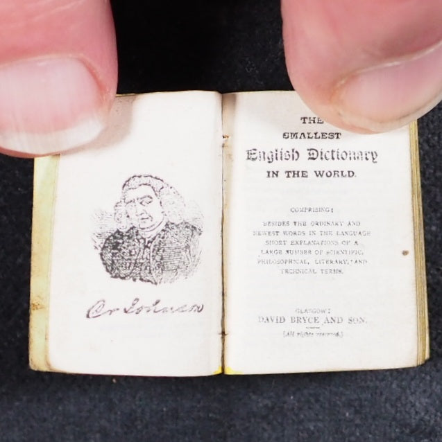 Smallest English Dictionary in the World. Comprising: besides the ordinary and newest words in the language, short explanations of a large number of scientific, philosophical, literary and technical terms. Bryce, David & Son. Glasgow. 1893. 384 pages.Printed on finest India paper. Portrait frontispiece of Dr. Johnson. Mite series. Set in 1-1/2 point type. Printed by Robert Maclehose, Glasgow. ""Dedicated by the publishers to Mrs Kendal in appreciation of kindly encouragement given to the production of tiny articles, of which she, has a unique- collection."All edges yellow. Contemporary in ownership singature on front free endpaper, dated 1909. 19 x 28 mm. Original red morocco."English Dictionary" front cover and 'Pears' on back cover. Fully hallmarked silver locket, hallmarks in 2 places Sampson Mordan & Co,1894 . Magnifying Glass and original silver loop (some mild scratches and a little tarnished). 19 x 28 mm. Original red morocco (slightly thumbed). Bryce offered their dictionaries in a choice of Metal cases (1s.3d.), Tartan (1s.6d.), Yapped leather (2s.0d.), Silver gilt (2s.6d.), Gilt or engraved (3s.6d.) & Silver hallmarked locket (7s.6d.) -this example was the most costly and by far the hardest to find. This is one of a number of minuscule books published by Bryce by the process of photographic reduction. They are all legible with a magnifying glass and the equivalent of 1 1/2-point. This is number 18 in Ruth Adomeit's List of 32 Basic Books for the Serious Collector. Although "thousands of these dictionaries were published, they are now becoming distinctly scarce and command steadily rising prices" [Bondy]. Bondy, 106. Garbett, 25. Pistner, B233:7. Spielmann, 464. Welsh, 2406. 63 firsts2024
