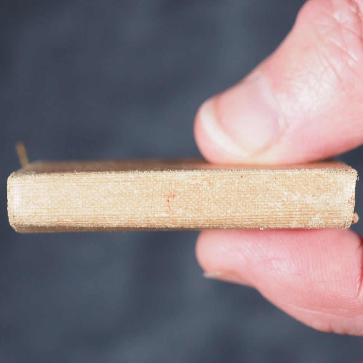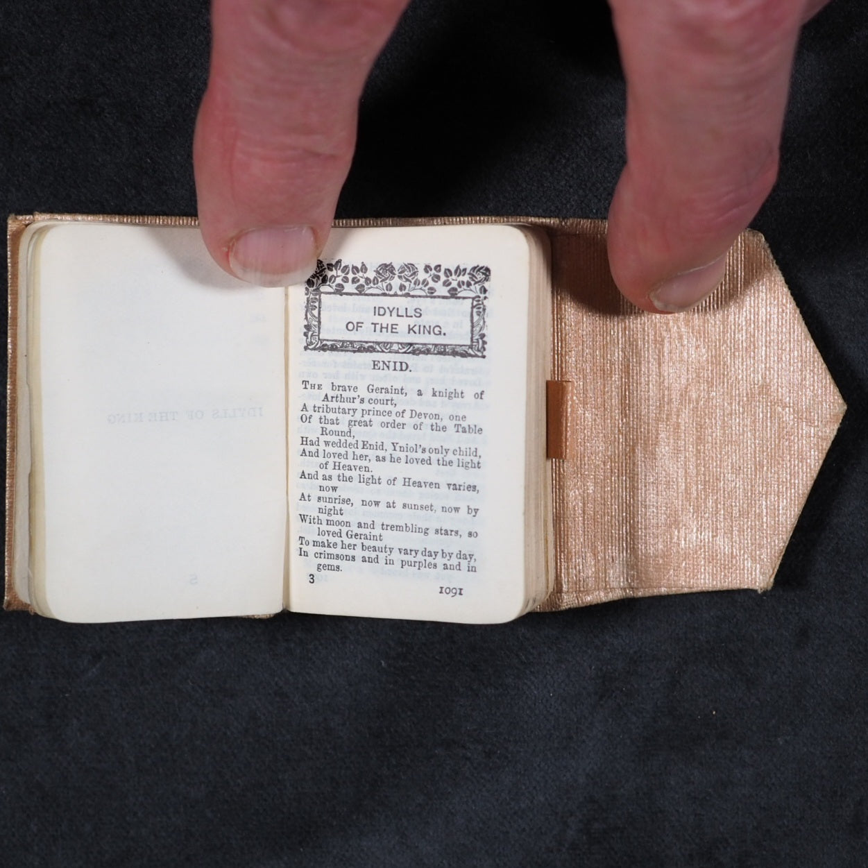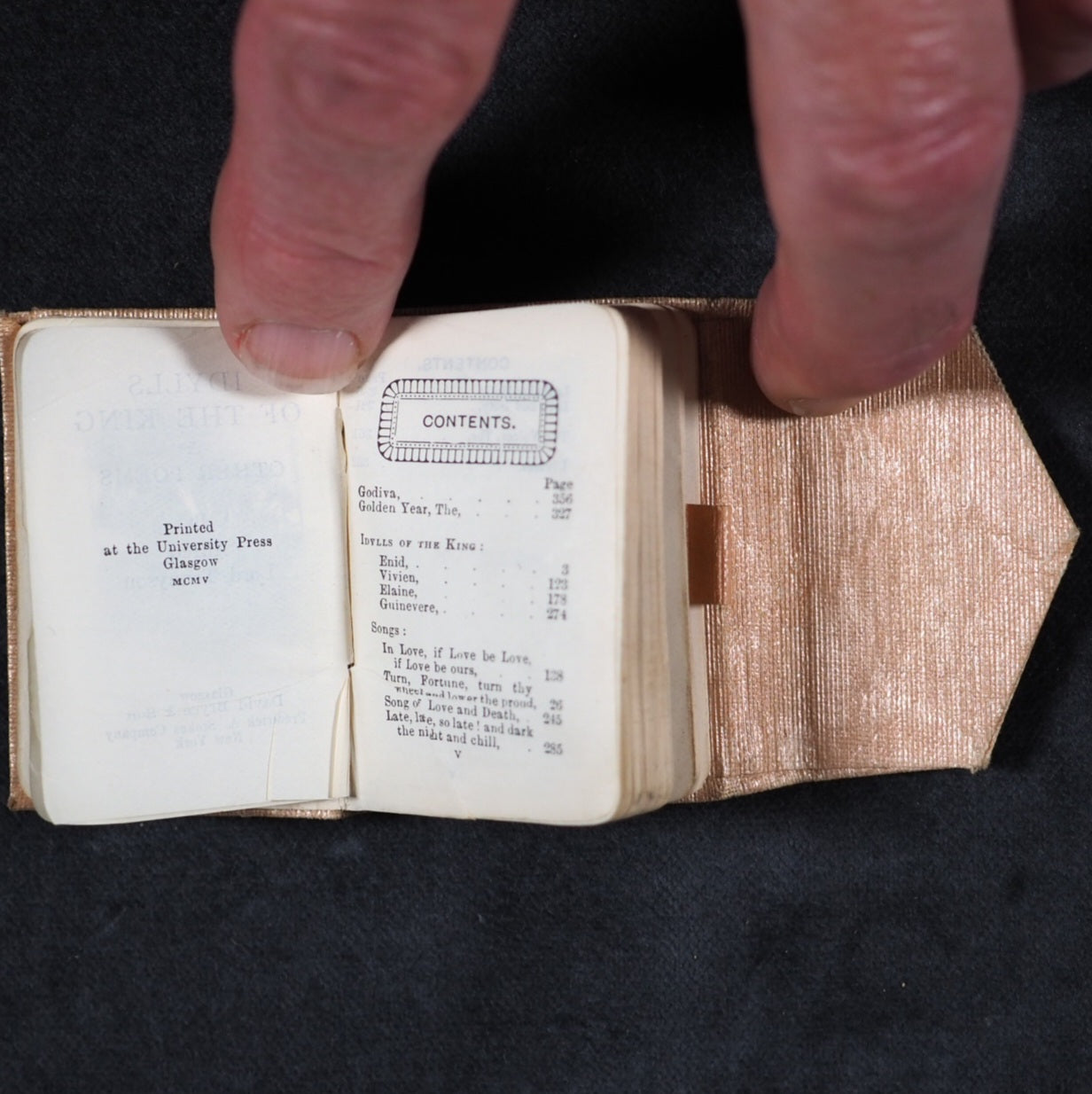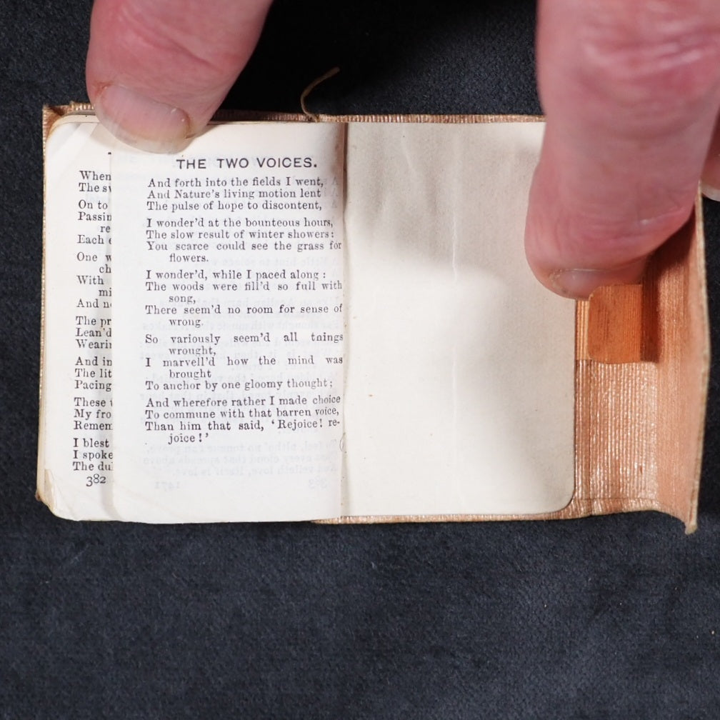 Tennyson, Alfred Lord. Idylls of the King, and other poems. Bryce, David & Son Glasgow. 1905. vi, 1091-1471, [1] printed pages. Frontispiece, Printed at the University Press, Glasgow. India paper. Rounded corners. All edges gilt. 40 x 59 mm. Original peach silk wrap-around wallet style binding (slightly dulled). Final individual volume of rare four volume set. Unusual, especially in this wallet-style pink silk binding. OCLC, 298256838. WorldCat locates 3 copies worldwide (Brian Sutton-Smith, Virginia and Indiana Universities). 193 firsts2024