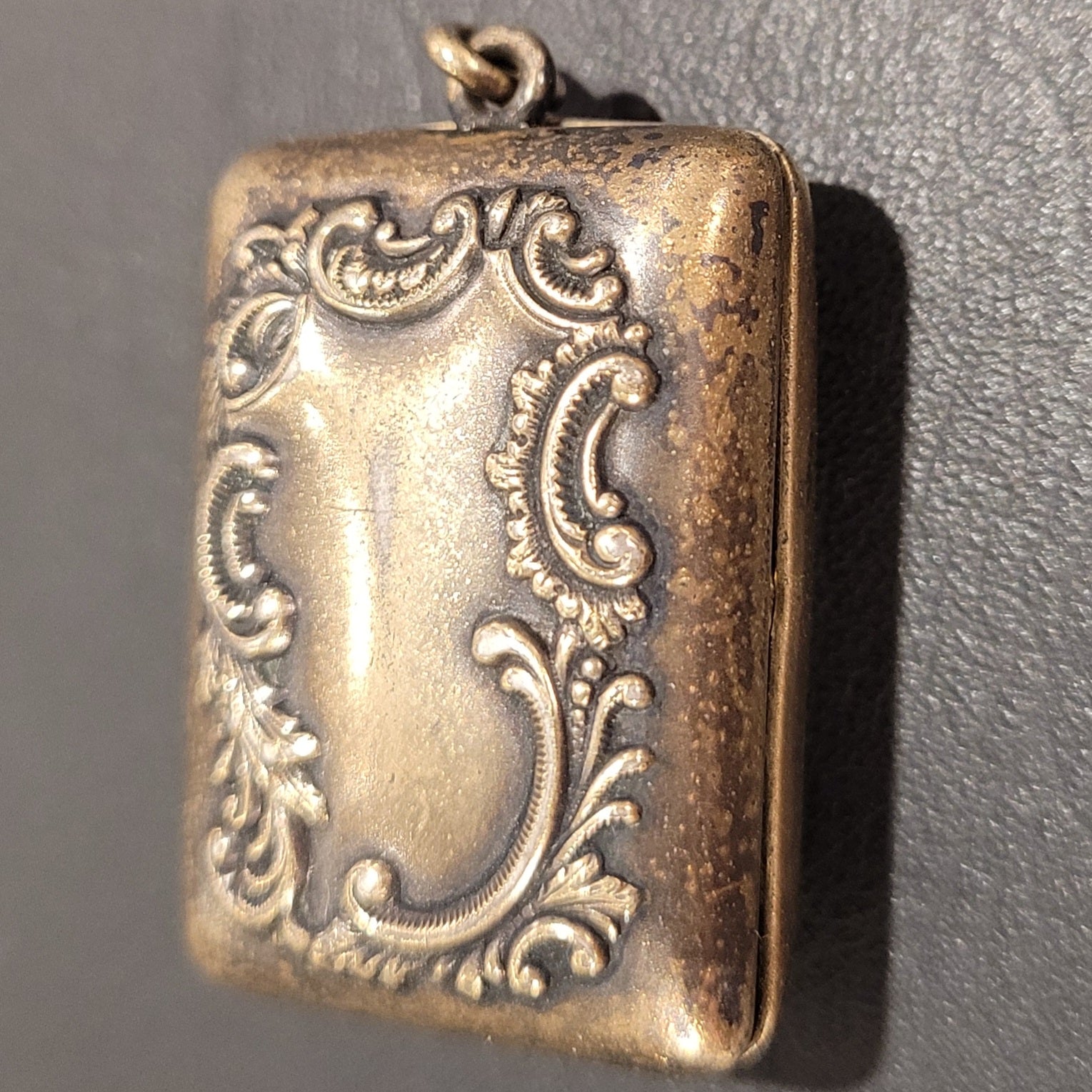 Bound in red leather with title in gilt on front cover, Housed in a white metal (Sterling silver) hinged locket with embossed floral design around inset magnifier and to rear.