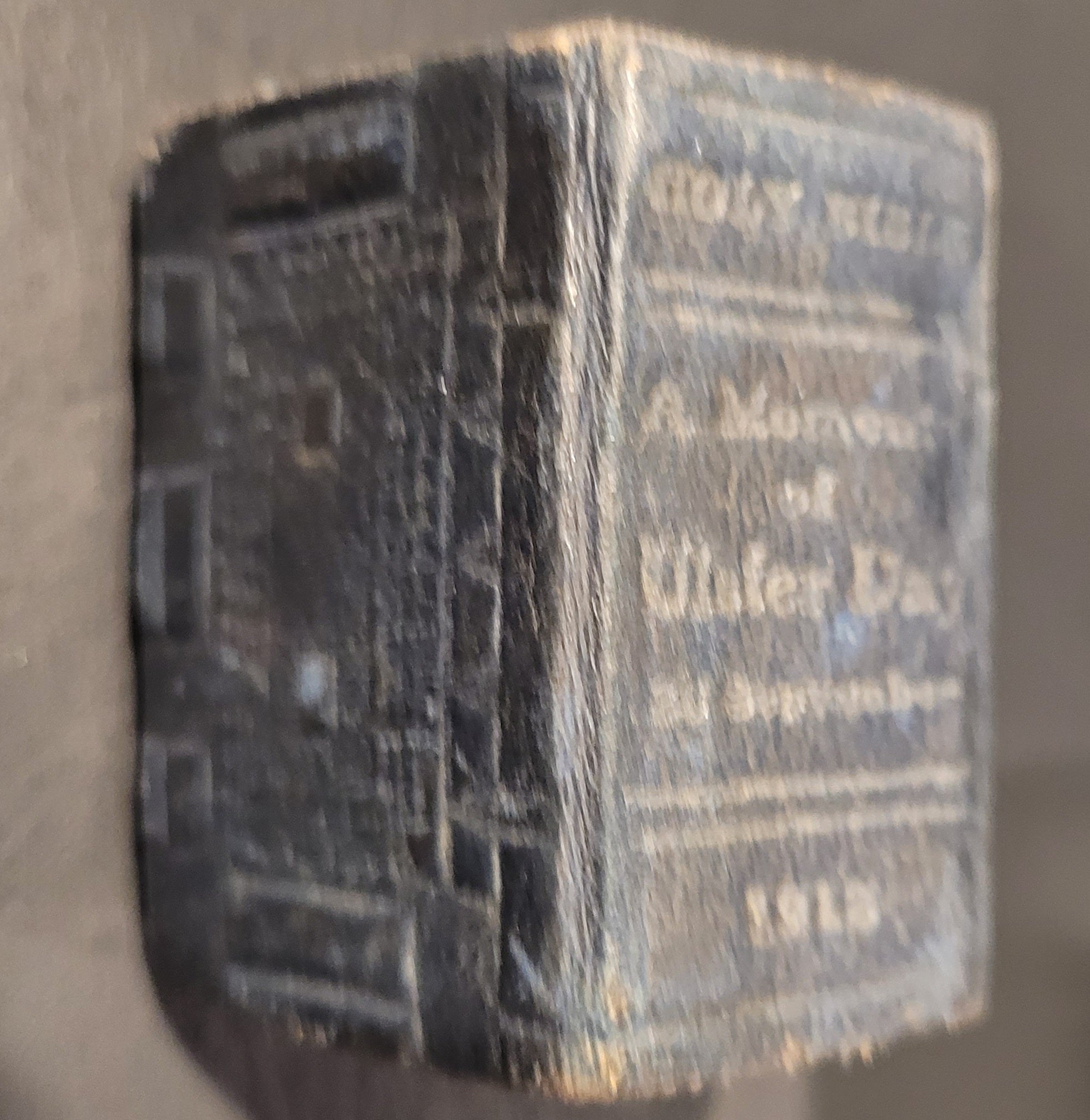 Bound in dark blue leather and extensively tooled front and rear. Spine has two bars embossed with Holy Bible above and 1912 below. Between is written 'A Memory of Ulster day 28 September. Magnifying glass in leather, slipped into sleeve at rear of bible. Inside front cover is a facsimile of 'Ulster's Solemn League and Covenant with a Red Hand in Shield, to top left. Minor age wear otherwise in good condition.