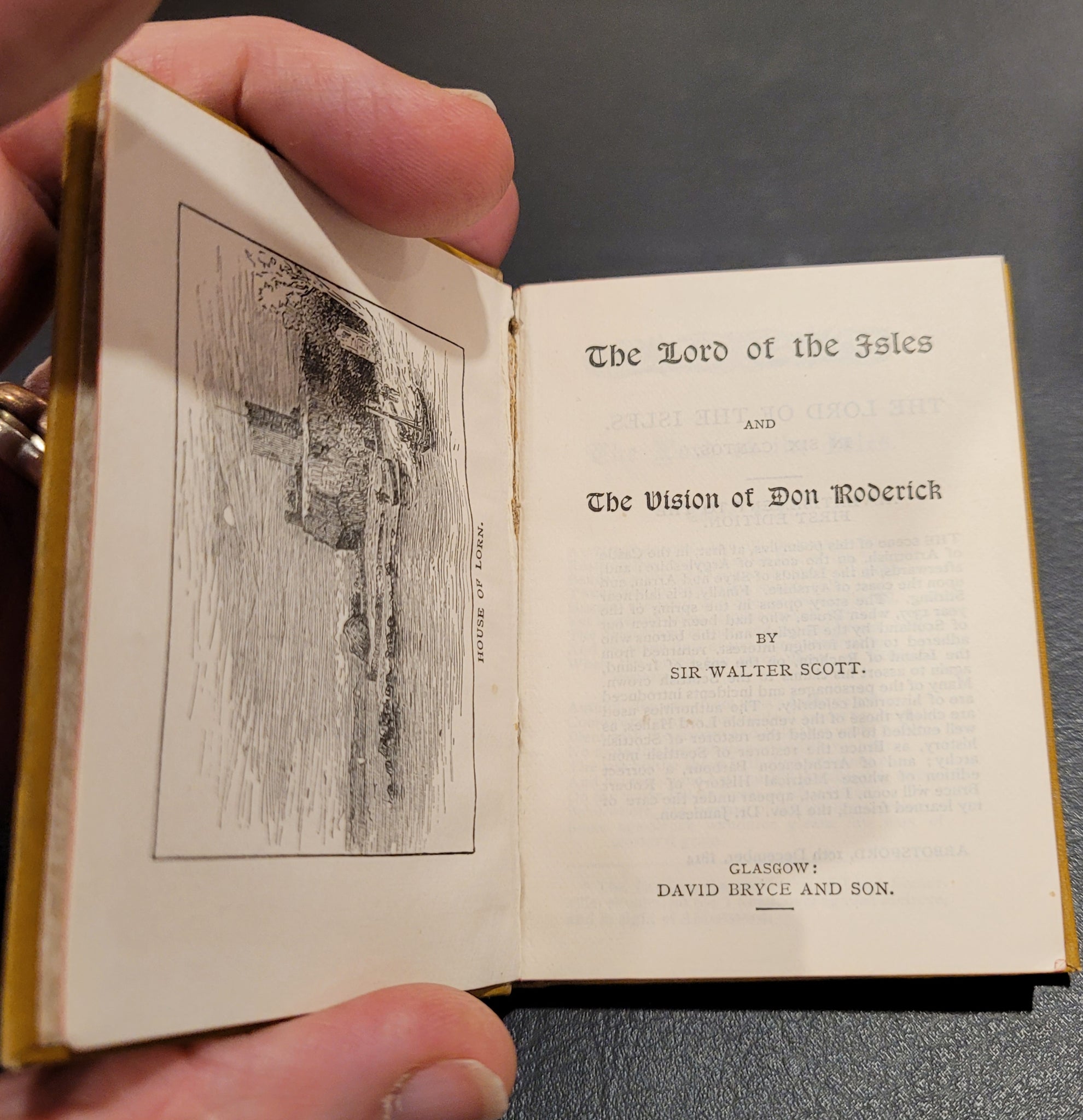 They are housed in a sycamore Mauchline box with a double hinged lid that is tartan covered and has a sepia statue of Scott on upper half and a view of Abbotsford on lower half. Gilt title on the hinged lids 'Scott's Poetical Works