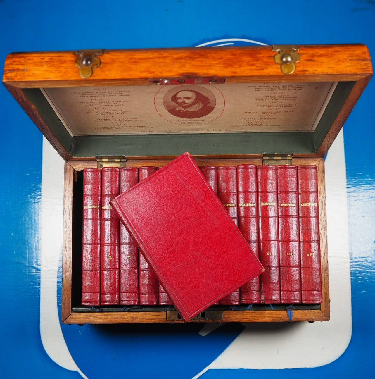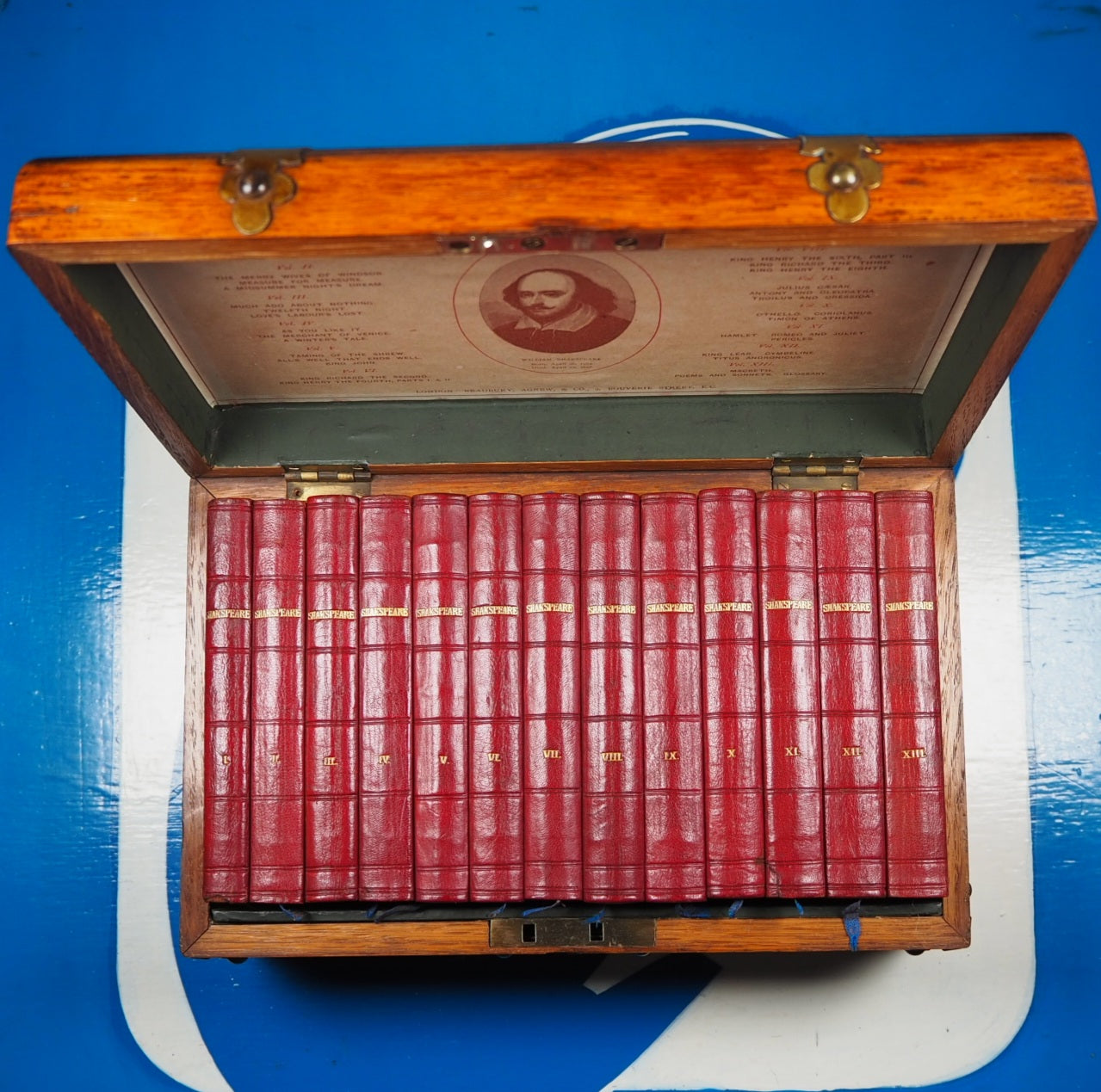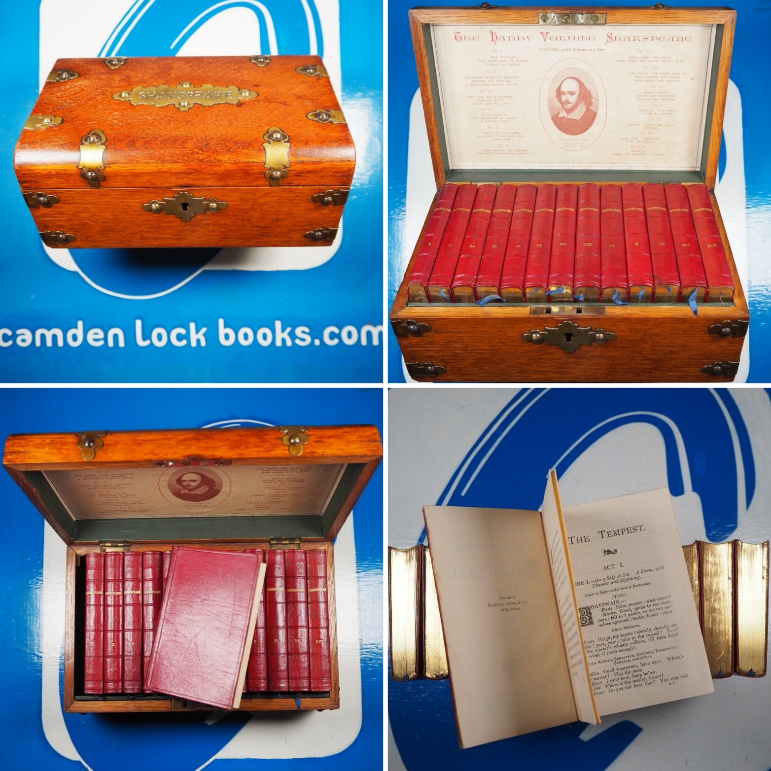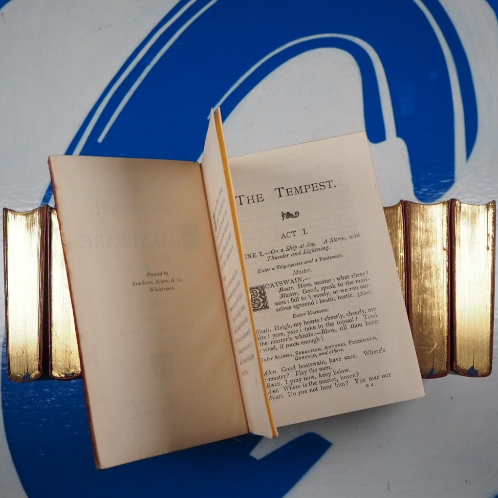 Complete set of 13 volumes in original oak, brass bound case. Each act has a decorated initial. Preface to v. 1 by "Q.D." 8 x 12 cm. Publisher's full ruby morocco binding, spines lettered in gilt (very slight damage to spines of volumes 1, 9 & 10). All edges gilt. Blue silk place-keepers, in original wooden chest (24 x 15 x 10 cm.) with printed paper label ("13 elegantly printed volumes in a case") to interior of lid detailing contents of volumes. Original patinated brass fittings to dome-topped box and "Shakespeare" in brass hand-cut letters across the lid. Box fittings in the Gothic Revival style of Augustus Pugin and George Gilbert Scott (portraying pre-industrial medieval society as a Golden Age). Original brass lock lid section has been slightly damaged (please see pictures), but still closes correctly. Same setting of type as the "handy-volume" editions of Shakespeare published by Bradbury, Evans & Co. beginning 1866.  v. 1. Tempest ; Two gentlemen of Verona ; Comedy of errors. v. 2. Merry wives of Windsor ; Measure for measure ; Midsummer night's dream. v. 3. Much ado about nothing ; Twelfth night ; Love's labour's lost. v. 4. As you like it ; Merchant of Venice ; Winter's tale. v. 5. Taming of the shrew ; All's well that ends well ; King John. v. 6. King Richard II ; King Henry IV. v. 7. Henry V ; King Henry VI, part 1-2. v. 8. King Henry VI, part 3 ; King Richard III ; King Henry VIII. v. 9. Julius Caesar ; Antony and Cleopatra ; Troilus and Cressida. v. 10. Othello ; Coriolanus ; Timon of Athens. v. 11. Hamlet ; Romeo and Juliet ; Pericles. v. 12. King Lear ; Cymbeline ; Titus Andronicus. v. 13. Macbeth ; Poems and sonnets. Glossary. Few of these wonderful complete stylised boxed sets survive intact. Seller Inventory # 5185
