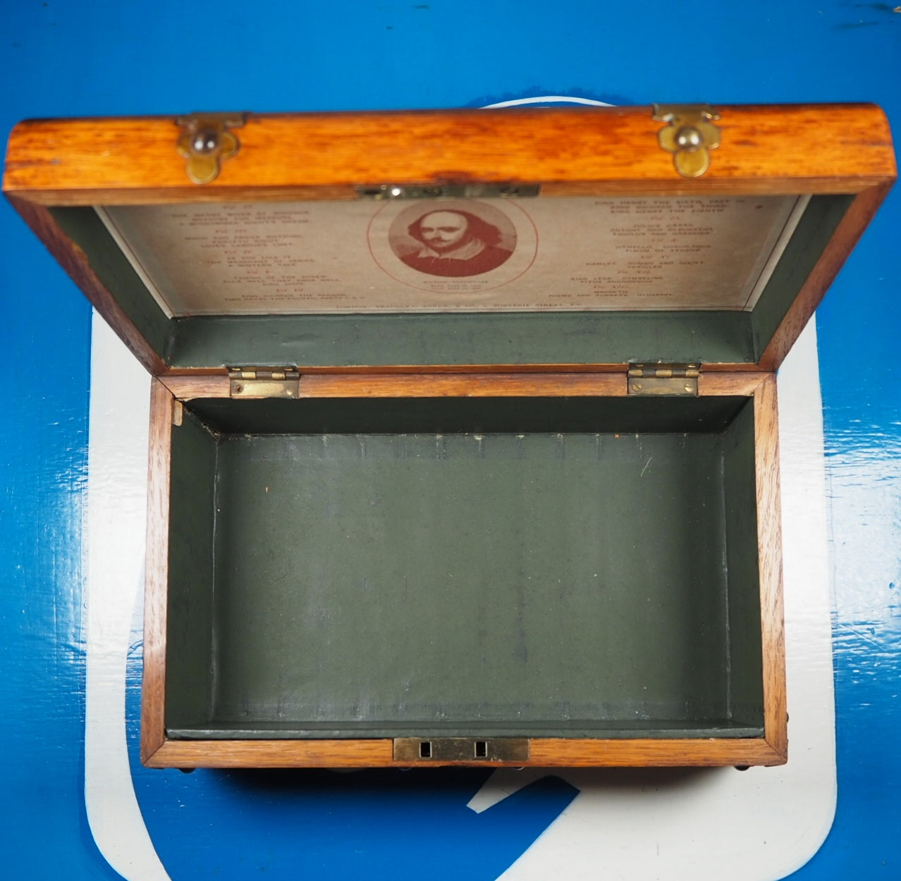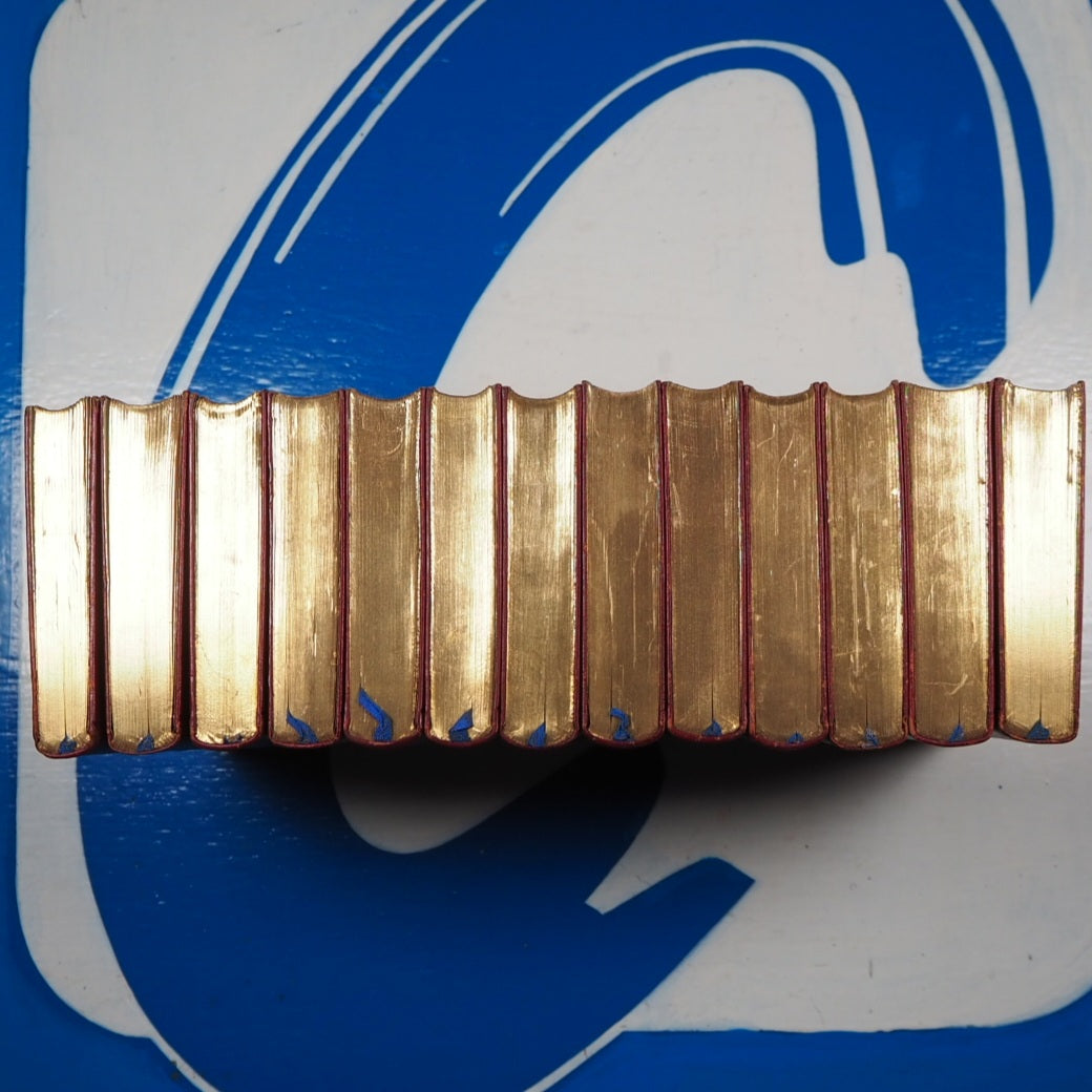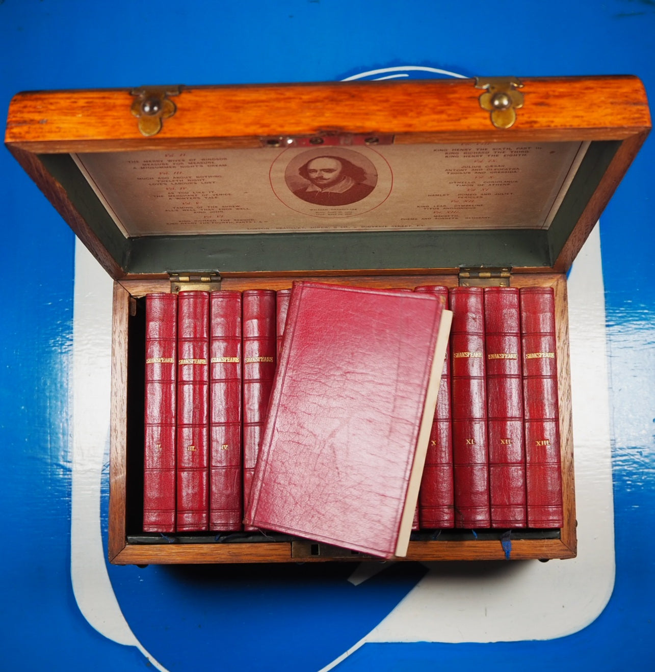 Complete set of 13 volumes in original oak, brass bound case. Each act has a decorated initial. Preface to v. 1 by "Q.D." 8 x 12 cm. Publisher's full ruby morocco binding, spines lettered in gilt (very slight damage to spines of volumes 1, 9 & 10). All edges gilt. Blue silk place-keepers, in original wooden chest (24 x 15 x 10 cm.) with printed paper label ("13 elegantly printed volumes in a case") to interior of lid detailing contents of volumes. Original patinated brass fittings to dome-topped box and "Shakespeare" in brass hand-cut letters across the lid. Box fittings in the Gothic Revival style of Augustus Pugin and George Gilbert Scott (portraying pre-industrial medieval society as a Golden Age). Original brass lock lid section has been slightly damaged (please see pictures), but still closes correctly. Same setting of type as the "handy-volume" editions of Shakespeare published by Bradbury, Evans & Co. beginning 1866.  v. 1. Tempest ; Two gentlemen of Verona ; Comedy of errors. v. 2. Merry wives of Windsor ; Measure for measure ; Midsummer night's dream. v. 3. Much ado about nothing ; Twelfth night ; Love's labour's lost. v. 4. As you like it ; Merchant of Venice ; Winter's tale. v. 5. Taming of the shrew ; All's well that ends well ; King John. v. 6. King Richard II ; King Henry IV. v. 7. Henry V ; King Henry VI, part 1-2. v. 8. King Henry VI, part 3 ; King Richard III ; King Henry VIII. v. 9. Julius Caesar ; Antony and Cleopatra ; Troilus and Cressida. v. 10. Othello ; Coriolanus ; Timon of Athens. v. 11. Hamlet ; Romeo and Juliet ; Pericles. v. 12. King Lear ; Cymbeline ; Titus Andronicus. v. 13. Macbeth ; Poems and sonnets. Glossary. Few of these wonderful complete stylised boxed sets survive intact. Seller Inventory # 5185