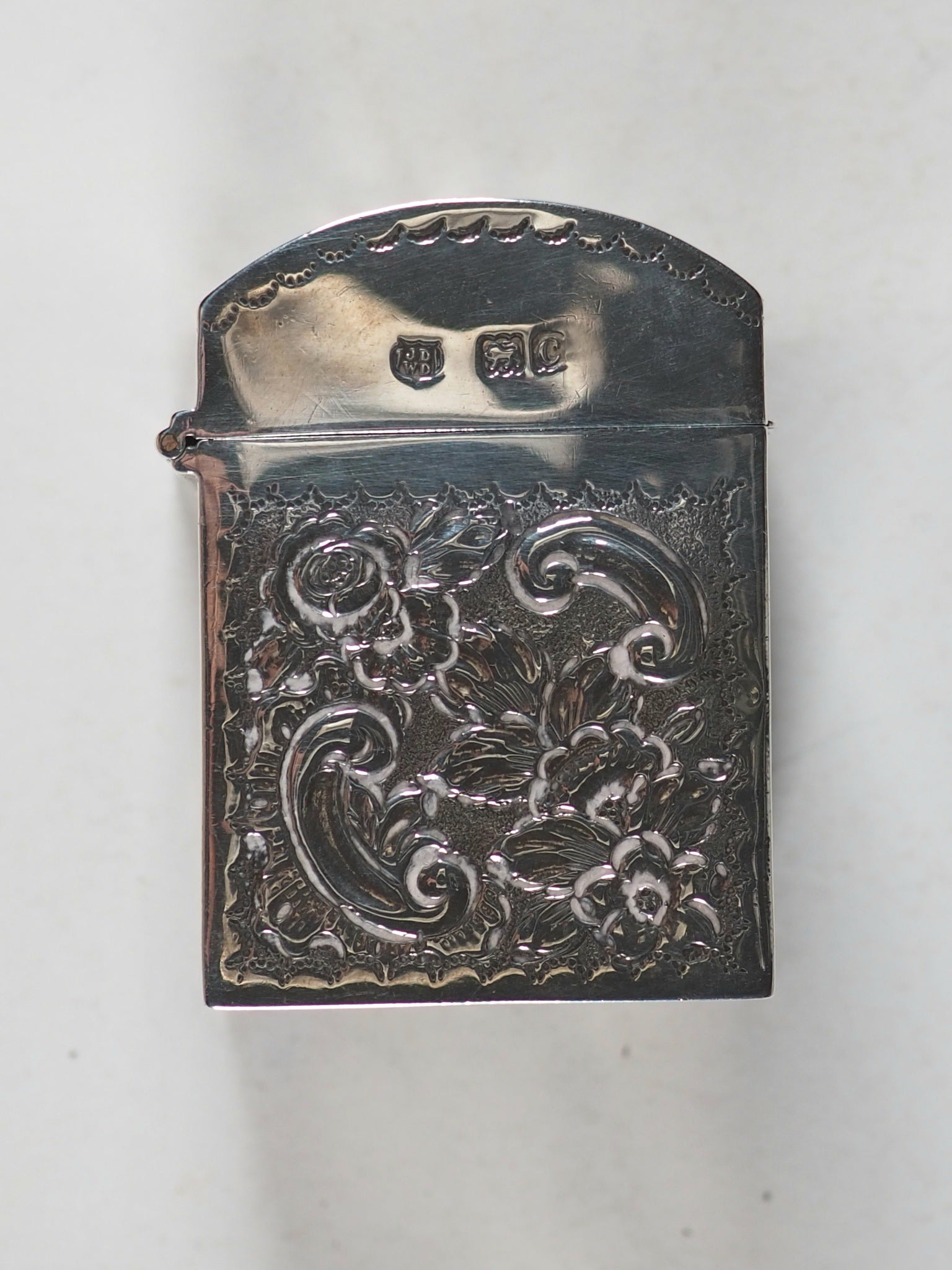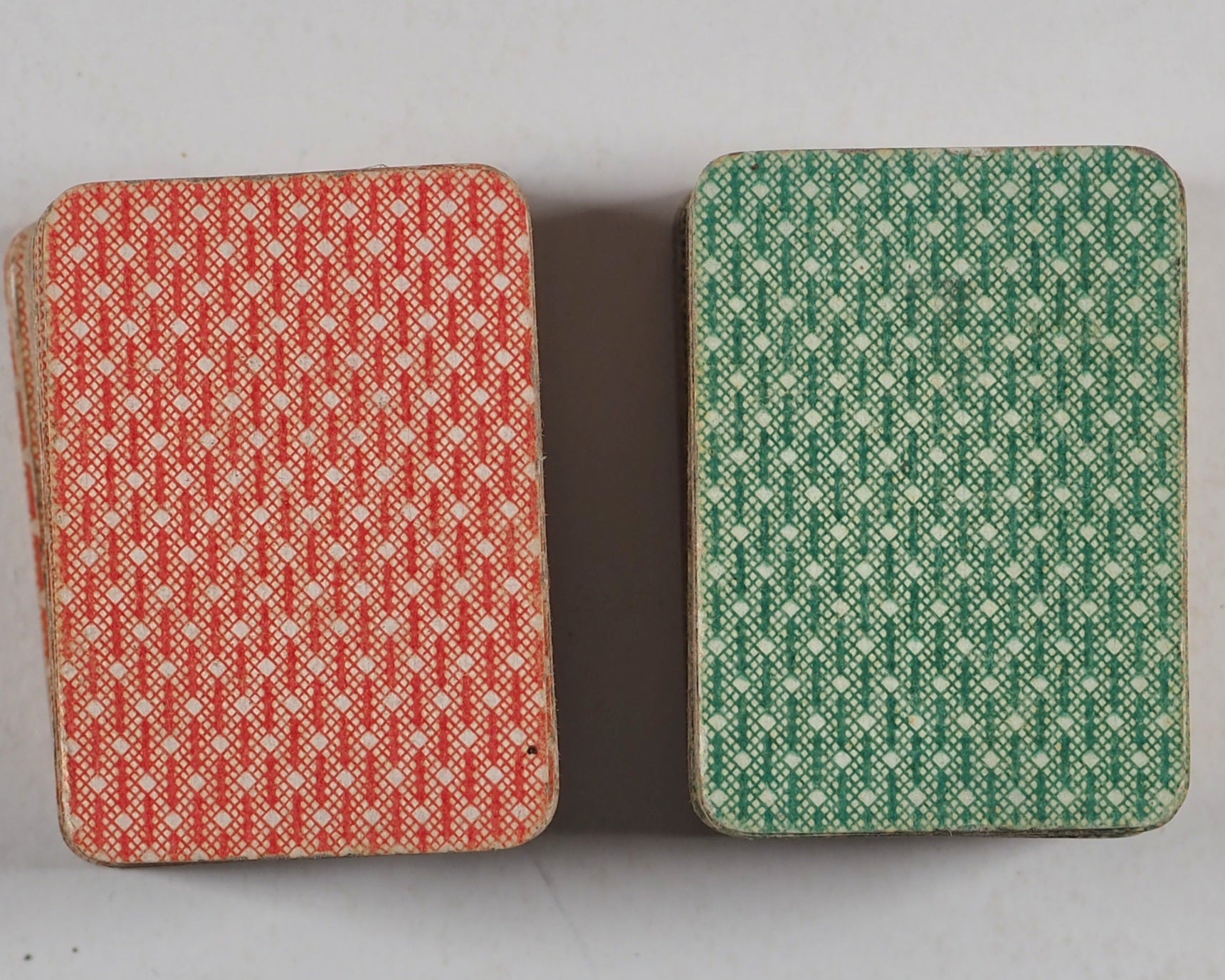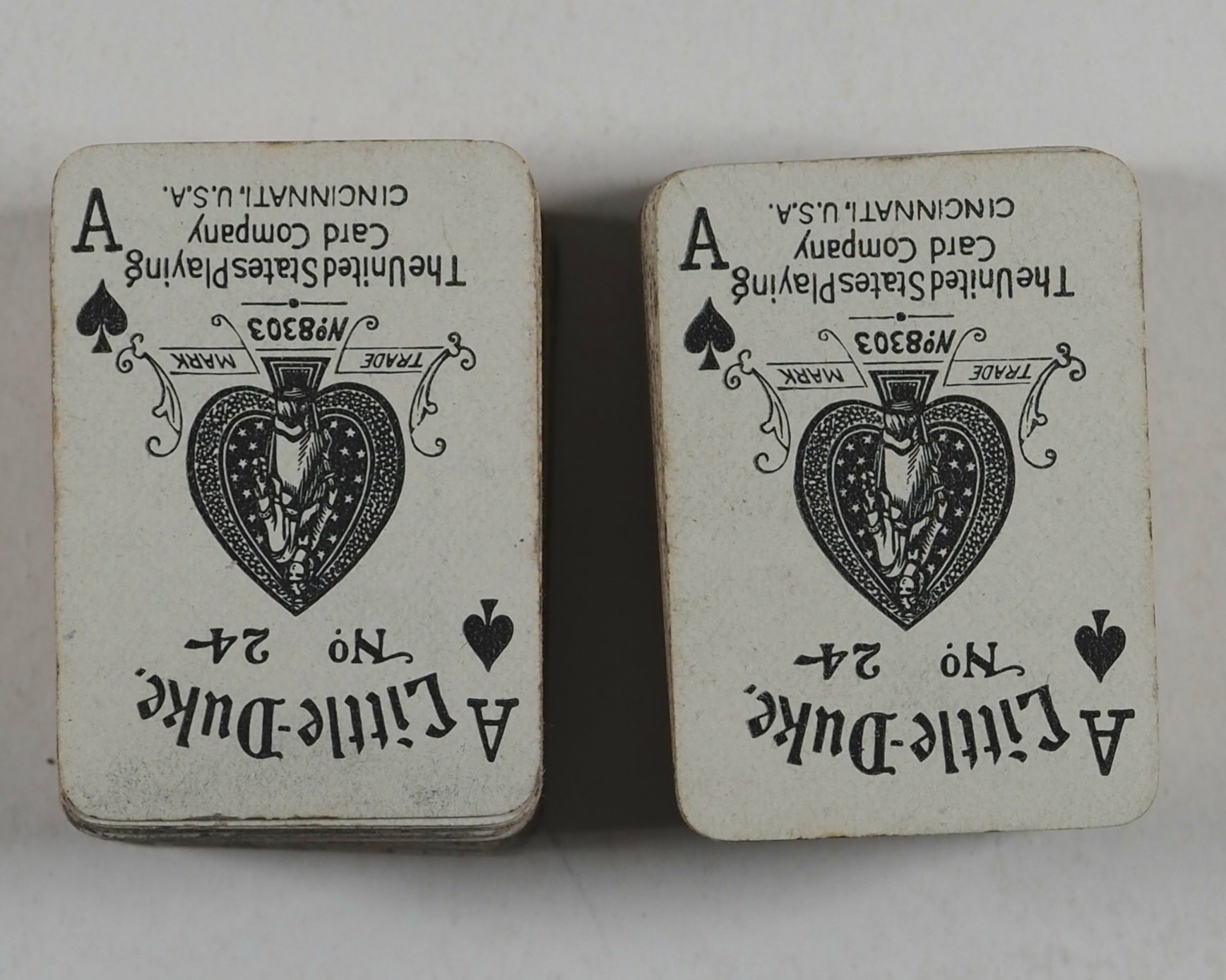 Playing cards. Miniature antique playing cards in contemporary box. United States Playing Card Company. Cincinnati, USA.Circa 1898. Miniature playing cards, 2 complete sets. Sets contained in a Victorian silver miniature playing card box fully hallmarked on body and on lid, for James Deakin & Sons, London, 1898. Embossed rectangular form, the domed hinged lid with plain scrolled cartouche, embossed and engraved decoration, and fully silver gilt interior. 3.6 x 5.2 cm. With printed and hand written insurance valuation dated 26th October 1973 for £40.00. W. Duke, Sons & Co. was a tobacco manufacturer founded by Washington Duke in 1881. His son, James B. Duke, later became president of the American Tobacco Company. All edges gilt. One set with red geometrical backs and the other with identical decoration but in green.