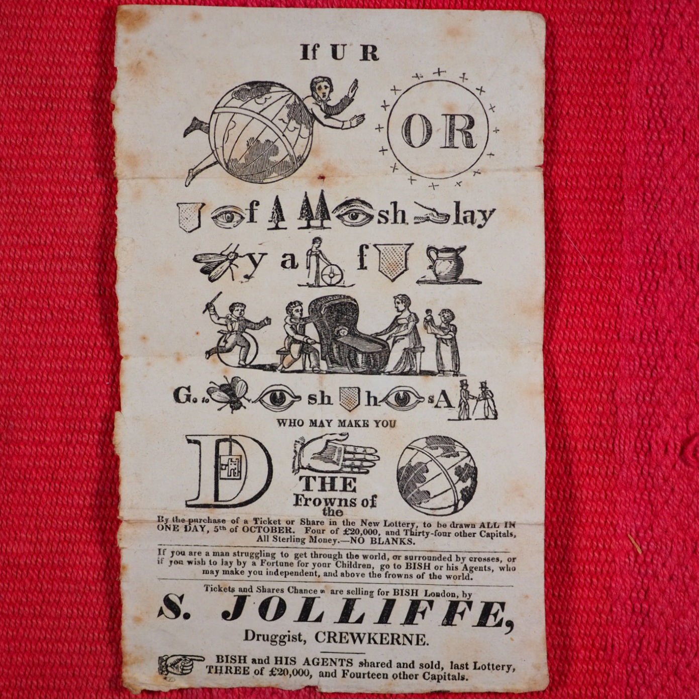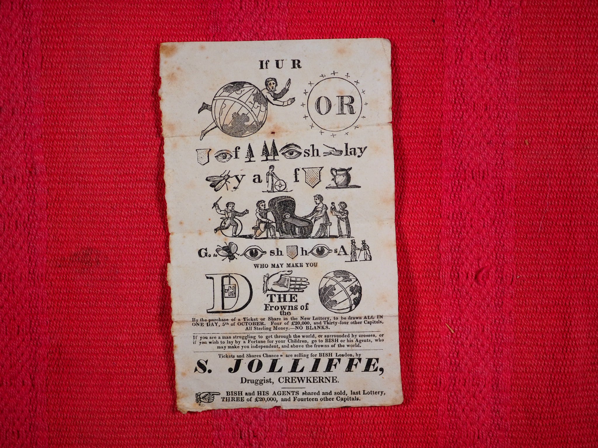 Called a rebus owing to its puzzle pictures, word puzzles, or hieroglyphics. This rebus has the answer provided three-quarters of the way down the bill. Mainly because of his popular and ingenious lottery handbills, Thomas Bish of Cornhill and Charing Cross, London, was one of the best known lottery-office keepers of his time, c.1790-1826 (when lotteries were banned). In fact there appear to have been two characters with this name, Thomas Bish the son having taken over the business quite seamlessly from his father. Certainly they were both shrewd and successful entrepreneurs who built up a network of agents all over the country, creating jingles and verses and always eye catching images. Every opportunity was taken to promote the name of Bish and their lucky lottery offices. It’s not surprising that lotteries were made illegal. The sums of money on these ads are extraordinary. £25,000 in 1806 is the equivalent of about £20 million now. The total prize money of £250,000 is therefore equivalent to £200 million. There had been Jolliffes in Crewkerne since at least the mid-eighteenth century: a William Jolliffe is listed in the 1784 Bailey’s Directory as a “grocer” of the town. In 1794 Samuel Jolliffe is named as printer, and he continued to trade as such in Sheepmarket Street, as well as being a bookseller, druggist and lottery agent well into the next century. A copy of this particular rebus can be found in the British Library (Shelf mark: L.R.26.b.1(30) ) & in the John Johnson Collection of Printed Ephemera in the Bodleian Library, Oxford and was selected to be published in a selection of lottery handbills in John Ashton’s ‘History of English Lotteries’ published by the Leadenhall Press in 1893.