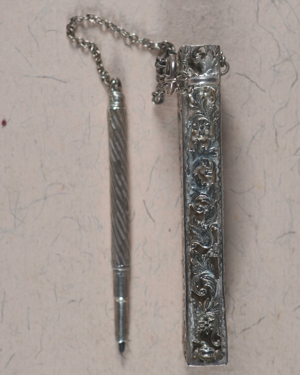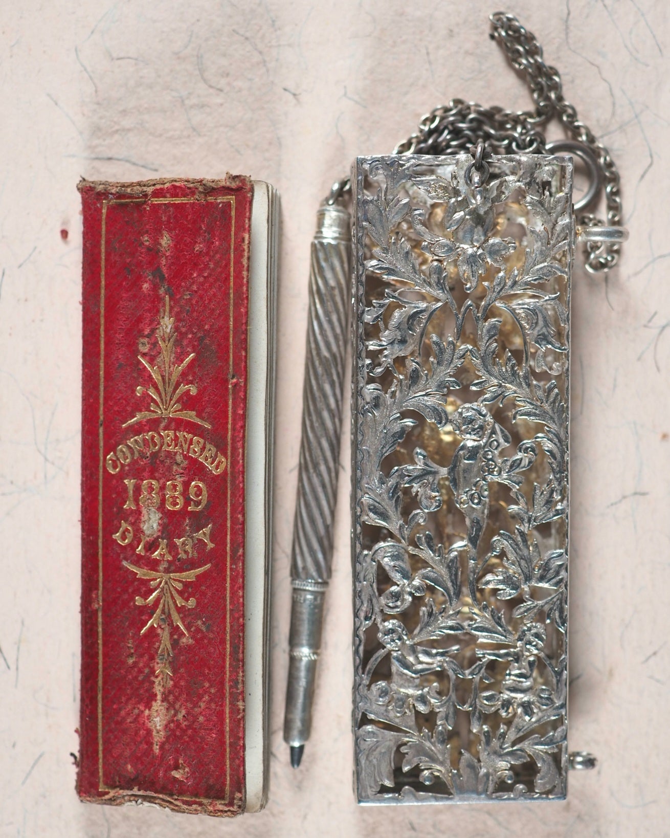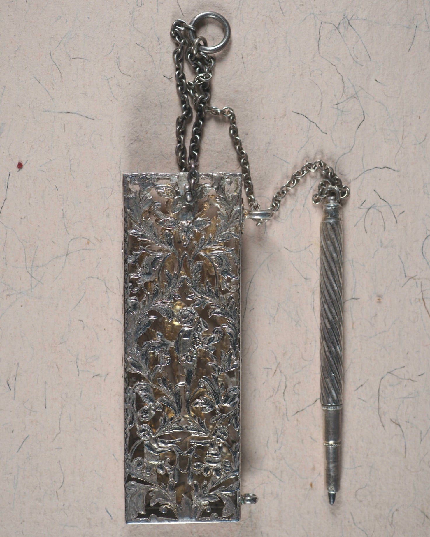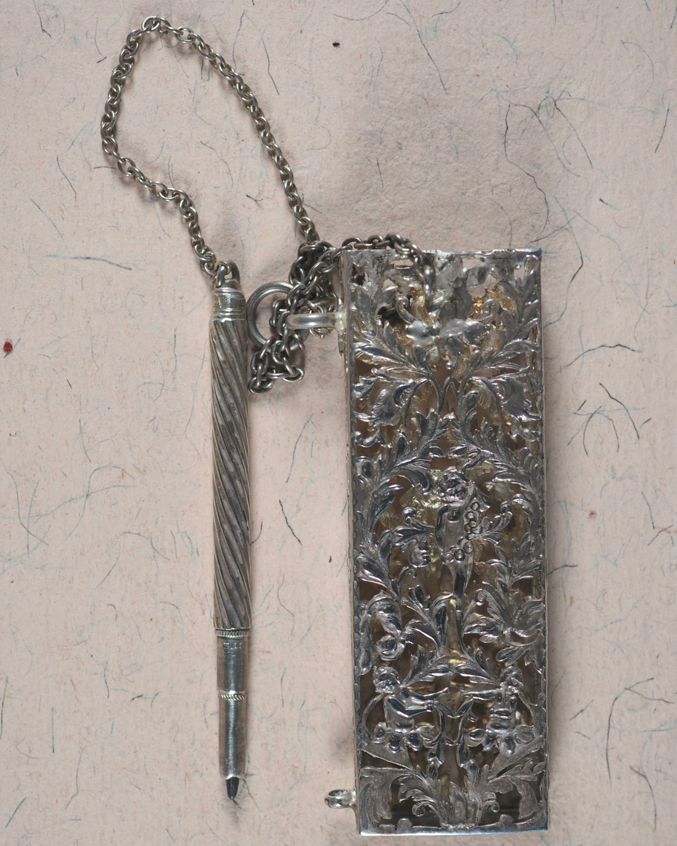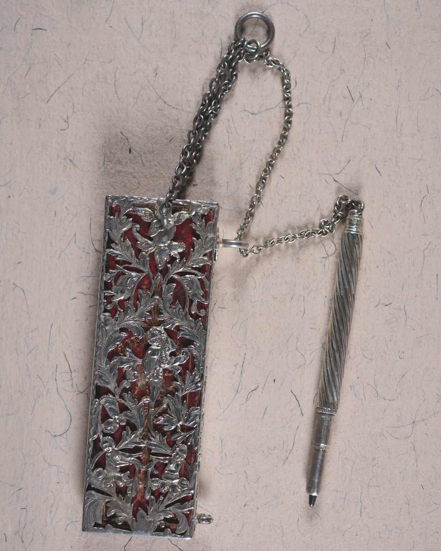 Printed in red and blue. With hallmarked silver slipcase openworked rectangular with putti amidst scroll foliage, set with a chained but associated propelling leaded pencil marked 'STERLING', and two further chains meeting on a suspension ring, apparently no maker's mark, 1888, assayed in London. Silver case, 26 x 79 x 9 mm. Some pages with contemporary ink entries. All edges gilt. Contemporary pencil signature on front paste-down. 23 x 76 mm. Original red morocco with uniform gilt titling on front and back covers. Edges rubbed, corners worn. Not inWelsh. WorldCat locates no copies of this edition worldwide.