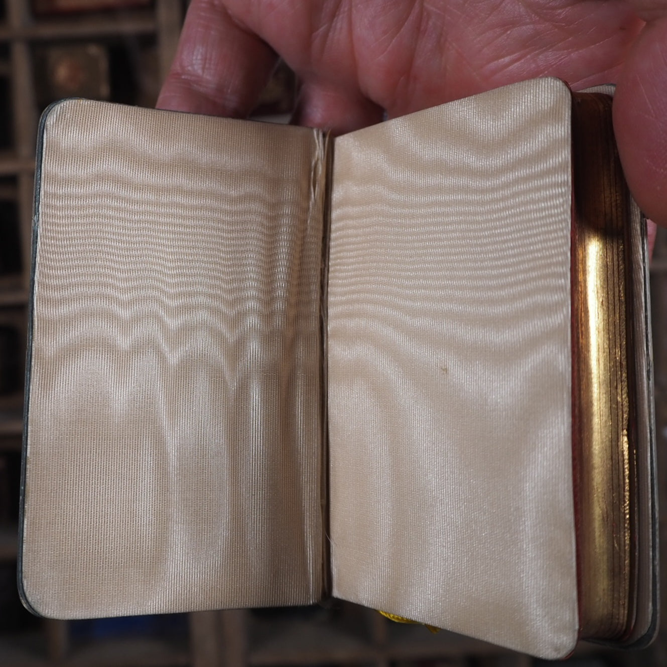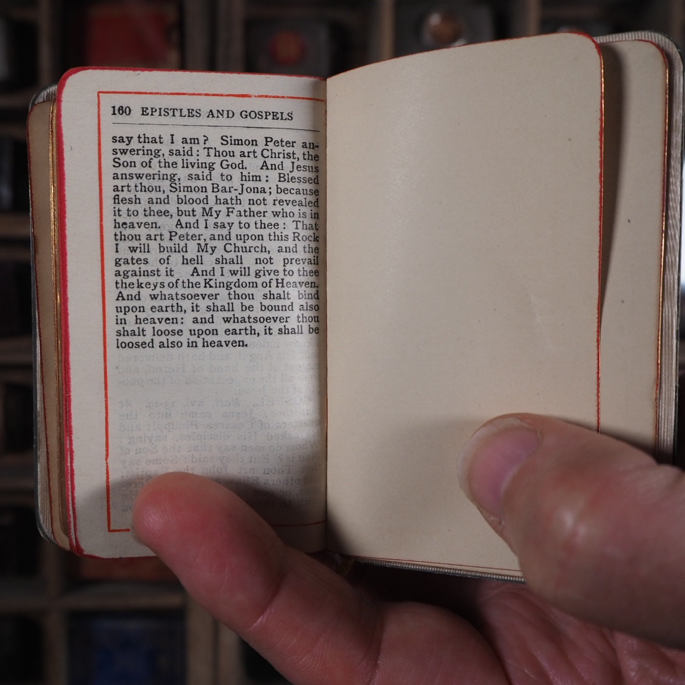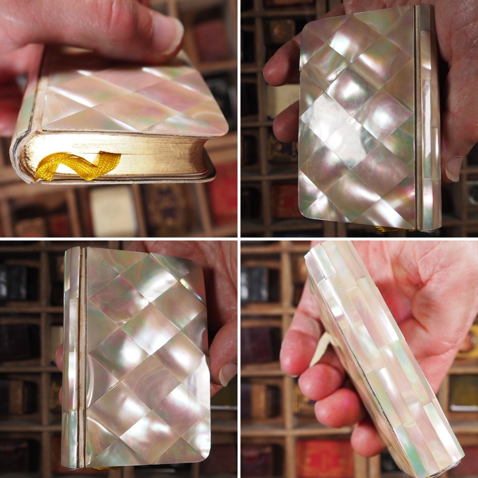 No date but 1922. 352 & 160 printed pages all with red borders. Original yellow silk place-marker. Ivory watered silk endpapers. All edges gilt. 60 x 95mm. Full mother-of-pearl binding, upper and lower covers checkered pattern, spine set in vertical oblong pieces. Mother-of-pearl was often used for small card cases and for some devotional books from around 1850 to 1950. No loss of pieces, which all remain secure, unusually (they commonly attract damage at the corners). Includes "The epistles and gospels". "Table of movable feasts" begins with 1923. WorldCat does not locate copies of this edition. Not in Bondy, nor Spielmann, nor Welsh. Uncommon in this condition after more than 100 years of handling. Seller Inventory # 5323