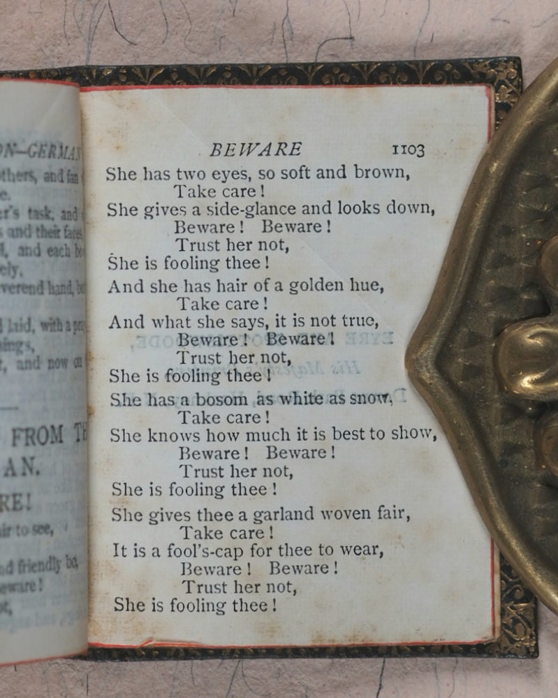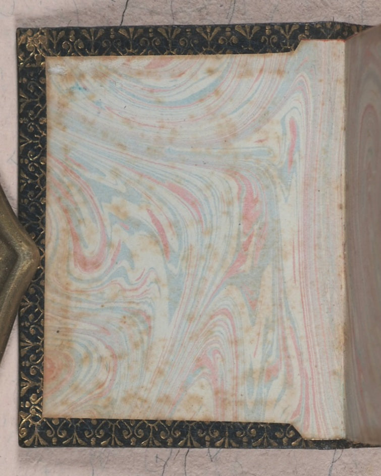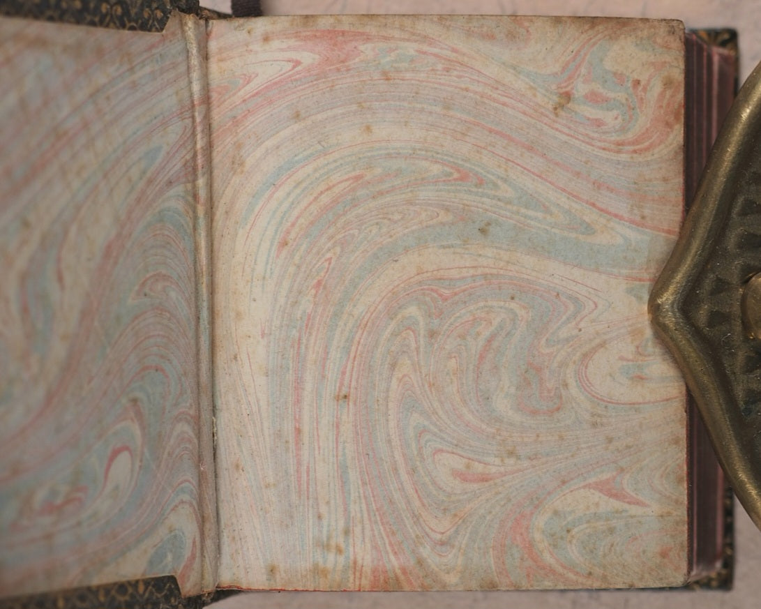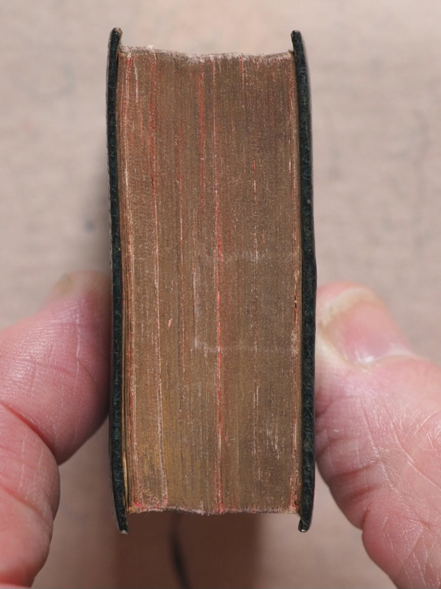 xv, [1], 1103, [1] printed pages plus colophon at end. Title-page in red and black. Very fine 'India' paper. First and final seven or so leaves slightly foxed. Occasional top corner creased. Scrolling inner gilt dentelles. All edges gilt over red. Original marbled endpapers. Silk place-marker. 48 x 56 mm. Contemporary full teal morocco; spine with gilt titling and foliate art nouveau decoration above an elaborate capital 'L' in gilt and small 'LONDON' at the foot; front cover with 'L' within laurel wreath; titling in full around the inside of a twisting gilt decorated border. Minuscule degree of wear. Welsh4710. OCLC, 232335563. WorldCat locates four copies worldwide (British Library, National Library of Israel, Pierpont Morgan, and University of Virginia).