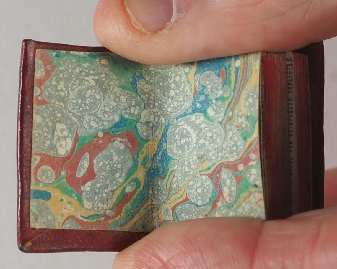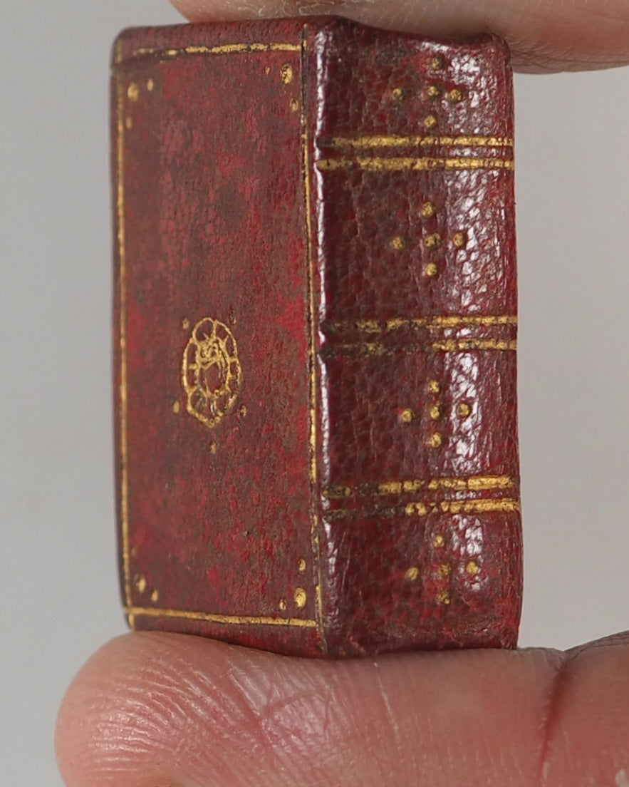 218 printed pages. Title page slightly marked and with some areas of type worn. Text block split at page 128. Marbled endpapers. All edges red. 22 x 32 mm. Rebound but not signed, as is not uncommon, in the 1960's – in red morocco; spine with double gilt horizontal lines and dots in cross formations; covers with central flower gilt motifs with dots, single gilt ruled borders and triple dot cornerpieces. Slightly rubbed in parts.