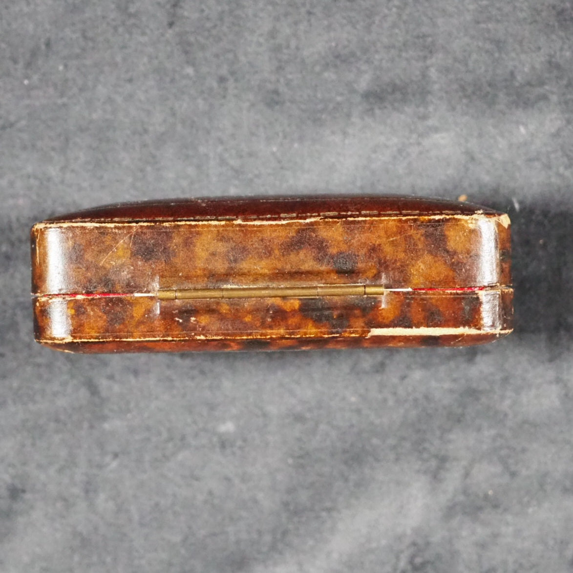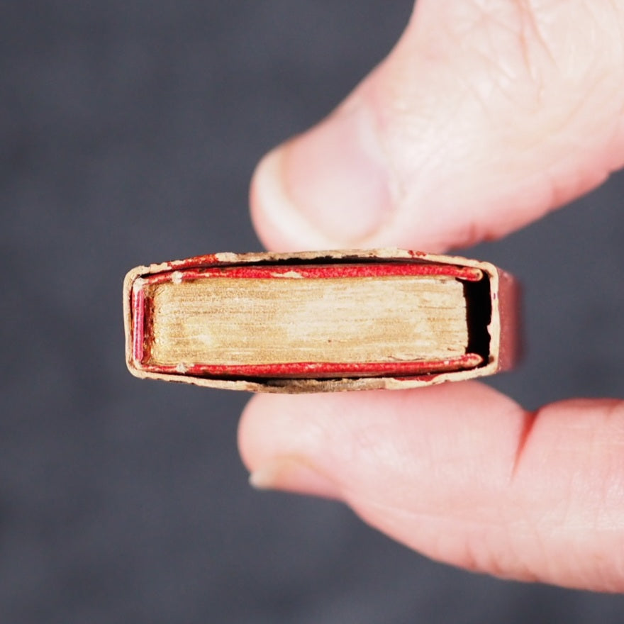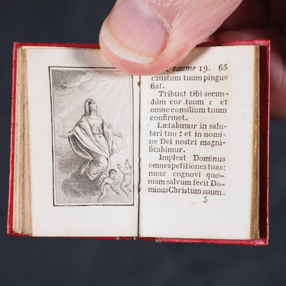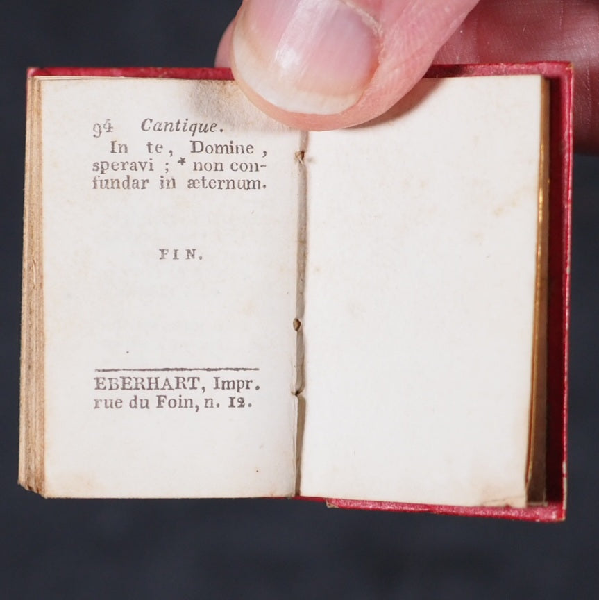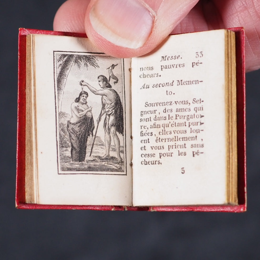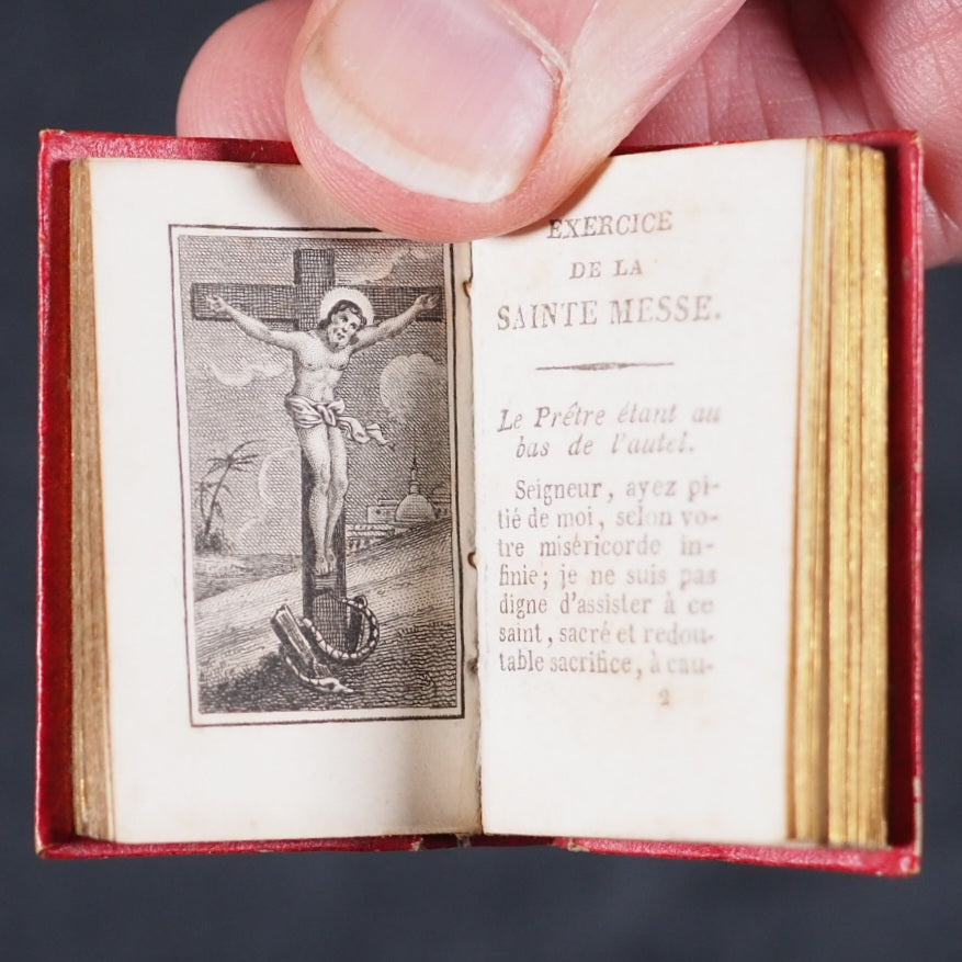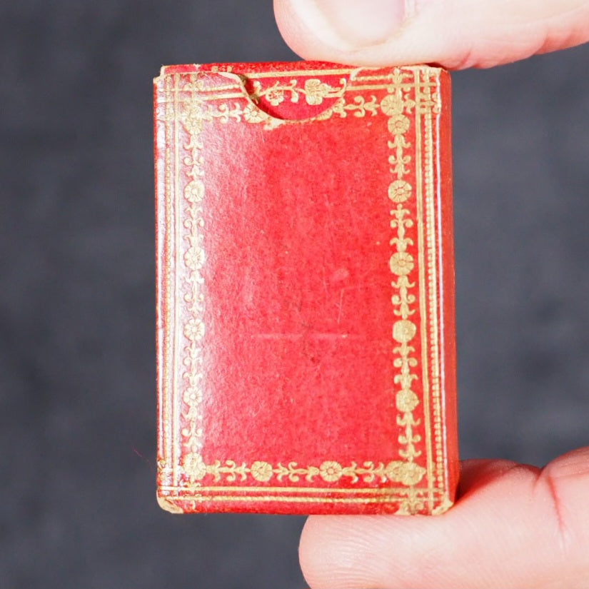 Petit Paroissien de la Jeunesse. Marcilly. Rue St. Jacques, 10. Paris. Circa 1840. Original slipcase, magnifying glass and case. 94 printed pages in French. Five fine copper engraved plates. Printed by Eberhart, rue du Foin, n.12. All edges gilt. Complete with original matching slipcase (a trifle worn at corners), red leather bound magnifier, and satin lined hinged box in faux turtle leather with single gilt rule and brass clasp and hinges (slightly rubbed). 32 x 45 mm. Original red cartonnage binding; spine with scrolling gilt floral roll; covers with gilt vine leaves within gilt miterd panels. Bondy, 77. Spielmann, 404. Welsh, 5605. 196 firsts2024