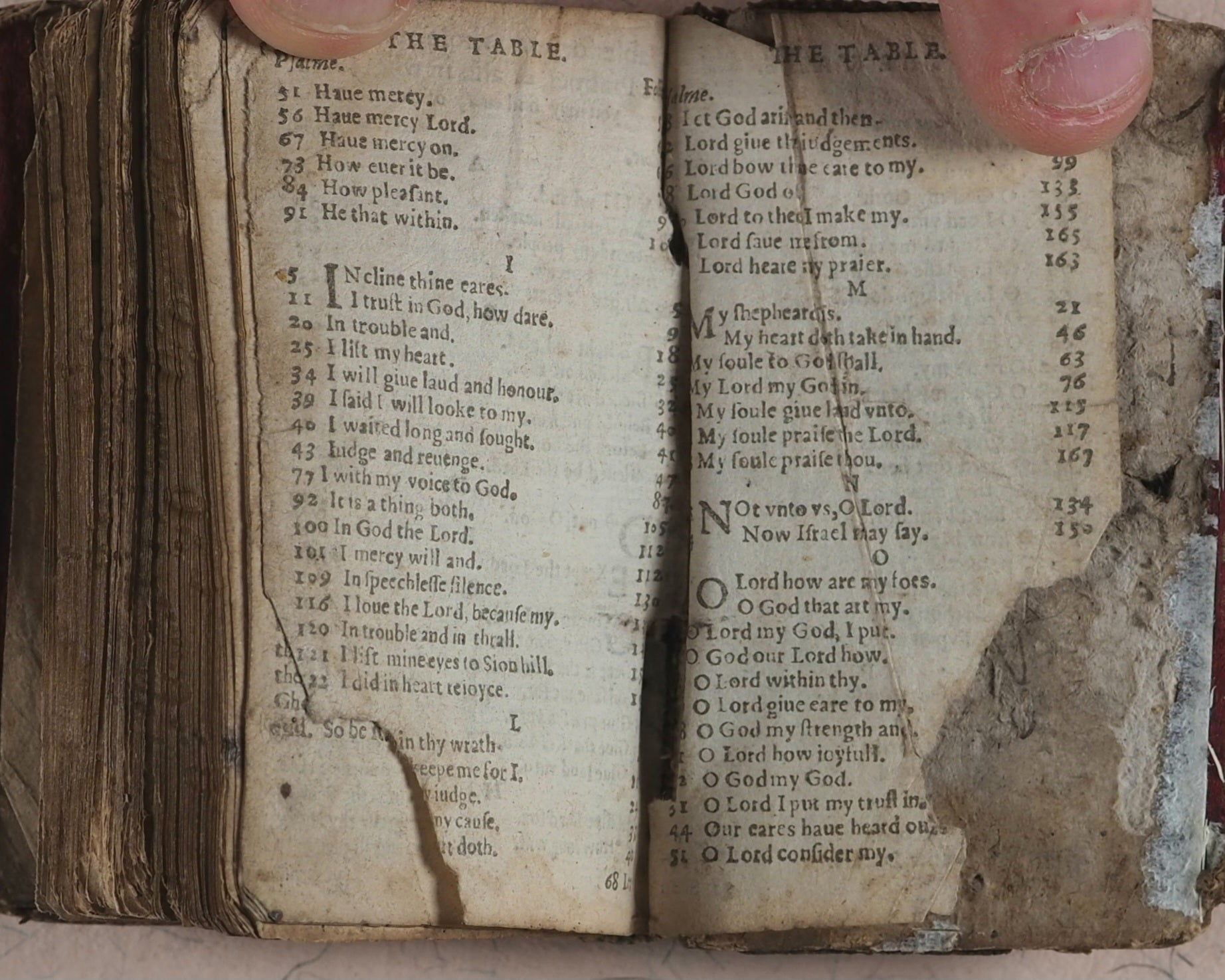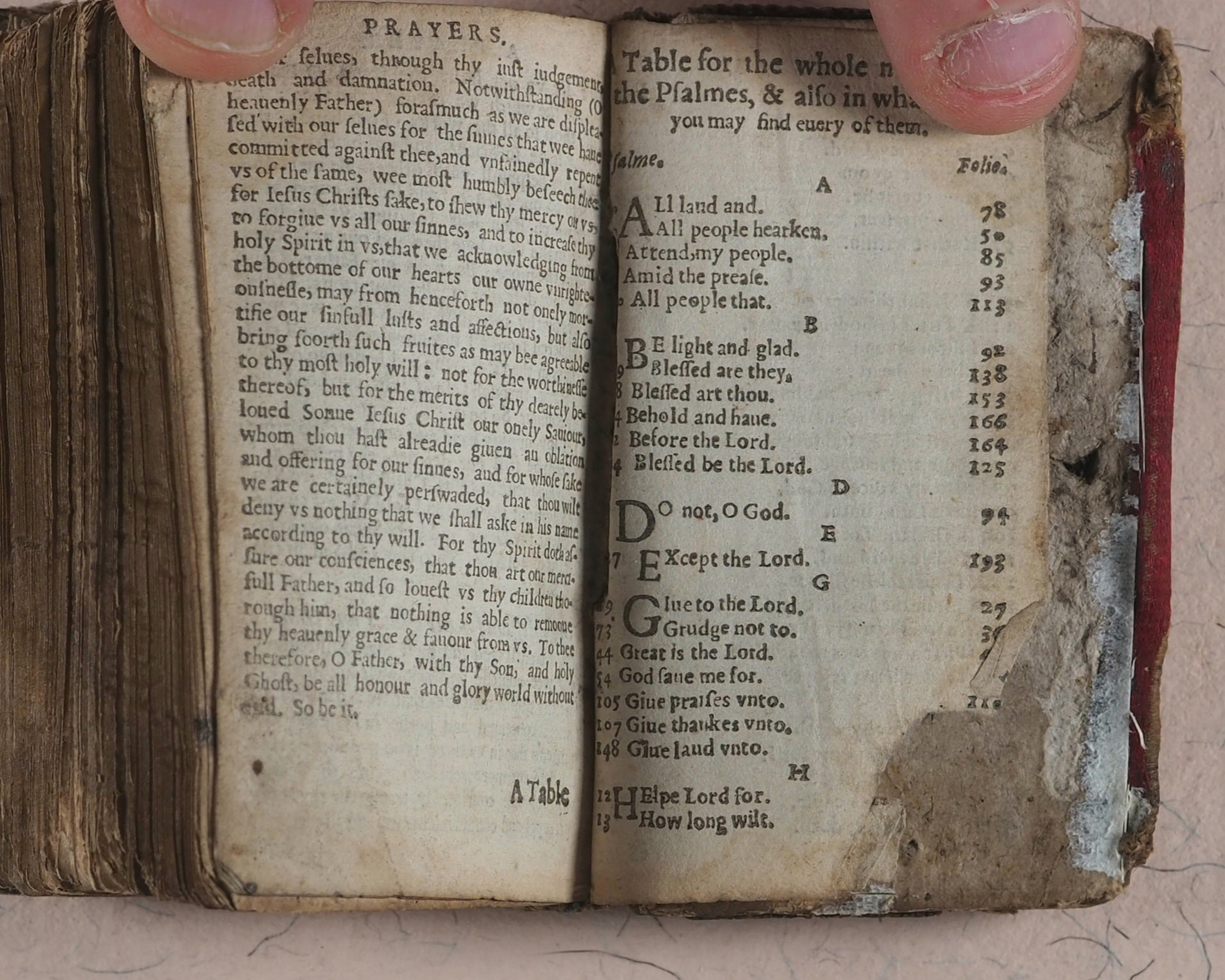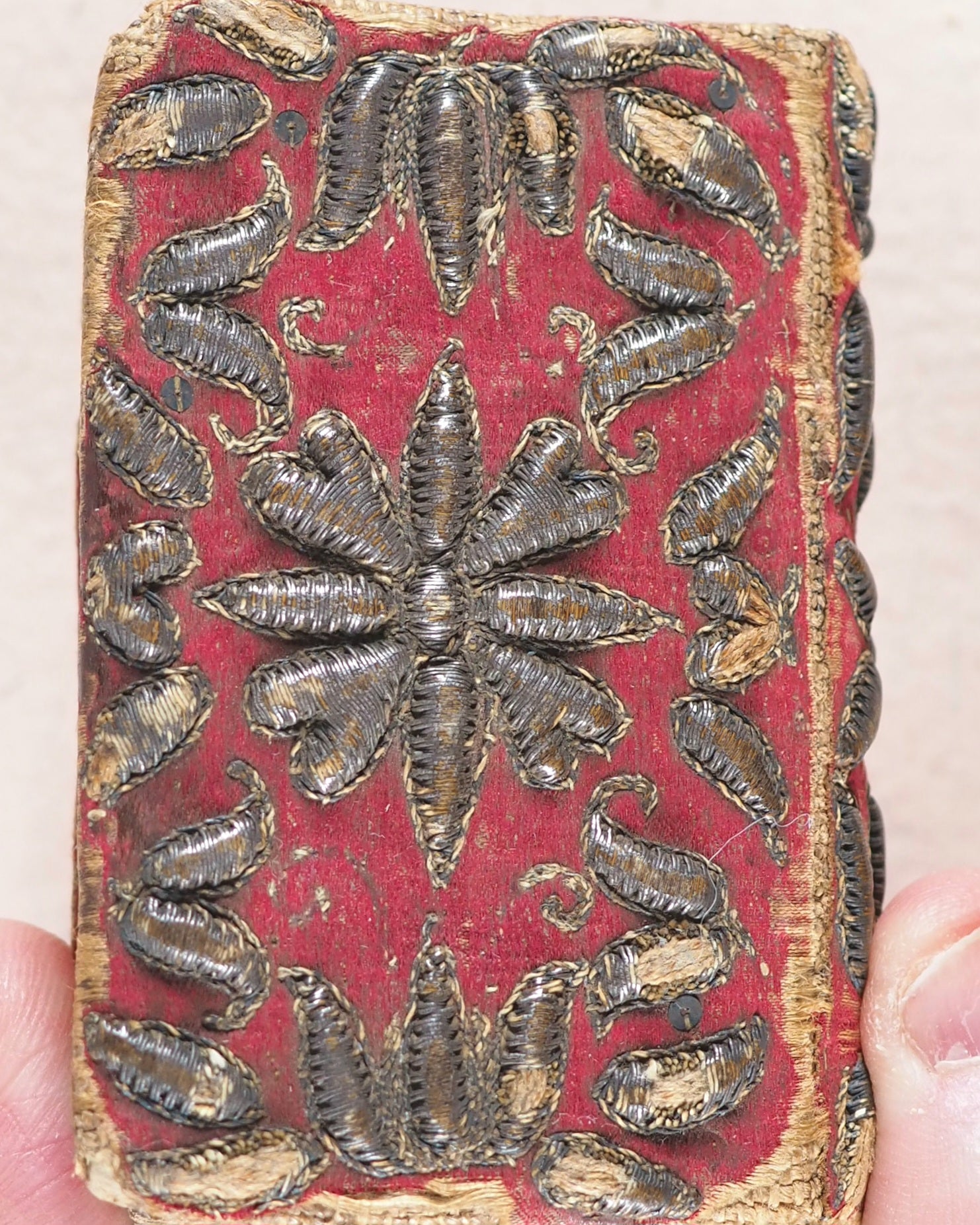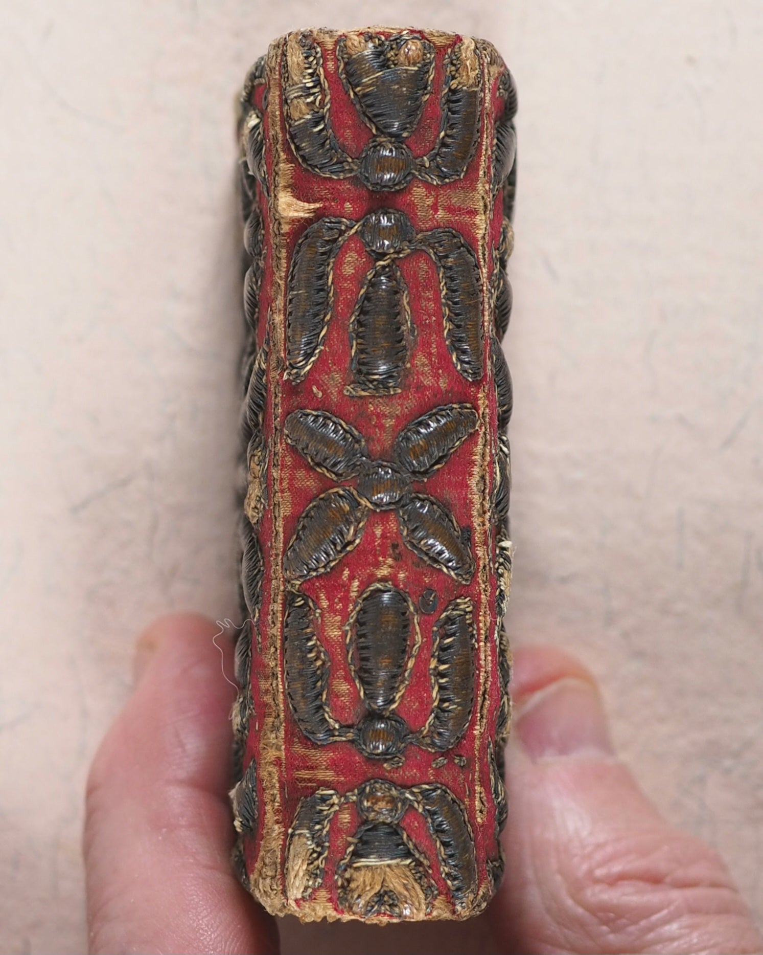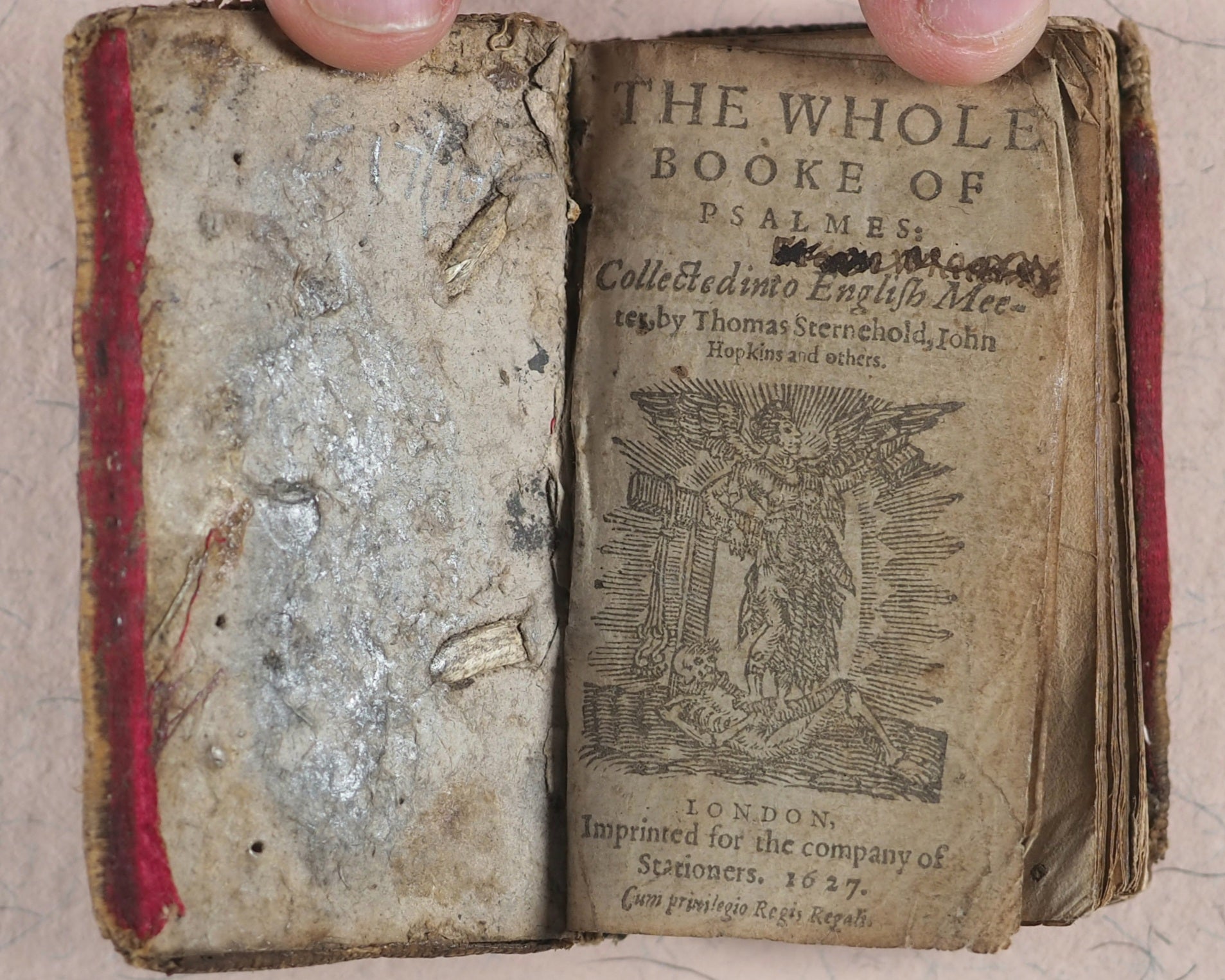 171 [17/18 leaves, final index leaf lacking] pages. Wood-engraved vignette to title page. Rare Carolean miniature embroidered binding. For another 1634 Company of Stationers Book of Psalms, see Christie's New York, The History of the Book: The Cornelius J. Hauck Collection, 27-28 June 2006, lot 290. Another similar miniature 1634 Book of Psalms, worked in silver wire over maroon velvet, was sold at Christie's London, Valuable Books and Manuscripts (including Important Early English Books from the Kenyon Library at Gredington), 14 July 2021, lot 98 (£27,500). Some soiling to title with early ink ownership signature erased, some light soiling to text, index at end lacks final leaf (Aa8), final two pages torn with loss to lower outer corners affecting text. All edges gilt and gauffered. Provenance: Ralph Ewart Ford (1897-1974), precision engineer and founder of Fords (Finsbury) Ltd. In Bedford. A member of the Bibliographical Society, he formed one of the largest collections of English Bibles in England. During the coronation of Queen Elizabeth II in 1953, a selection of the rarest and most important early English Bibles from Ralph Ford’s collection went on display in a touring exhibition across England, including the Chapter House at Westminster Abbey. 55 x 85 mm. Contemporary lovely early 17th century English needlework binding red velvet over thick boards, sides with a central daisy motif embroidered in relief in metal threads, with raised embroidered petals to edges.The boards are somewhat rubbed and corners worn, but with an attractive patina. and generally intact. Bondy, 10 (later edition). Welsh, 631 (see Davenport, English Embroidered Bookbindings, image 50 for later edition. Grolier, Exhibition of Silver Embroidered and Curious Bookbinding, page 63 number 190). STC, 2653. WorldCat locates no copies worldwide.