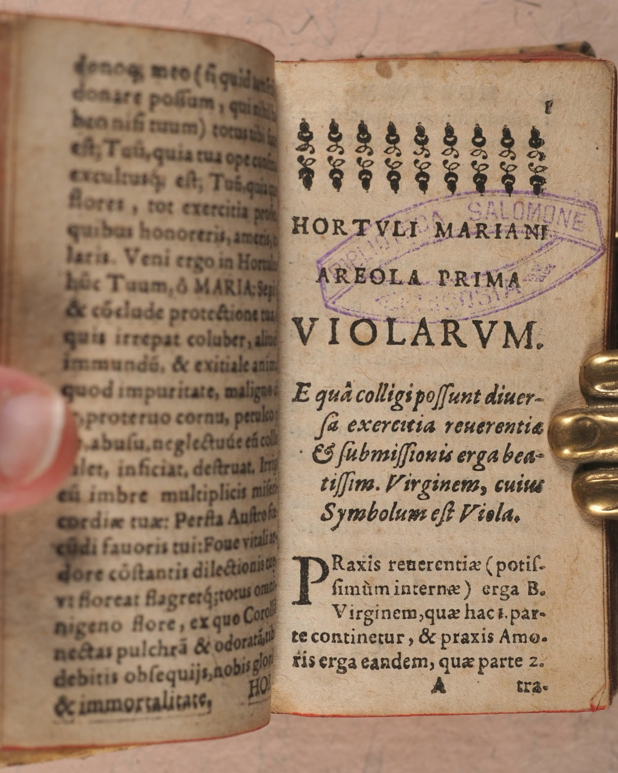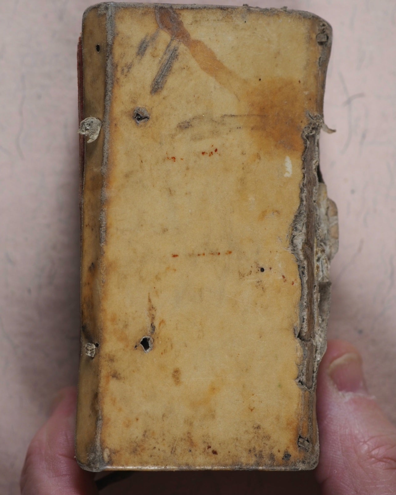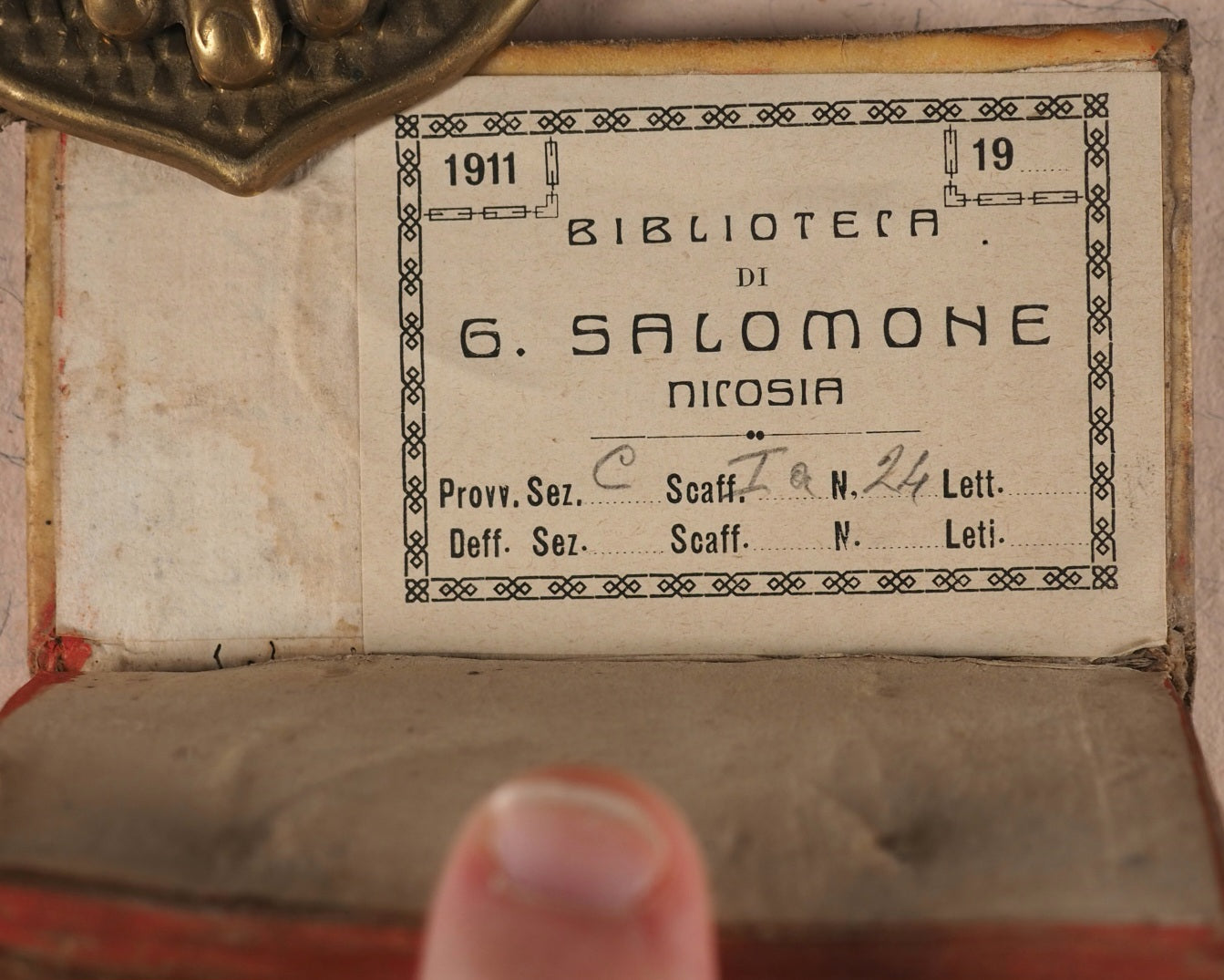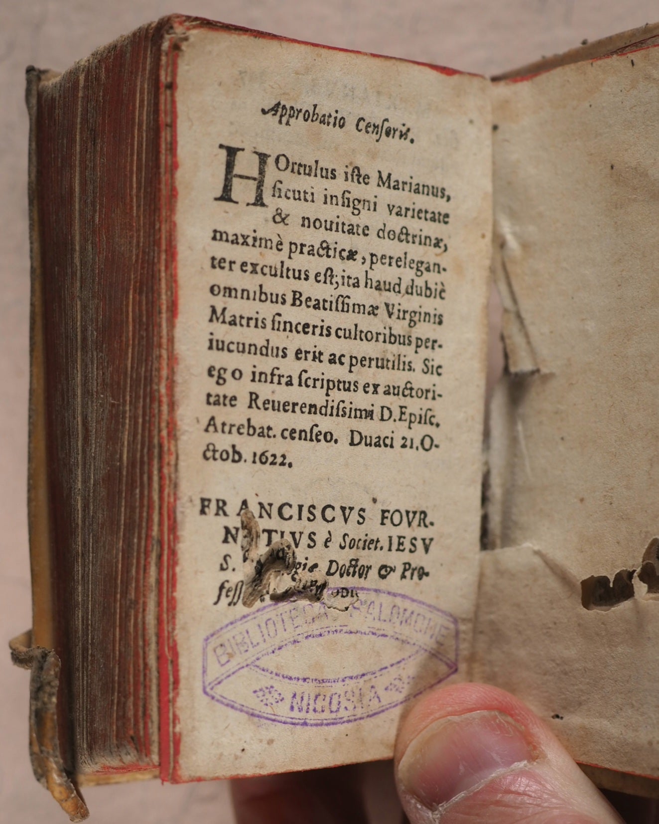 [32], 397, [1] printed pages in Latin. The author was François de la La Croix, Kurtzböck, 1582-1644. The printer was Reulandt, Hubert (1590-1661?). The book covers the various practices of worshiping the Blessed Virgin Mary. Some age-toning and a few leaves slightly browned. Last seven leaves have worming that affects some lines of text. All edges red. Original cream endpapers. Ink stamp on second leaf and printed label on front paste-down endpaper of Biblioteca di G.Salomone, Nicosia, dated 1911. Salamone 1897-1986), Baron, heir to the title of the Falco family, a graduate in medicine, he was also mayor of Nicosia in the 1950s (if he is not a namesake). An Honorary bibliographic inspector, Salomone was a member of the Italian Library Association from1954 and participated in some national conferences starting in 1957. In May 1964 he was elected to the Board of Directors as a representative of the non-librarian members category and was then confirmed for the three-year period 1967-1969. During this period he was also part of the editorial committee of the «Bollettino d'informazioni». 55 x 95 mm. Contemporary full vellum over original wooden boards with just one original tie intact; spine with contemporary ink titling in black. Hinges worn and sections of the spine and covers missing. Rear hinge split and binding rather loose but still intact. Not in Bondy, nor Spielmann, nor Welsh. OCLC, 1067852244. WorldCat locates 2 copies worldwide (NUKAT, Warsaw and Universitäts- und Stadtbibliothek Köln).