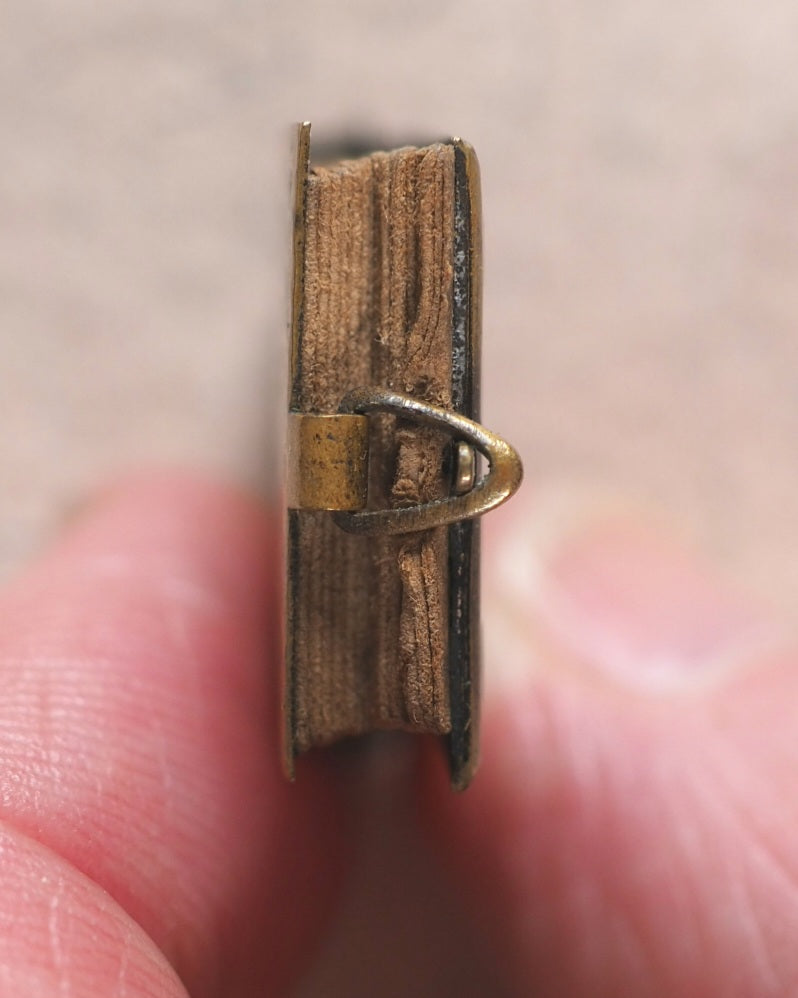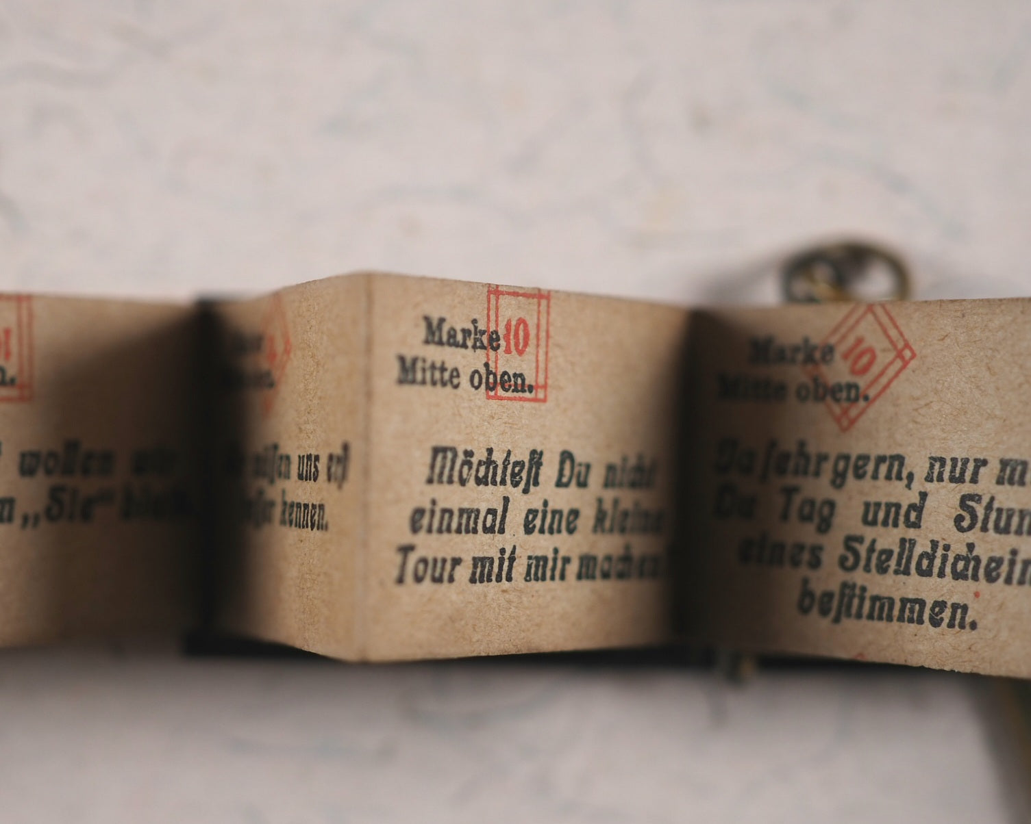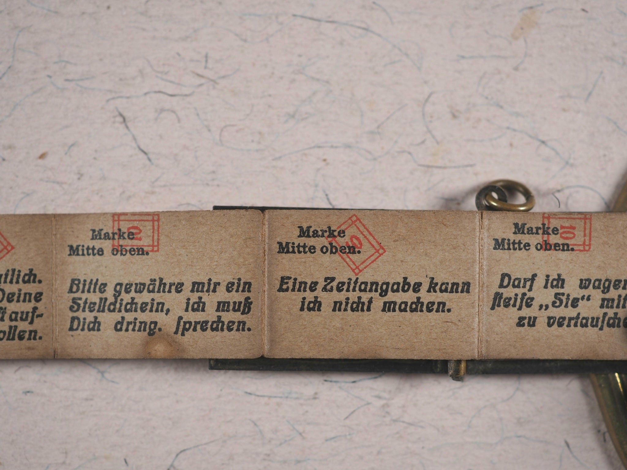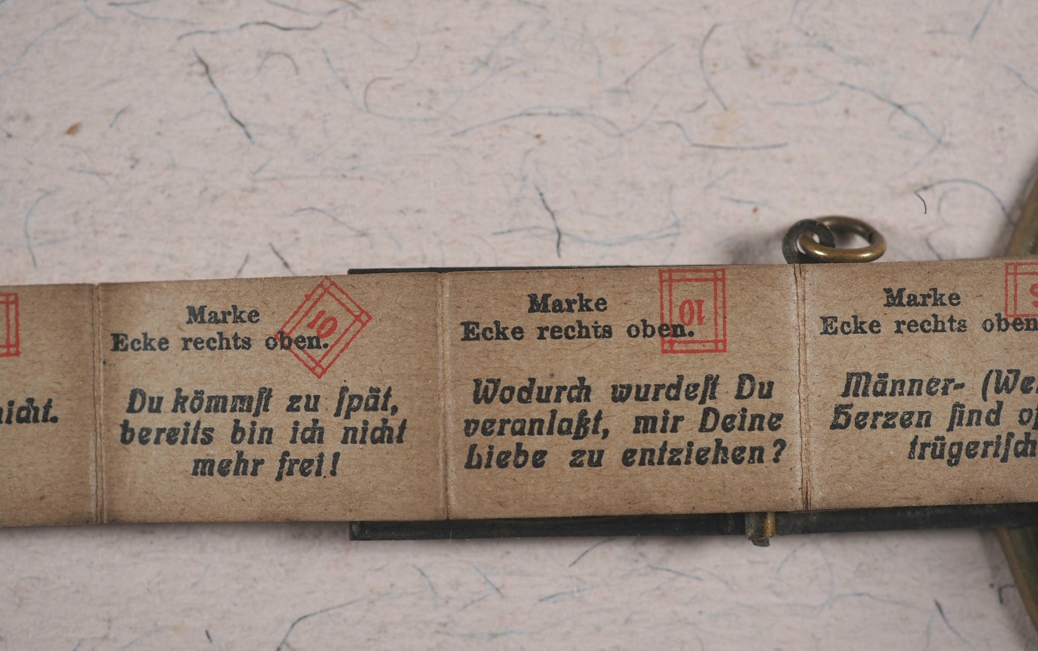 29 printed pages in German in concertina style. Stamp language is the transmission of an encrypted message with agreed meanings - especially among couples in love - through the arrangement of stamps on a letter. Firsttwo pages detached from subsequent 28 pages. The first few joints are slightly weak. Slightly age-toned throughout. 30 x 18 mm. Original oblong brass embossed locket covers with original catch and loop at the top; front cover with title engraved within abstract panel and fan corner-pieces; back cover hand planished. Patina befitting the age. No copies located worldwide in commerce.