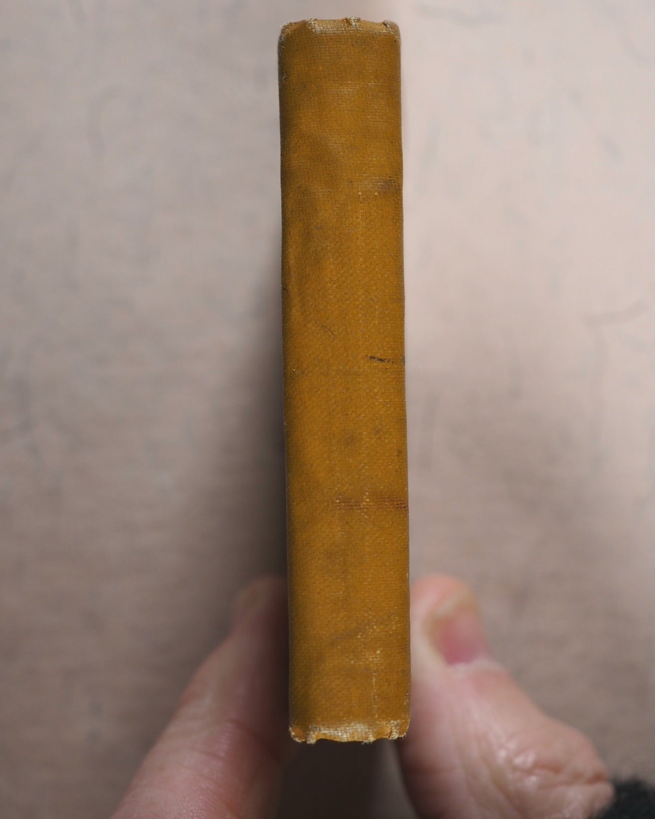 255 printed pages. Abridged and published in English by the Rev. John Wesley. All edges gilt. Original yellow endpapers. Contemporary ink inscription on front and back free endpapers dated 1889. Ink verses in neat contemporary hand on recto of rear free endpaper. 60 x 78 mm. Publisher's mustard cloth; front cover with gilt title above embossed black decorative device and with double black embossed fillet at the top and bottom. Slight rubbing and some historic ink smudges and spatters on the front cover. Welsh, 3711. OCLC, 248654553. WorldCat locates one copy worldwide (University of Virginia).