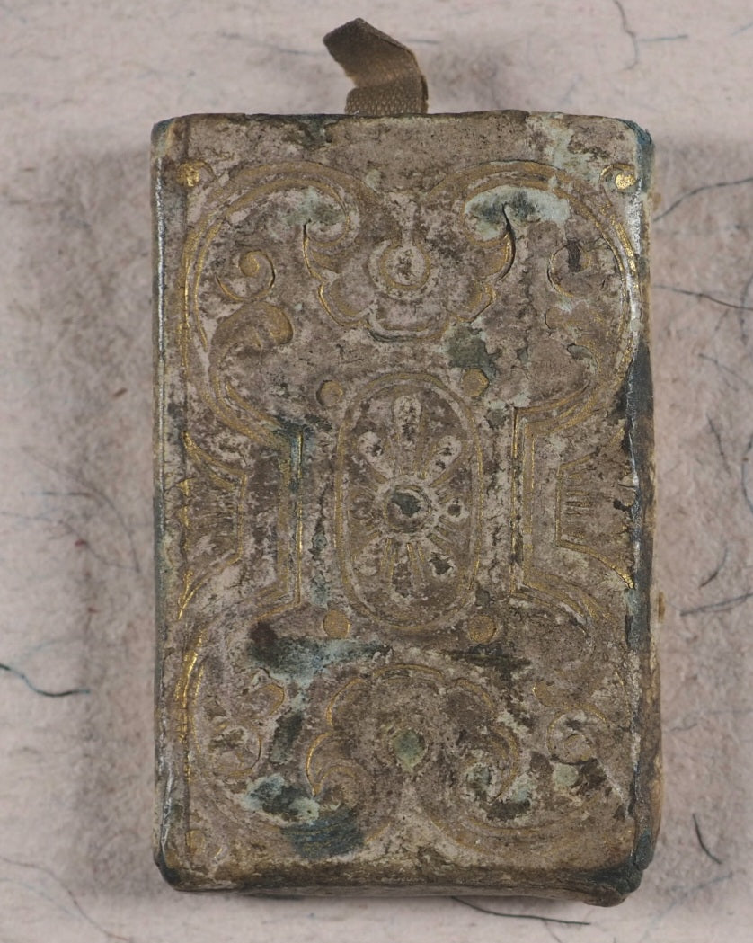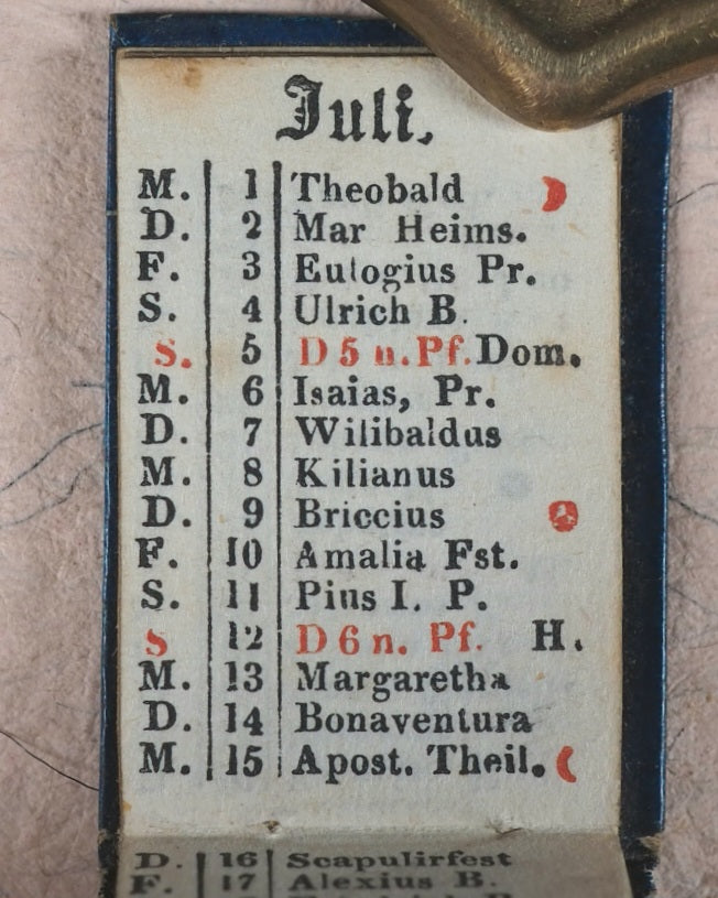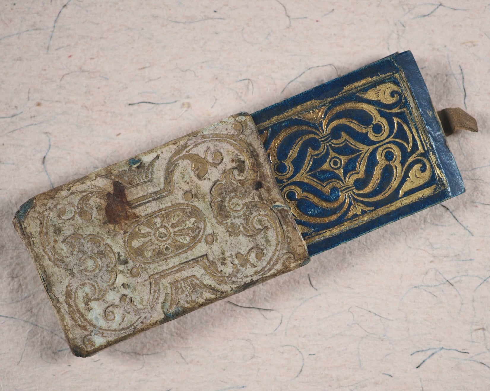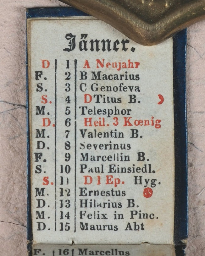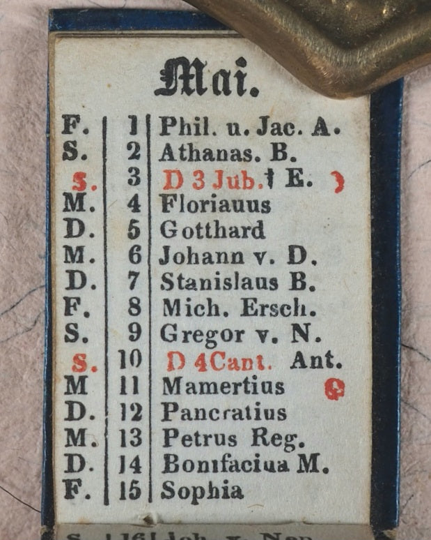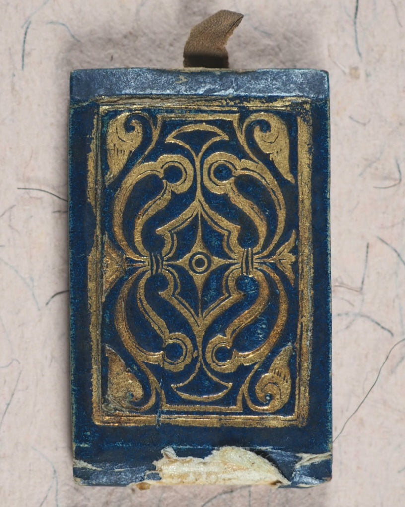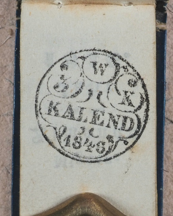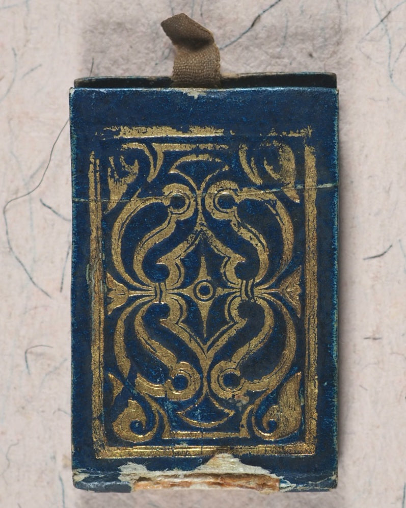 14 printed leaves three in red and black in German. Complete with matching cream and gilt slipcase (decoration faded and rubbed). Printed in landscape orientation. All edges gilt. 30 x 19 mm. Original card covered with lithographed blue paper featuring roccoco and elaborate flower motifs to either side. Original card covered with lithographed green paper depicting two seated cherubs with flaming torch between them and elaborate flower urns to either side. Preserved in antique square cardboard box, 27 x 27 mm., with yellow handwritten label (minuscule wear to bottom of upper hinge, foot of spine and corners). Wear to spine. This edition not in Bondy, nor Houghton, nor Nauroy, nor Spielmann, nor Welsh. Neelands/Joffe, 132 for 1842 edition. Pistner, 95 for 1813 edition. WorldCat locates no copies worldwide of this edition. This edition/year not listed in WorldCat.