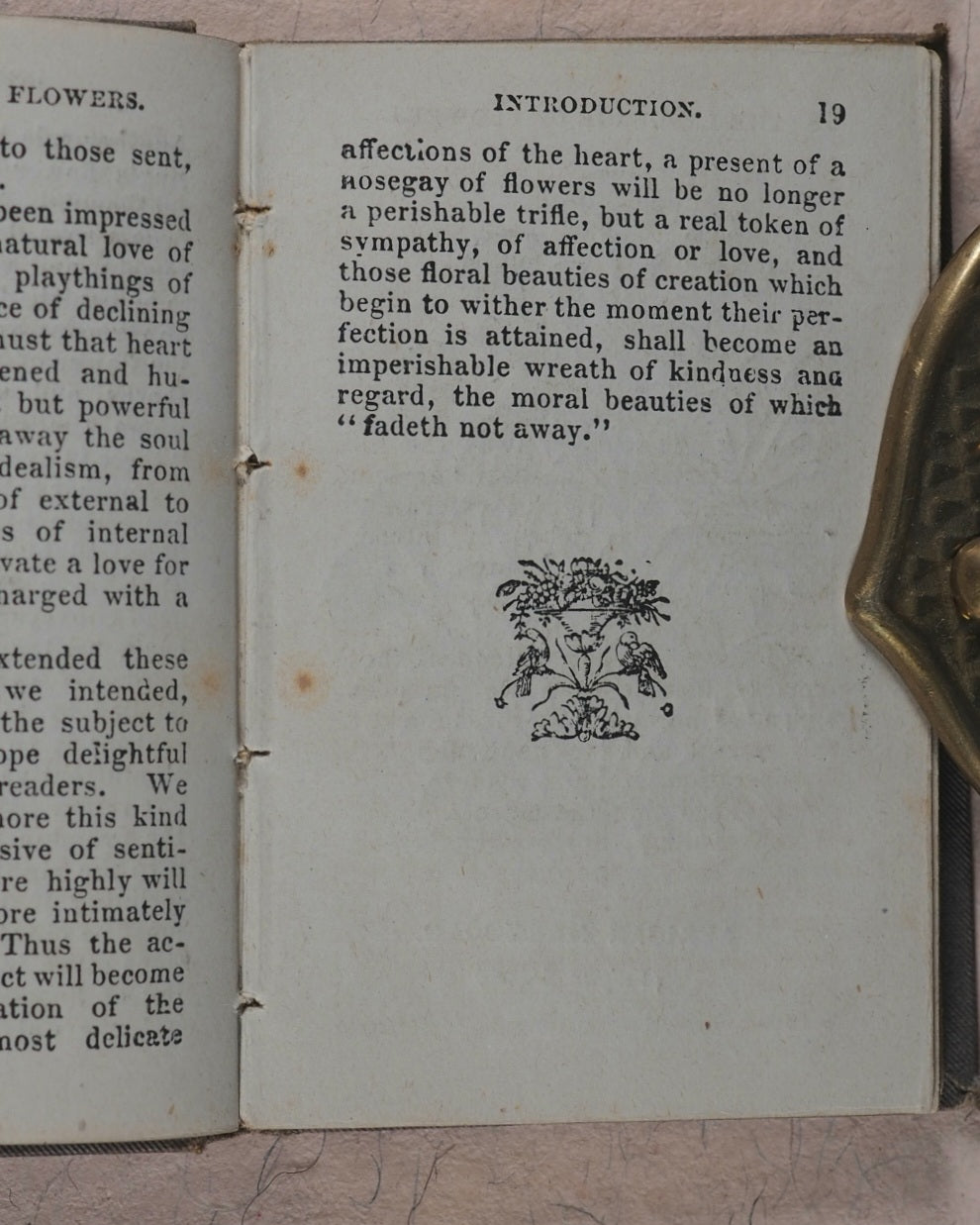 Welsh suggests a date of 1848 (but has no other details, no publisher, no identified copy &c.). 128 printed pages. 4 full-page woodcut illustrations. Woodcut vignette tailpieces. During the Victorian age, the use of flowers as a means of covert communication, associating flowers with symbolic definitions, coincided with a growing interest in botany. The floriography craze was introduced to Europe by the Englishwoman Mary Wortley Montagu (1689–1762), who brought it to England in 1717. Very slight age-toning.   Original pale yellow endpapers. All edges gilt. 62 x 92 mm. Original grey cloth with title in block italics on spine. Black publisher's emblem stamped on back cover within black ruled borders. Chromolithographed cut-out of Lily of the Valley pasted to front cover in black arched frame, within embossed black elaborate borders and decorations, with series title and book title embossed in reverse gilt. Slightly worn at edges, corners and hinges.    Not in Bondy, nor Spielmann. Welsh, 5049 (?). No OCLC number. WorldCat locates zero copies worldwide.