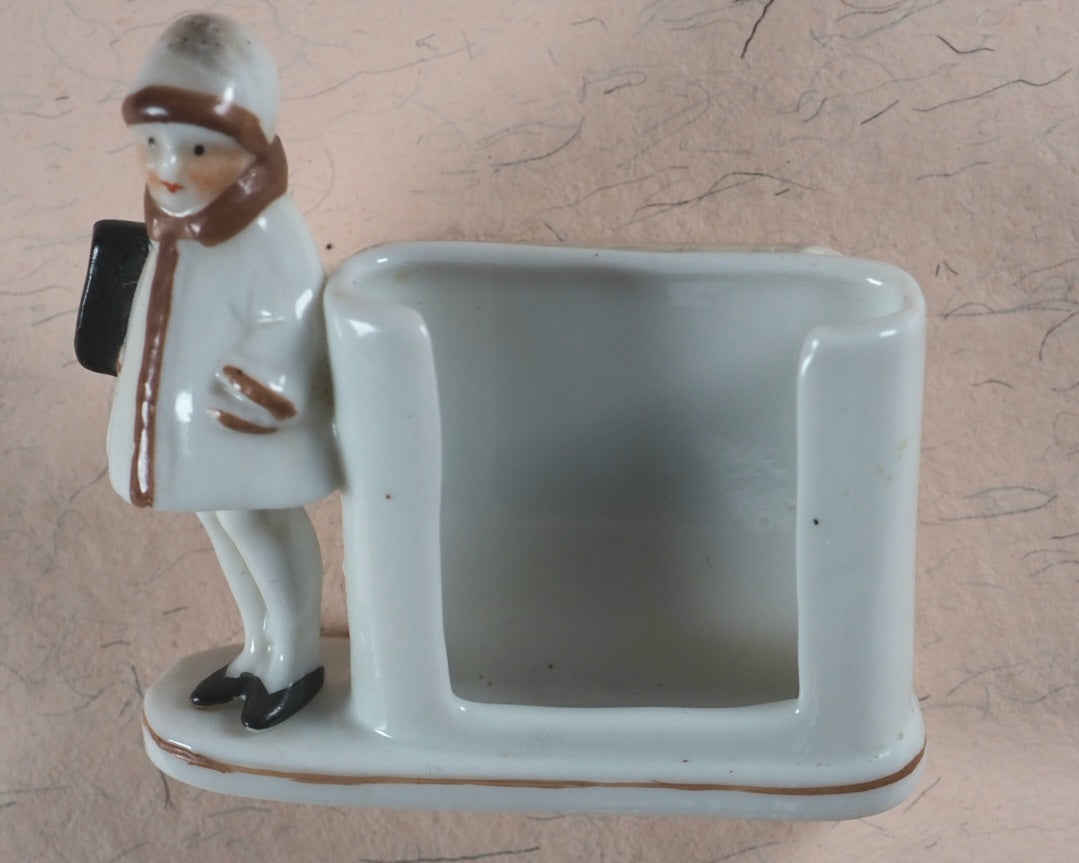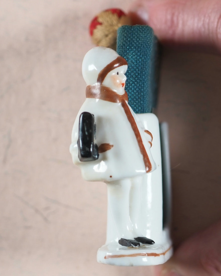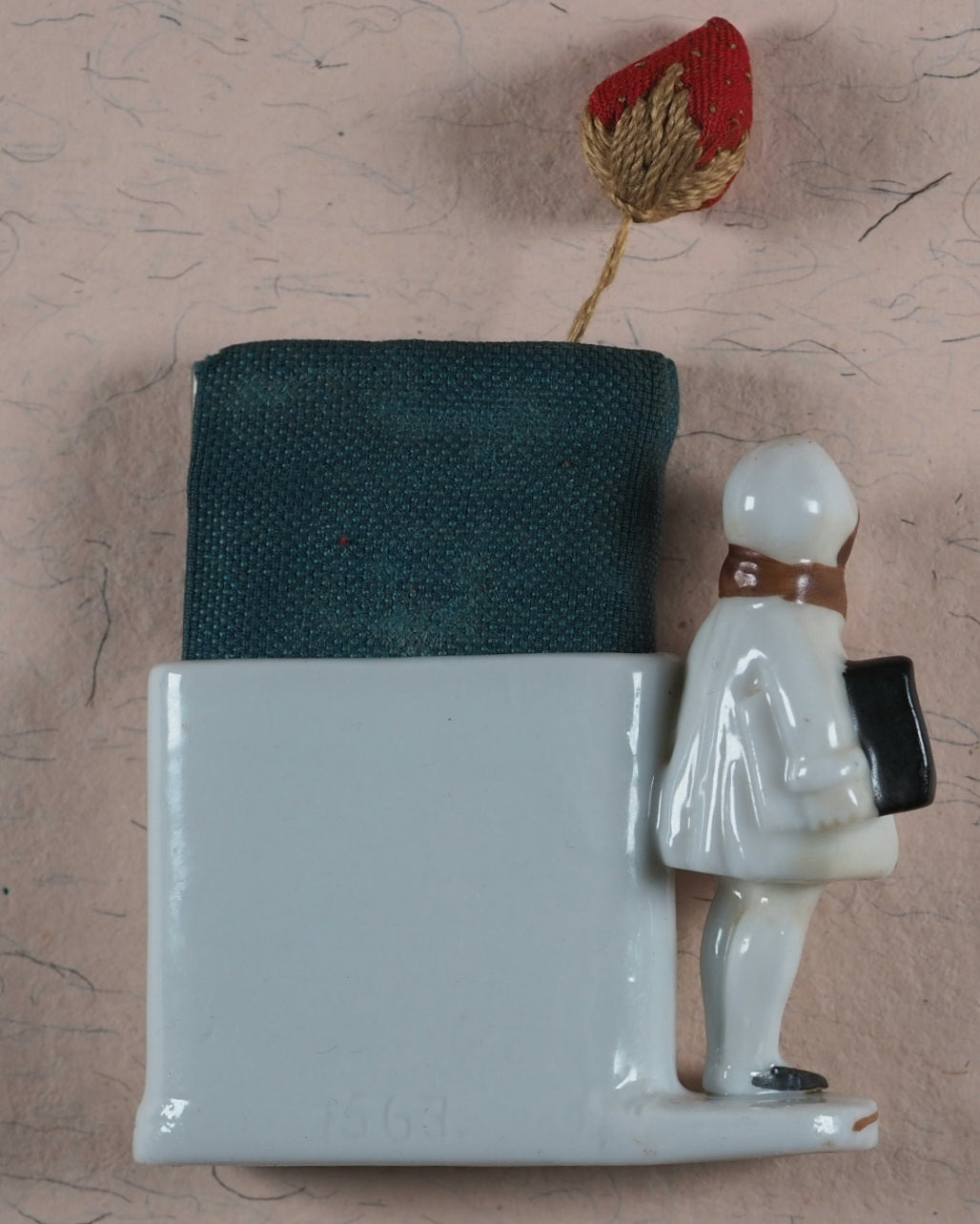 Red wool and hessian folding needlecase shaped in the form of a miniature book, or 'blook'. A hand-embroidered red and yellow miniature strwberry in silk and cotton is attached. Front paste-down is the original bevel-edged pocket mirror. 40 x 70 mm. Original turquoise cloth with silvered metal corner mounts and central Circlet of the Order of the Garter, which all knights and dames of the order are entitled to use in their crests - but this example is without any Latin motto. Front cover slightly rubbed. Mirror has a few minuscule spots. Needlecase has a very small hole near the bottom. The 'blook' holder is made of a hand-painted white-glazed porcelain. Made circa 1914. It has the model number '7567' on the rear. It depicts a rosy-cheeked, red-lipped, young girl - wearing a matching hat, tights, and black shoes - with one hand in her fur-trimmed coat and the other clutching a large book.