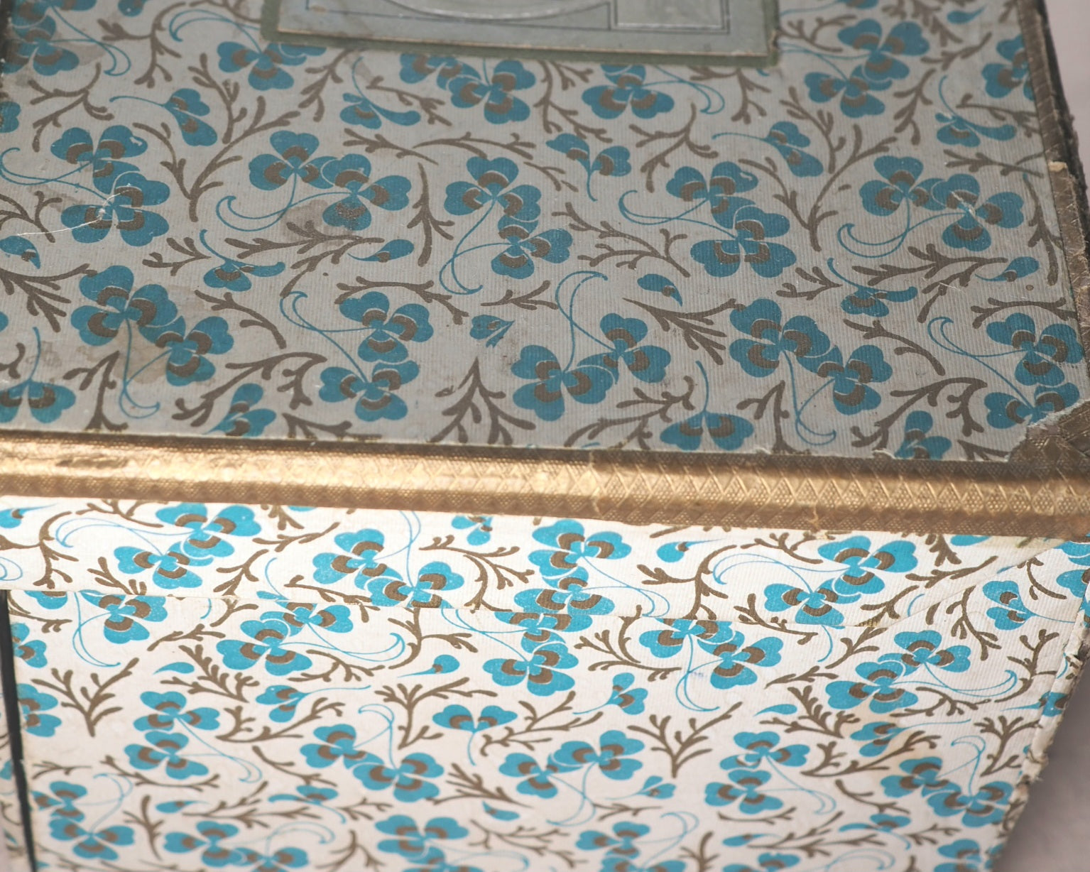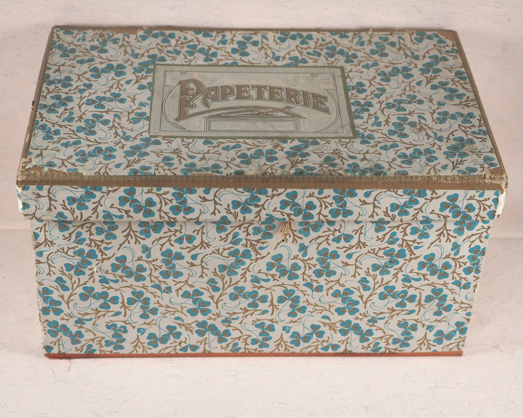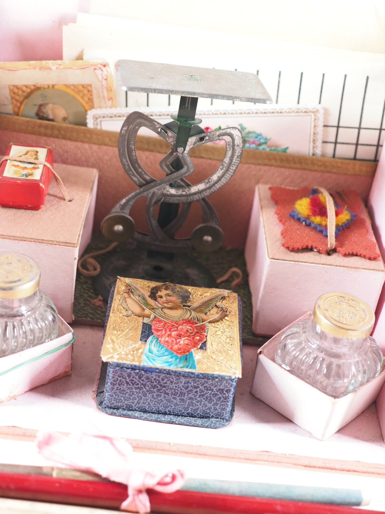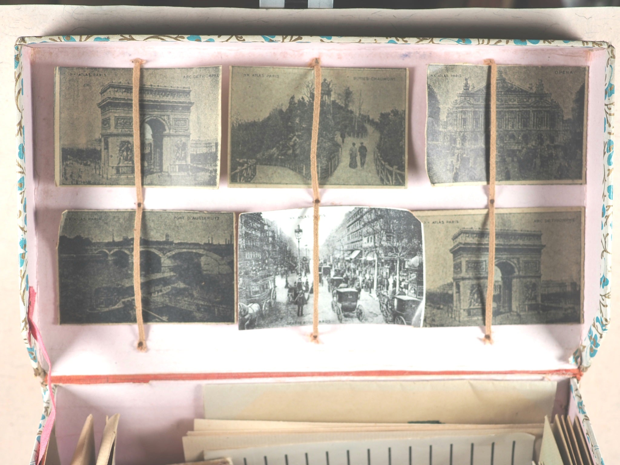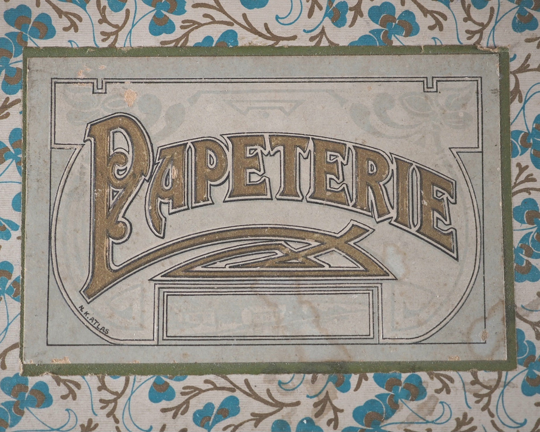 Original folding presentation box in with blue and gold clover design. Art Nouveau paper label "PAPETERIE" on top. All six original miniature postcards of Paris still present and also marked 'N.K. Atlas Paris'. In the centre is a storage box of Dresden gold paper decorated with an angel, containing small writing implements. The interior is in antique French old pink colour and equipped with compartments and decorated with small lithographs. It appears predominantly complete with the original pieces: tin set of postal scales; metal miniature bowl; 2 glass inkwells with metal stoppers; blue cardboard ink blotter; paper, notepad, and envelopes; contemporary ink hand-written letters; spare unused dip pen nibs in cardboard box with original chromolitho image pasted on the lid; wooden stamp with capital letter 'A' for the original owner, Alice; cloth pen wipe; boxwood centimetre ruler with brass handle; small old eraser; old dip pen and two old pencils. Dimensions of box: 14 cm. high; 25 cm. wide; 16 cm. deep. N. K. Atlas moved in 1904 to 23 rue Atlas in the 19th district of Paris, and until 1924 manufactured wooden games and toys, tableware and cardboard, board games mostly with very lithographed illustrations: examples include miniature globes, lotto, puzzles, fishing games, magnetic games, construction games, play sets (including a toy school room). The company was named from the founders Leon Nicolas and Charles Keller, and from the street where the company was headquartered. NK Atlas was bought in 1925 by G. Bonnet. Nicolas was a representative of the Simonin-Cuny house, Keller, originally from Munich, had settled in France at the end of the 19th century. The business started in 1904, the same year that RT (Revenaz and Tabernat) and JJF (French toy games) started - resulting in a concentration of similar French educational toy and games activities manufacturing companies.